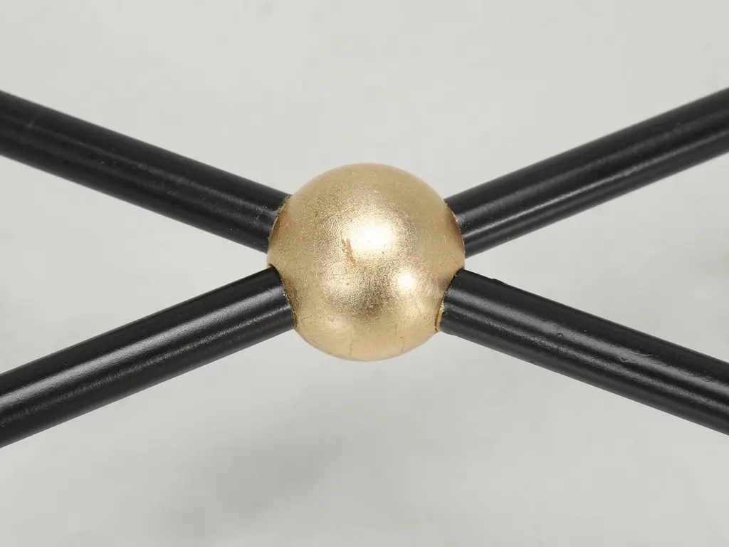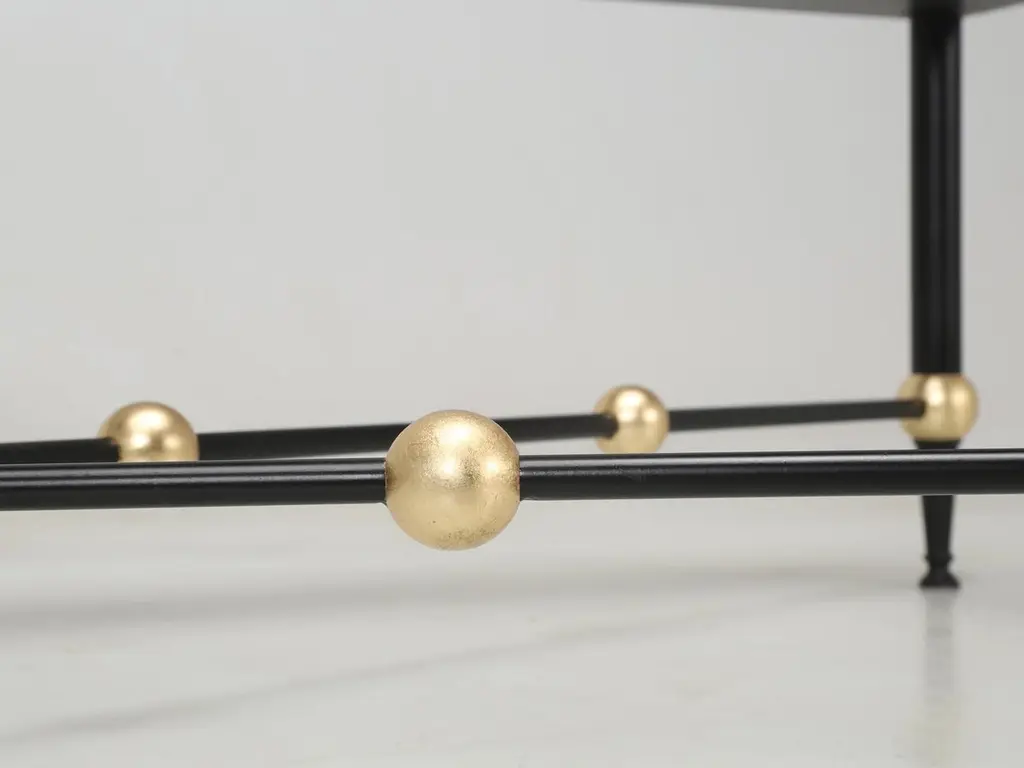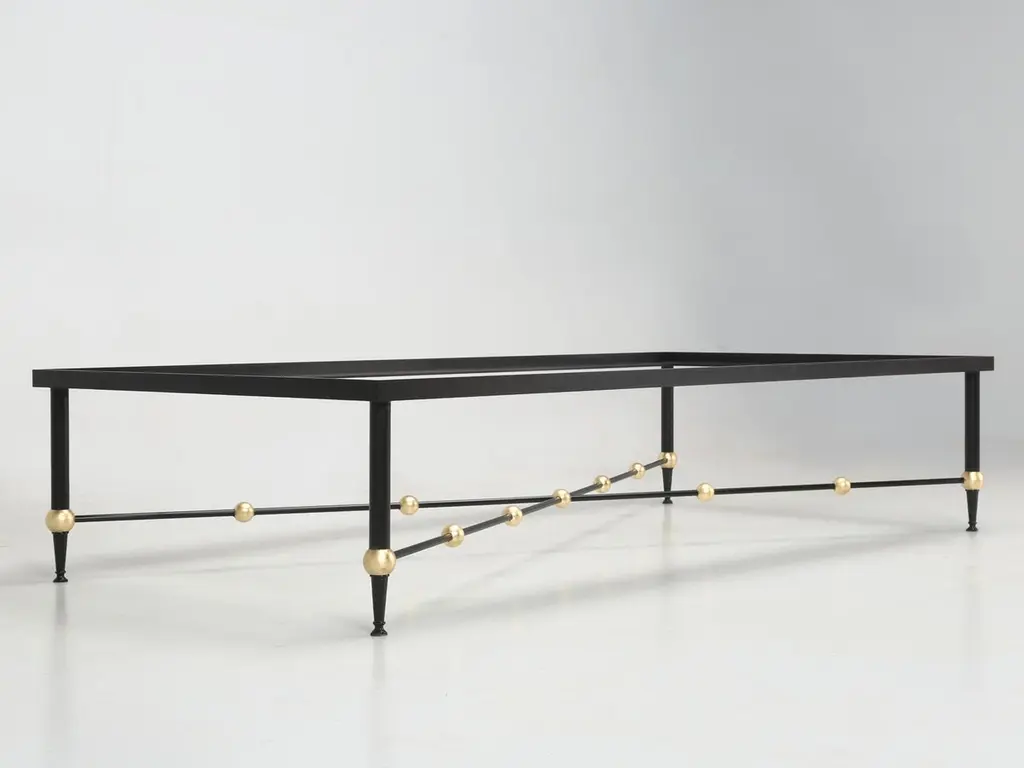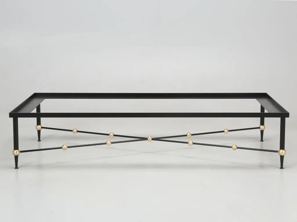 René Prou 1889–1947 Inspired Custom Hand-Made Steel Coffee Table with Gilded Spheres made to order by Old Plank in Chicago and available in virtually any dimension or finish. Rene Prou Finished his training as a decorator from the École Bernard-Palissy in Paris. René Prou would become the workshop director for the interior decoration company Maison Gouffé. In 1921 René Proudesigned his first ocean liner decoration commission for the Paris; followed by the Île-de-France in 1927, the Atlantique in 1931 and the Normandie in 1935. By1928 he succeeded Paul Follot as head of the Ateliers Pomone, the Bon Marchédepartment store workshop. In the 1930s René Prou designed the dining room for the Waldorf Astoria in New York City. When exactly he designed this CoffeeTable is difficult to determine, but the classic René Prou design has never gone out of style.