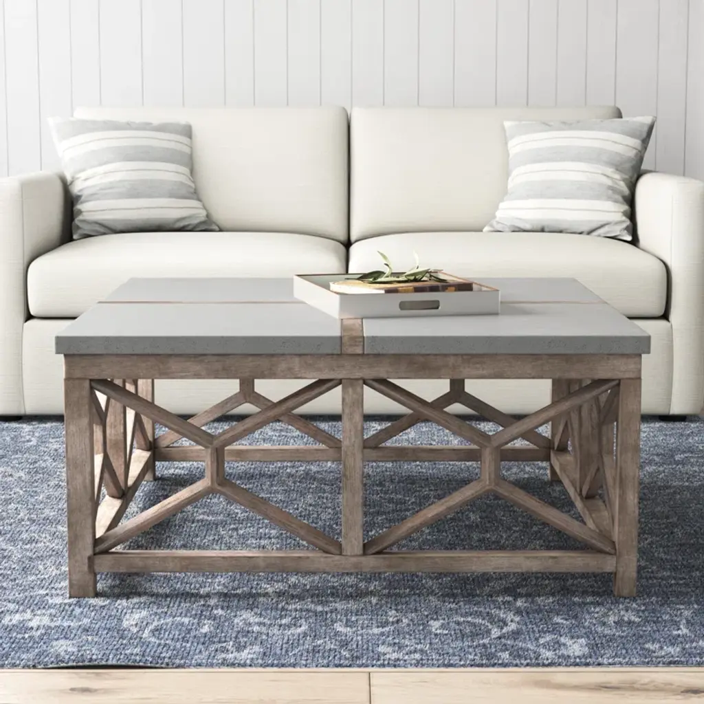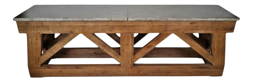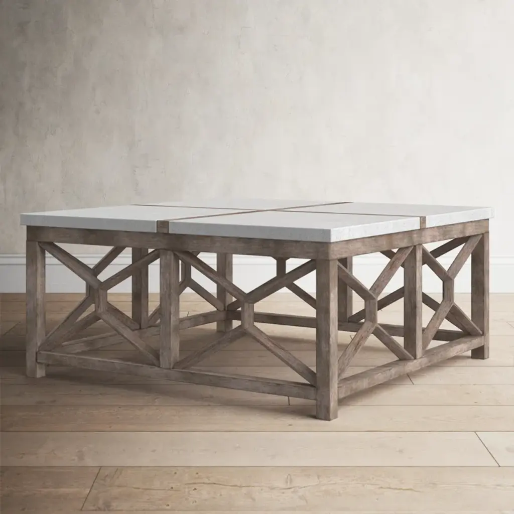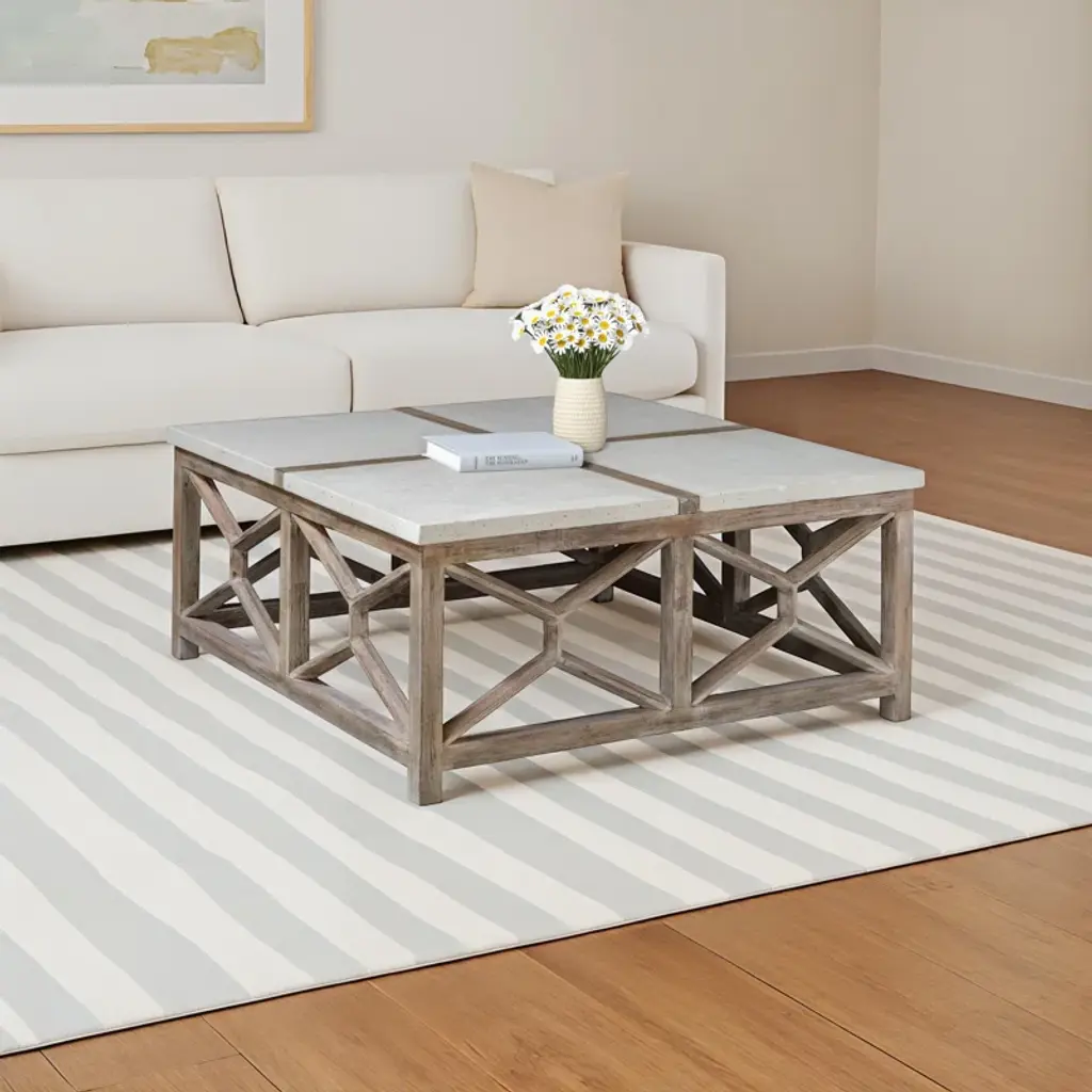 Handcrafted from solid mixed woods with a natural ivory limestone top, on a geometric base finished in a warm oatmeal wash. True to the characteristics of natural stone, each piece will have unique shading and graining.
