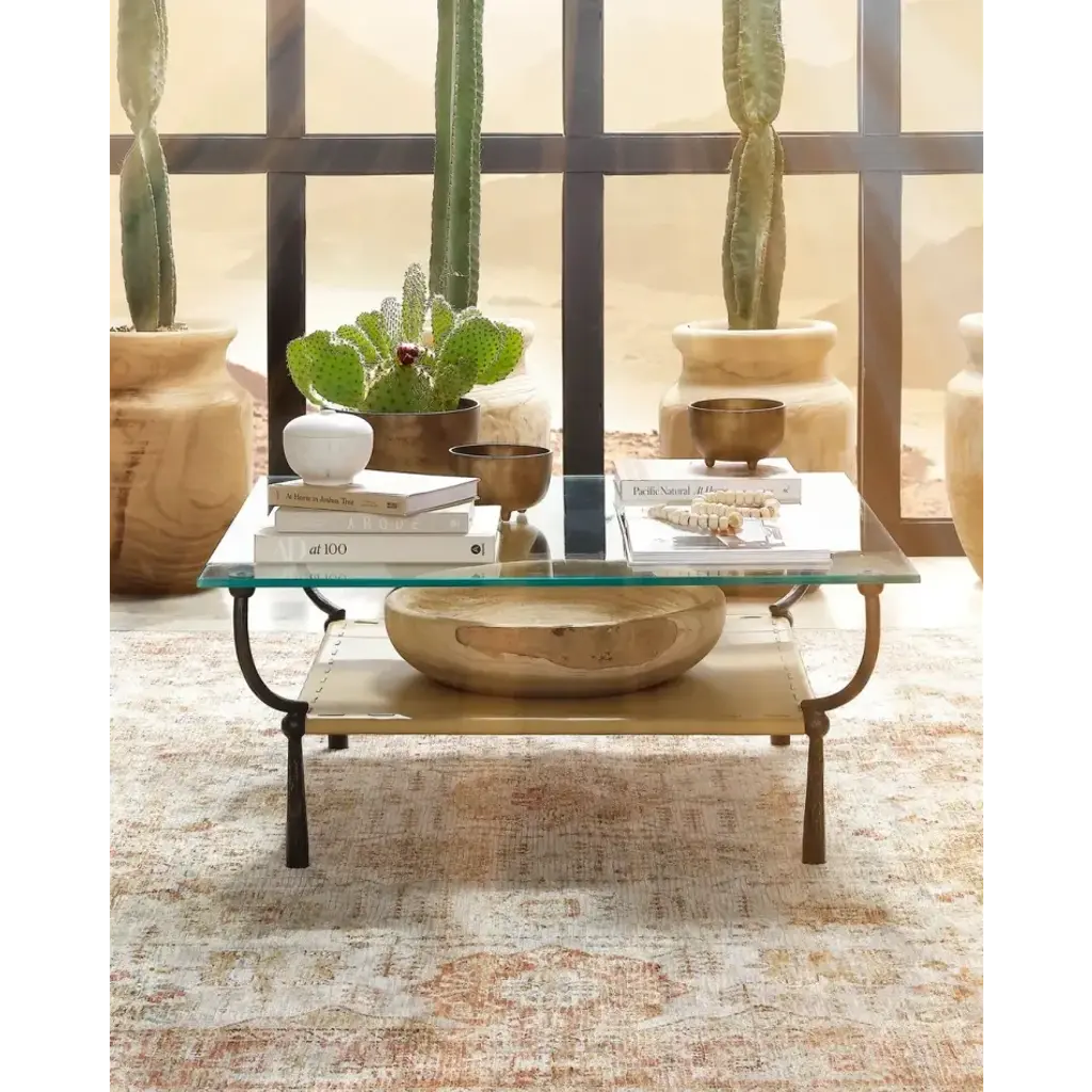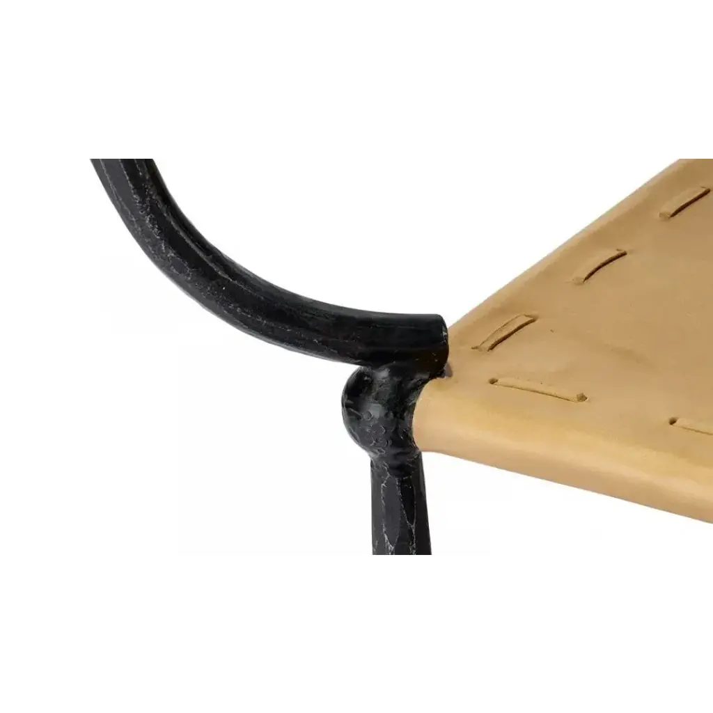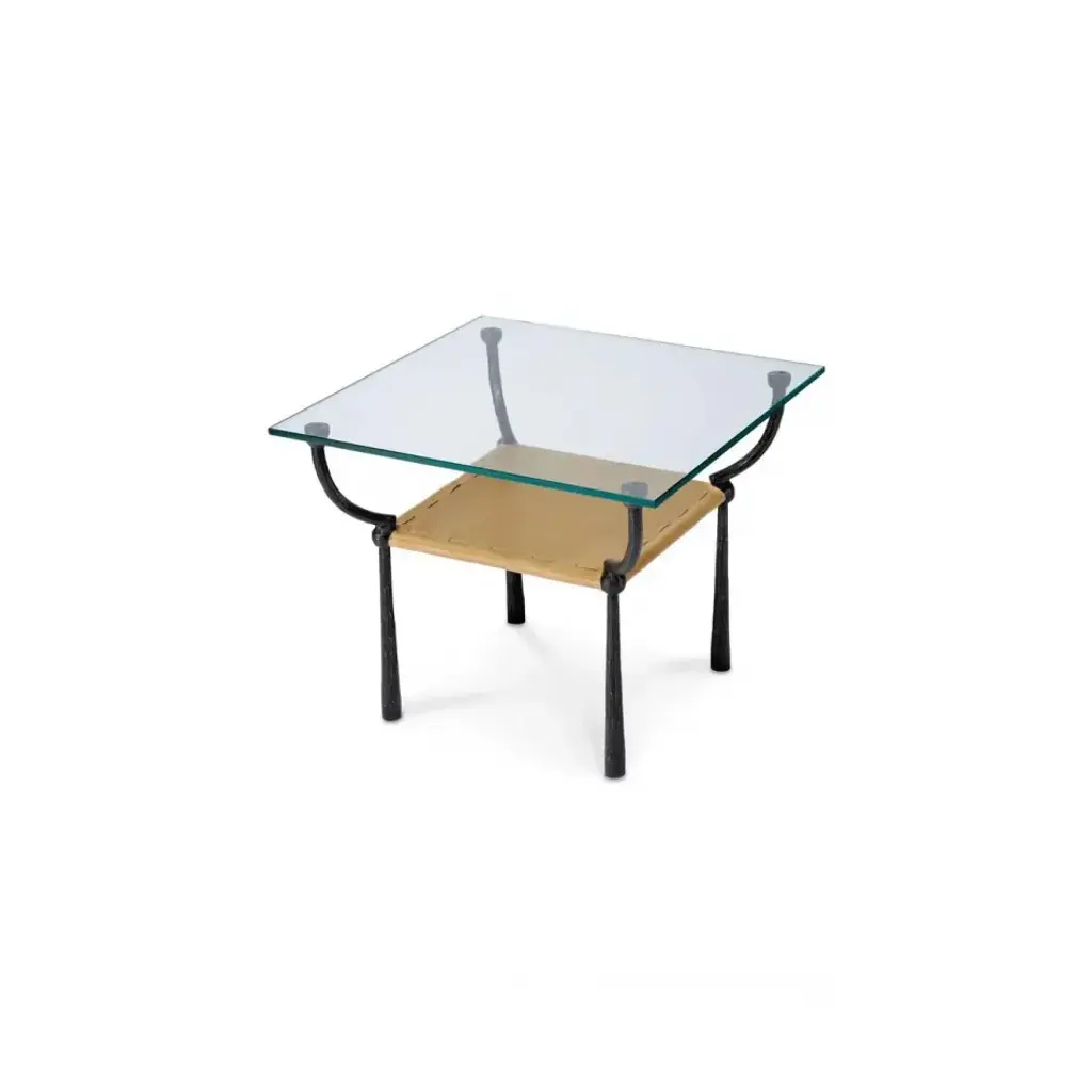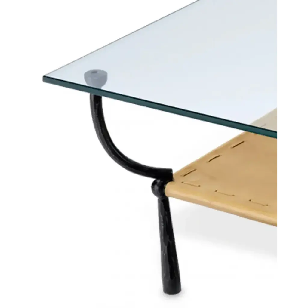 The focal point of this handsome accent table is the layer of rich, buttery camel leather. The softness of the leather contrasts superbly with the roughly hammered iron legs that anchor the piece. The legs rise up and then gently curl around to both cradles the leather and support the thick slab of strong glass that forms the table’s top. Finely crafted, this piece has a timeless look that never goes out of style.