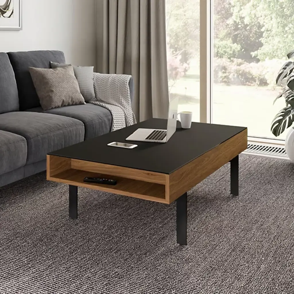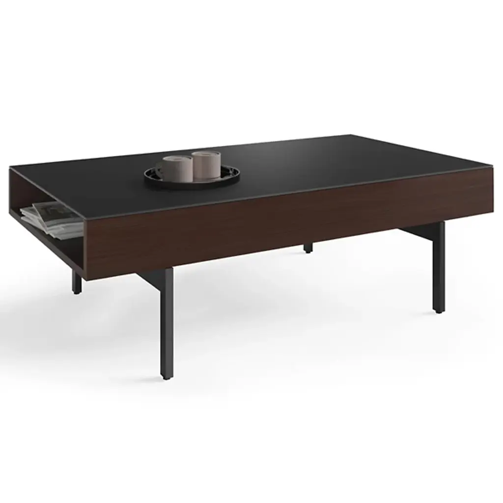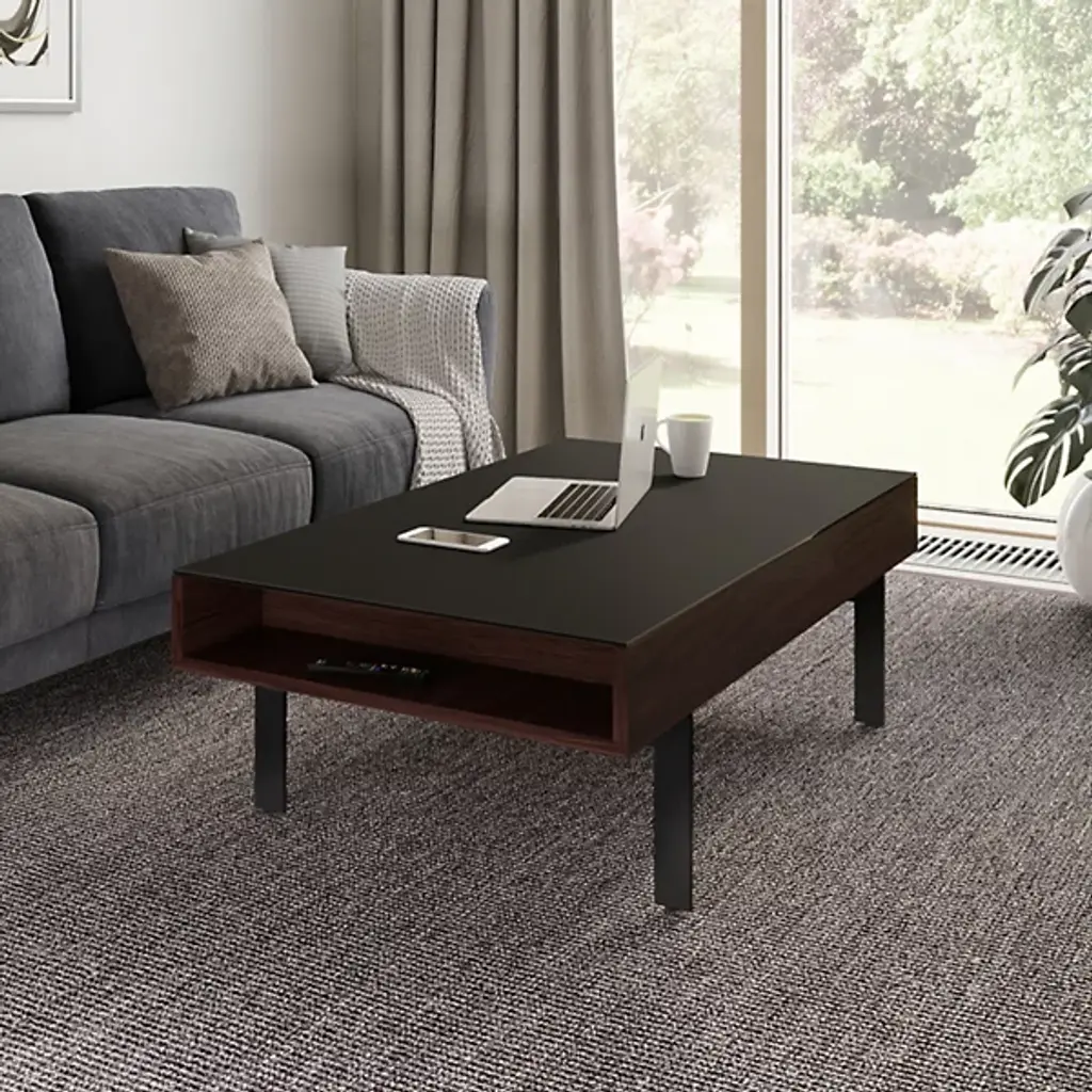 Add the missing link to your favorite space with the BDI Reveal Lift Coffee Table. This indoor lift coffee table takes the concept of traditional furniture and spins it on its head. Built with a beautiful soft-to-the-touch black stain-etched glass top and convenient lowered lined storage compartment, you'll never lose track of your entertainment essentials. The hydraulic supports allow for an effortless up and down movement, perfect for maximizing your productivity and entertainment time. Use this modern, ultra-versatile indoor coffee table to tie together the look of your living room or finished basement space.