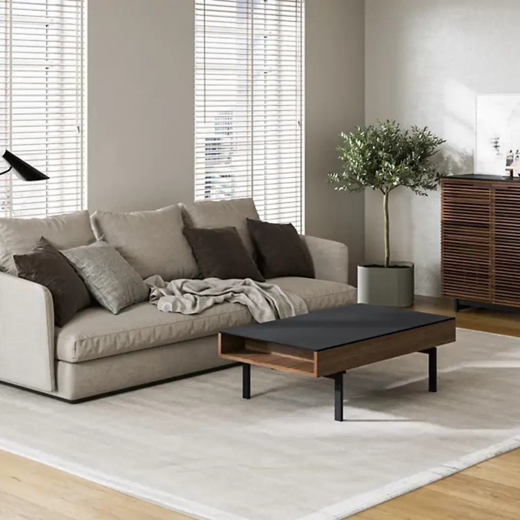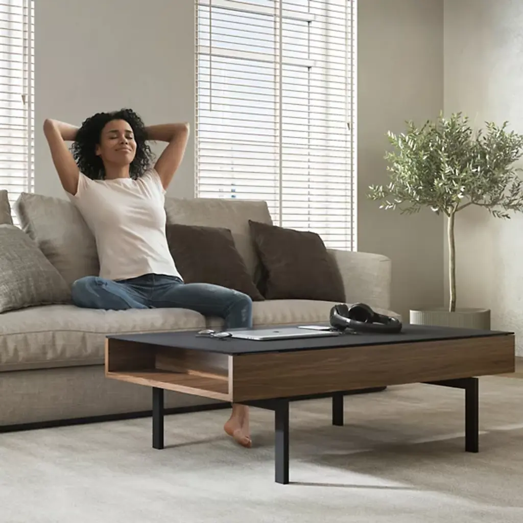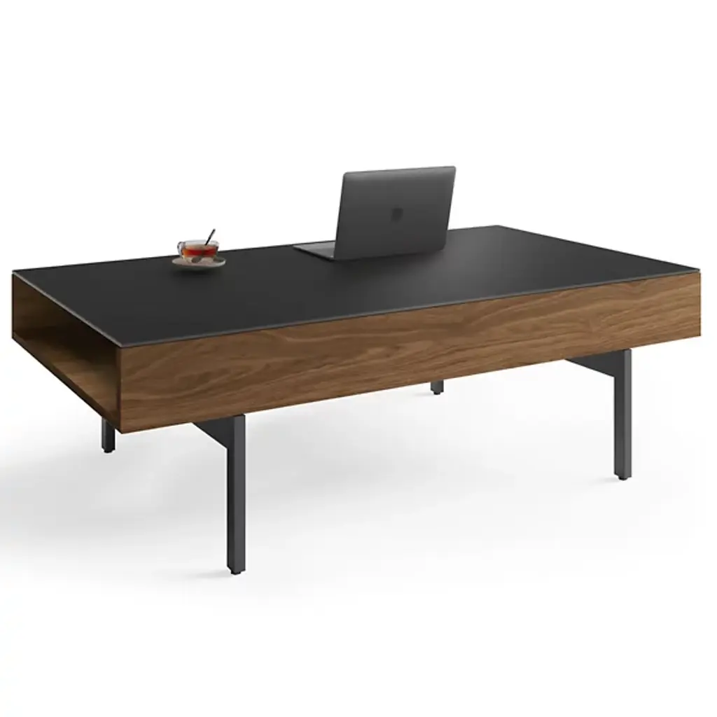 Add the missing link to your favorite space with the BDI Reveal Lift Coffee Table. This indoor lift coffee table takes the concept of traditional furniture and spins it on its head. Built with a beautiful soft-to-the-touch black stain-etched glass top and convenient lowered lined storage compartment, you'll never lose track of your entertainment essentials. The hydraulic supports allow for an effortless up and down movement, perfect for maximizing your productivity and entertainment time. Use this modern, ultra-versatile indoor coffee table to tie together the look of your living room or finished basement space.