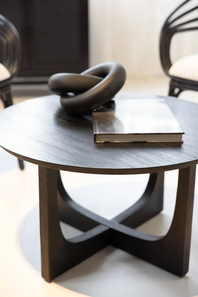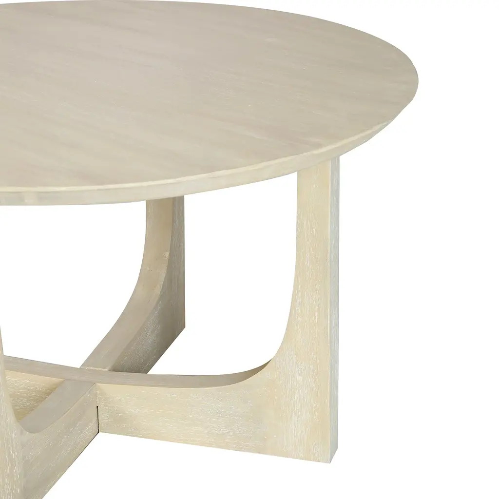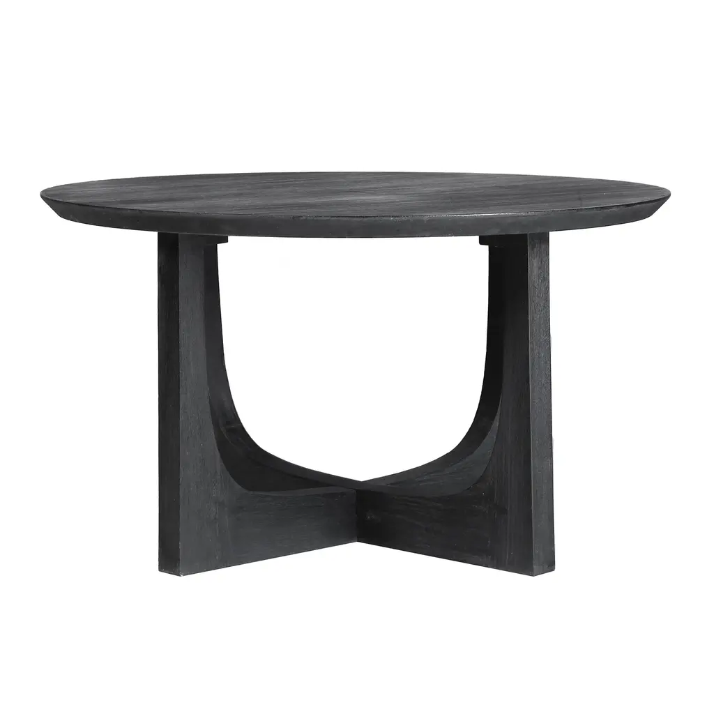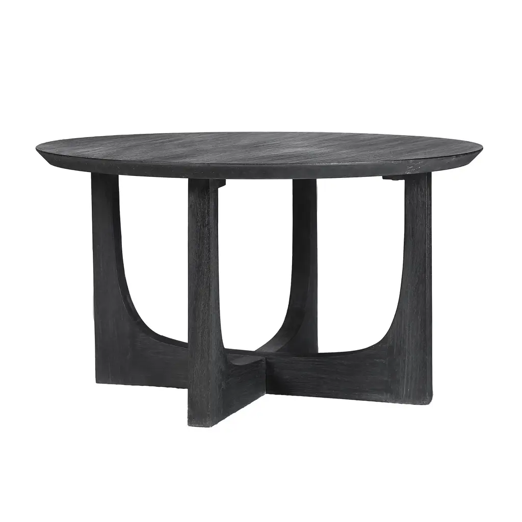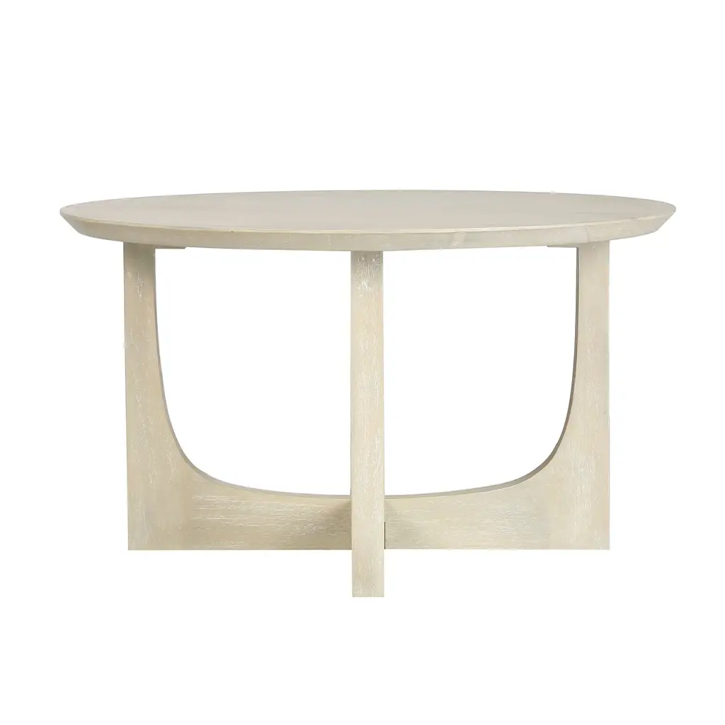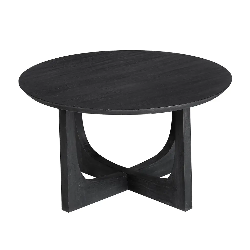The modern, reverse arch leg design gives this round coffee table a striking architectural silhouette. Crafted from sustainable, solid mango wood and handfinished with a wire-brushed texture to create an organic softness to contrast the minimal, clean lined shape. Available in two versatile colors: ivory or matte black, this table is the perfect balance of simplicity and bold, contemporary design.