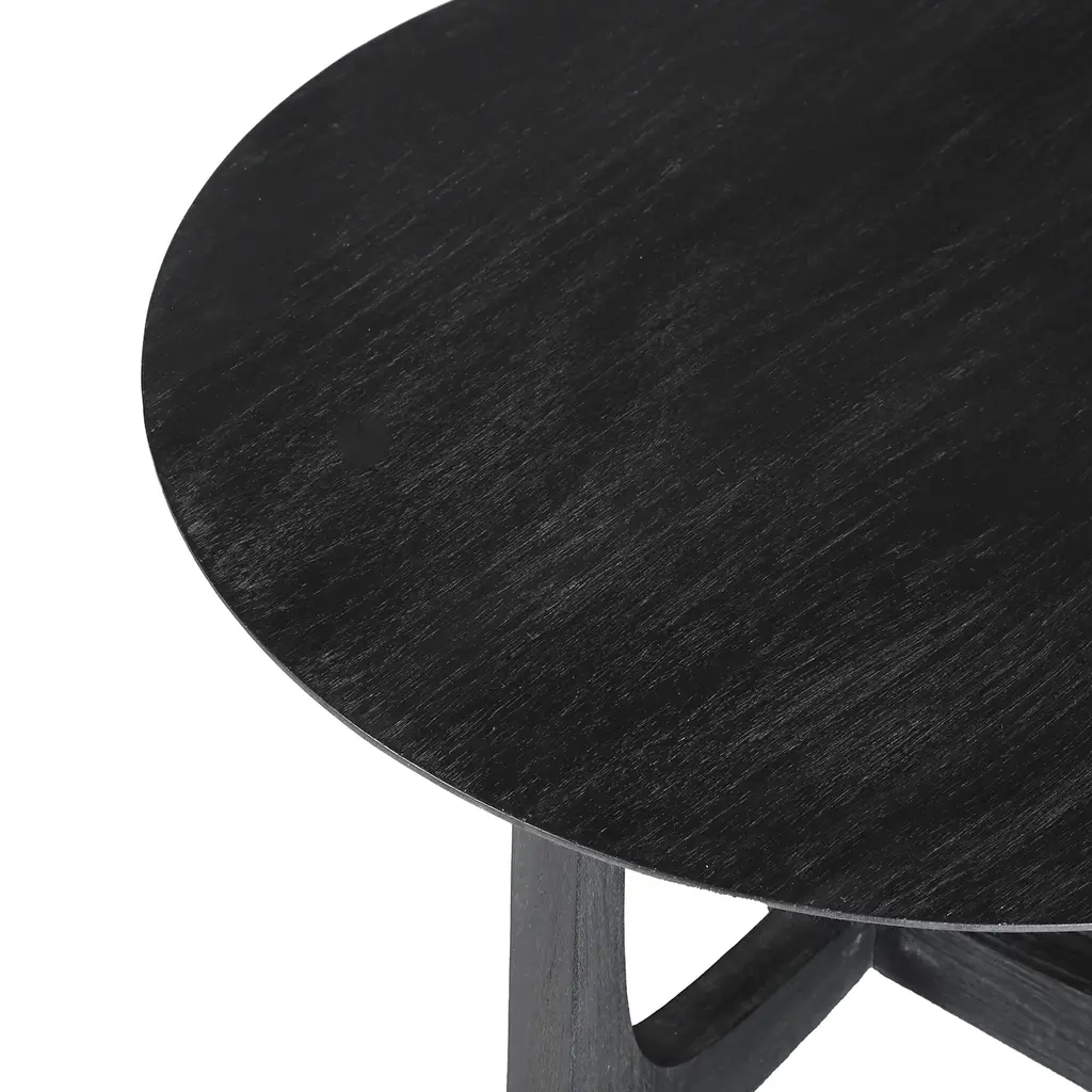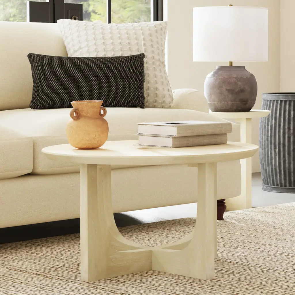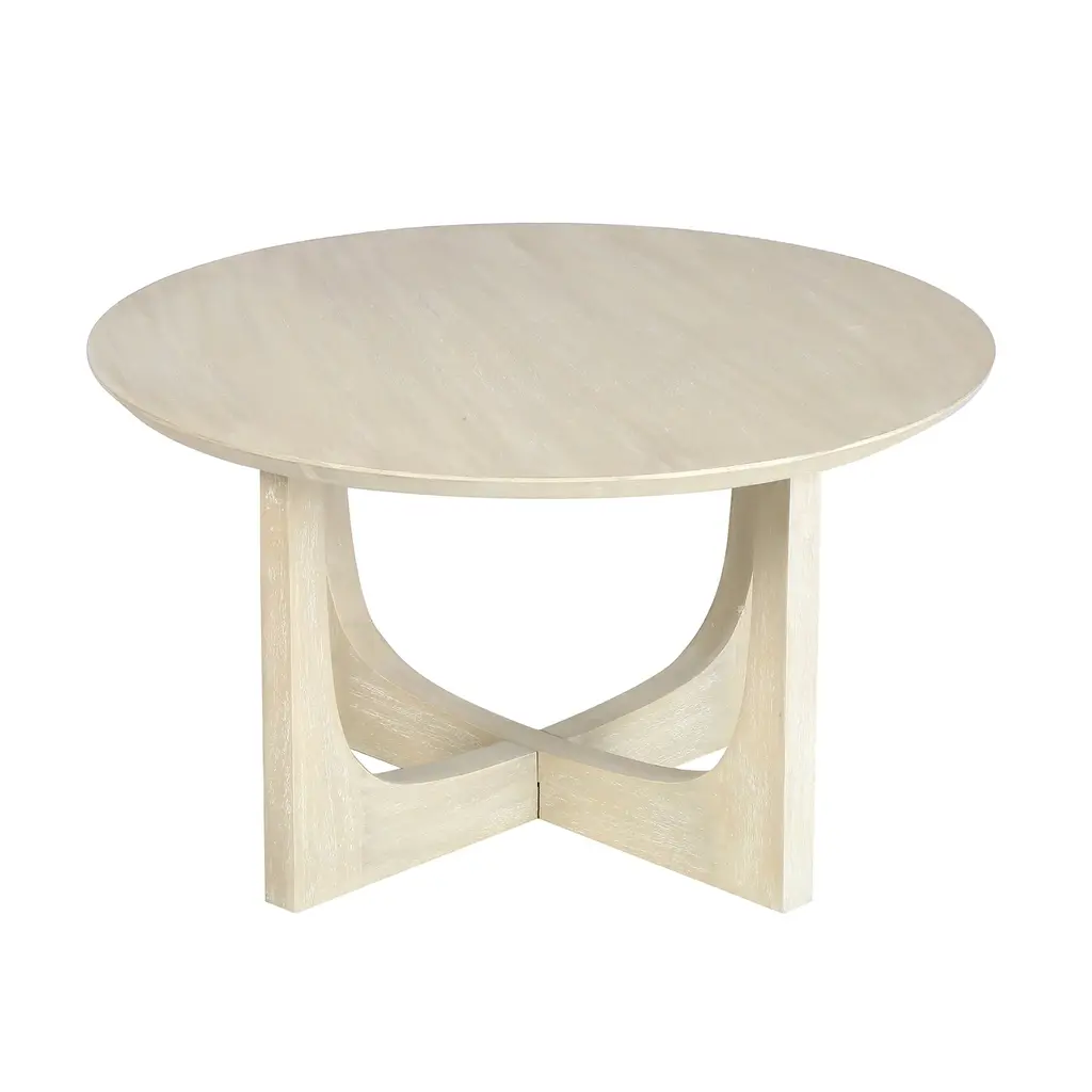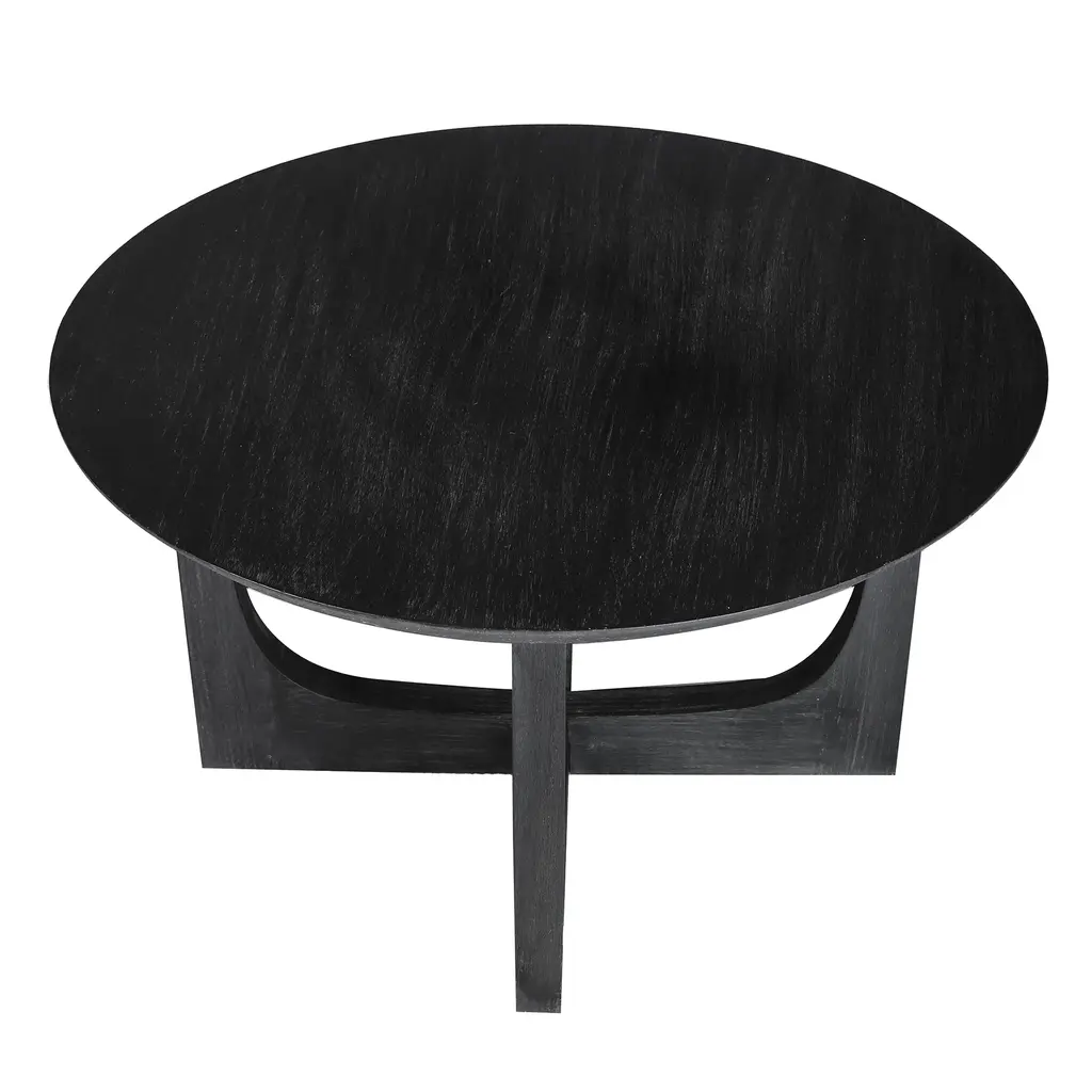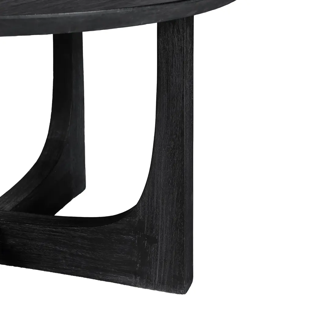 The modern, reverse arch leg design gives this round coffee table a striking architectural silhouette. Crafted from sustainable, solid mango wood and handfinished with a wire-brushed texture to create an organic softness to contrast the minimal, clean lined shape. Available in two versatile colors: ivory or matte black, this table is the perfect balance of simplicity and bold, contemporary design.