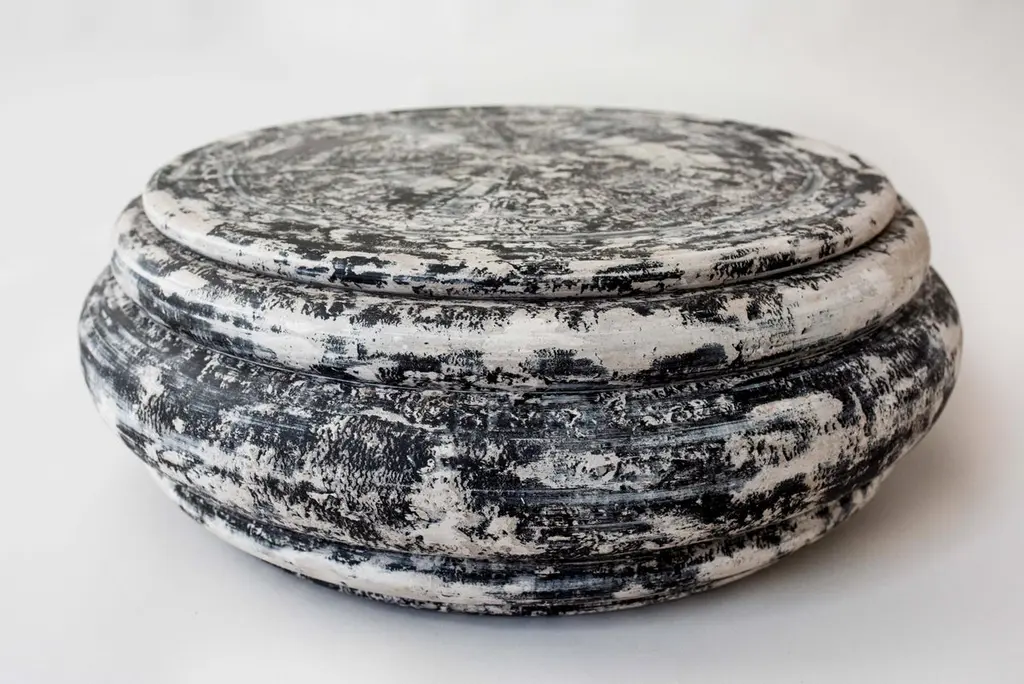 “Revolve” – No. 1 in Black (no. 01/03)This is made in a limited edition of only 3 pieces + 1 AP The three sculptural furniture pieces are made in three different colors, making them all truly one of a kind. You can buy this unique piece or request your favorite color under customization.The piece is made from plaster, fish glue, and pigments. It's waxed and weighs 40kg (88 lb).About Revolve:The starting point of this project is rooted in Flensted Mouritzen's interest in old stucco materials and moulding techniques. It has grown into a fascination with the two-dimensional line of the running mould technique being transformed through a specifically created turning machine into a three-dimensional object.Every piece begins with a line and through the building up of material, the three-dimensional manifestation of that line is created. The objects are simultaneously built and decorated through the process of their making. The process of building up the layers to create the form is emphasized by using different pigments in each layer of the stucco material, making their creation very present in the finished object. The resulting objects are contemporary 21st-century design pieces that balance function and sculpture.