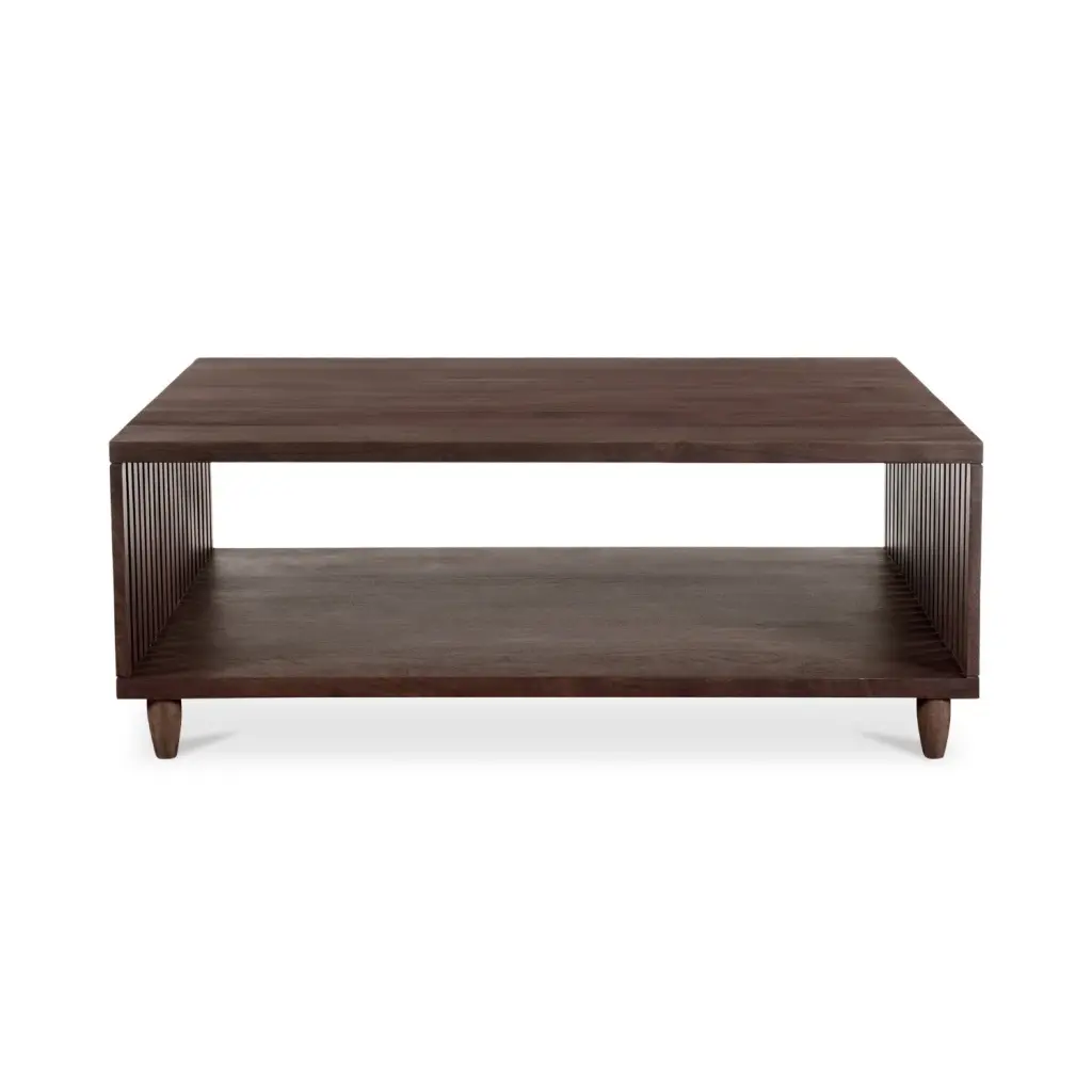 Mid-Century Modern-inspired, the Rhys coffee table features a slatted wood design in which no soft edges exist, a design detail contrary to most furniture with slatted details -- a purposeful exploration by the designer. Made of solid Acacia and finished in a warm brown tone, the collection feels grounded and comforting as the slat detail provides an air of openness and invitation.