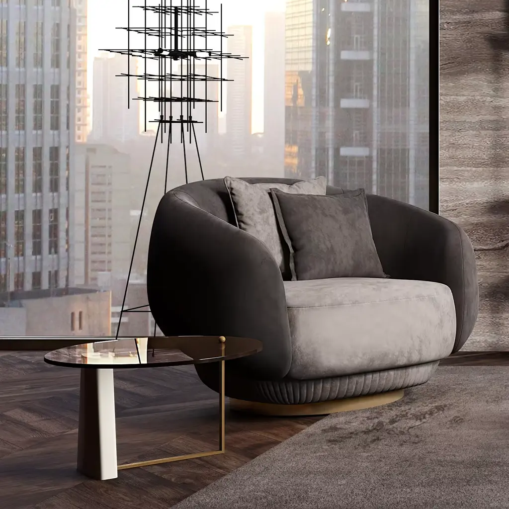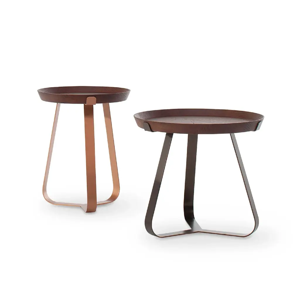 An exercise in contrasts and balances given by the brilliant juxtaposition of different materials and textures, this stunning set of two coffee tables will add a luxe accent to a contemporary interior. Defined by a minimalist, clean-lined style, both pieces feature a sturdy wooden leg and a flat-bar, L-shaped metal leg, supporting a round bronzed glass top. Please consult the Concierge for customizations and finishing options.
