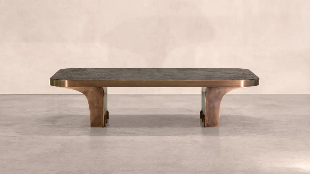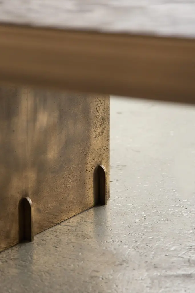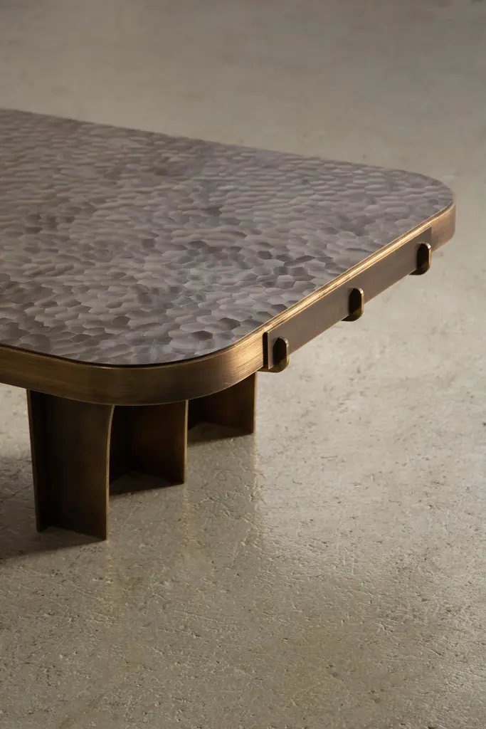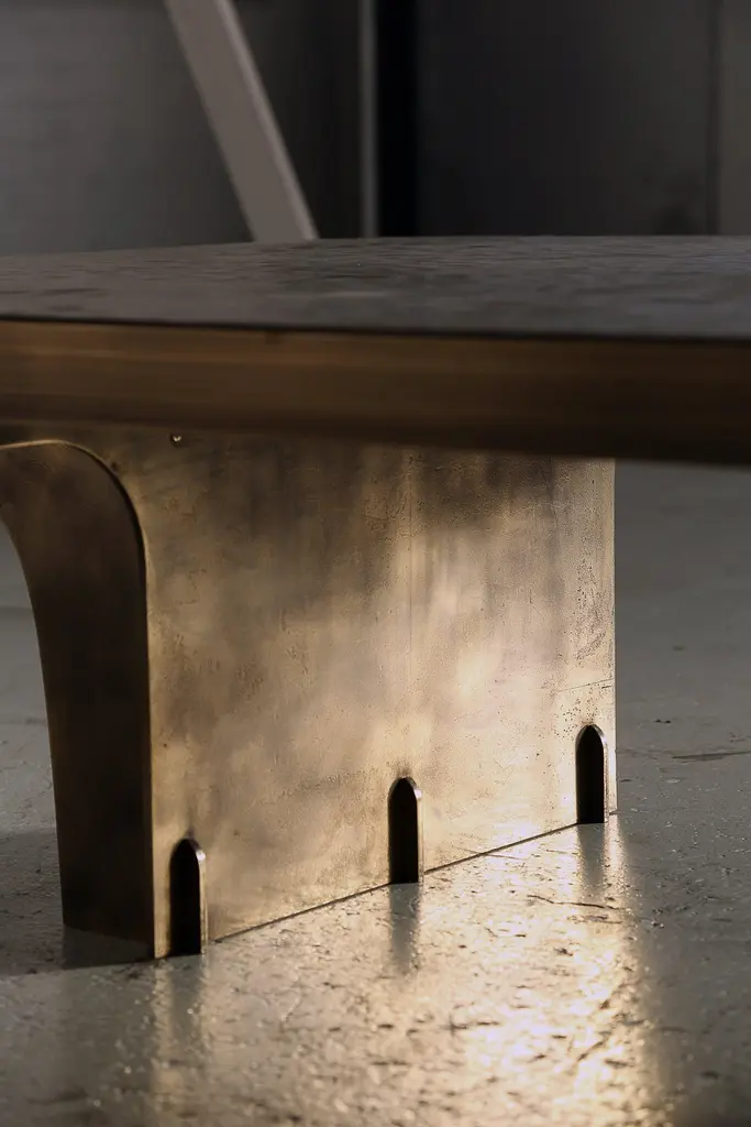 Inspired by the ship building heritage of North-East England, the Rib Coffee Table plays on the skeleton of ribs, gussets and intersections used to create the strength and rigidity needed to support such enormous vessels at sea. A design to shine a light on the craftsmanship cloaked behind the streamlined steel of a ships hull.Hand crafted in the North to order.Images above shows a patinated sculpted brass finish.Measures: 190cm (W) x 39cm (H) x 162.5cm (L)Custom finishes and sizes available upon request. Made to order in 12 weeks.Price excludes VAT.