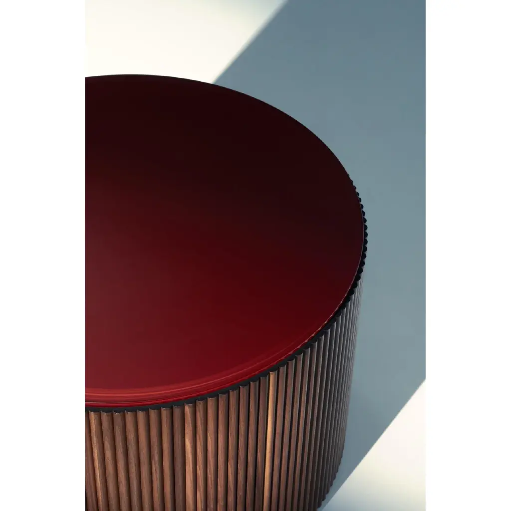 The Ribbed Wood Glass Coffee Table by Lema Drum is distinguished by its unique structure in ribbed wood, worked in solid walnut. Available both in the round and oval versions as in the square version with rounded corners, Drum is a playful game of function and form. The top of the coffee table can be customized with the top back painted glass, stone, or marble, in all the variants of the collection. From the namesake collection of coffee tables, the Drum pouf is born, with the same structure in wood, where a soft cushion upholstered in textile or leather is added.