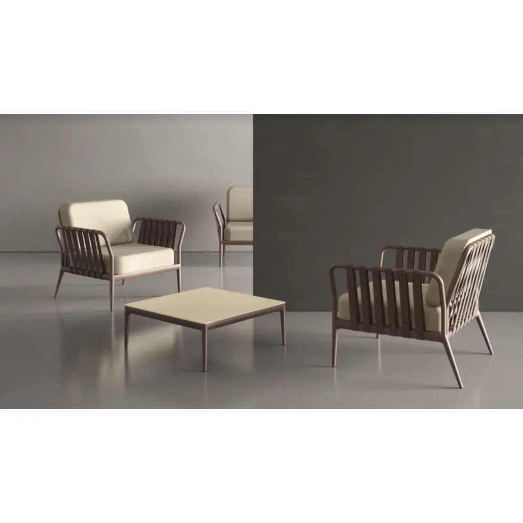 Ribbons Bronze 160 Coffee Table by MOWEE.Dimensions: D90 x W160 x H75 cmMaterial: Aluminum and HPL top.Weight: 21 kg.Also available in different colors and finishes. (HPL Black Edge or Neolith top).An unmistakable collection for its beauty and robustness. A tribute to the Valencian manufacturing tradition as a challenge to innovation, making it sustainable and durable. A collection with details that make it unique. We discover its most representative side, Ribbons. Engineering and tradition come together, thus achieving a collection with its own character.Möwee is part of the work, effort and commitment of Gaviota, a leading company in the outdoor sector. It was set up as an independent venture to broaden horizons in the outdoor furniture world, with its own distinctive character and way of doing things. Freshness, simplicity, quality and design are at the heart of its DNA.