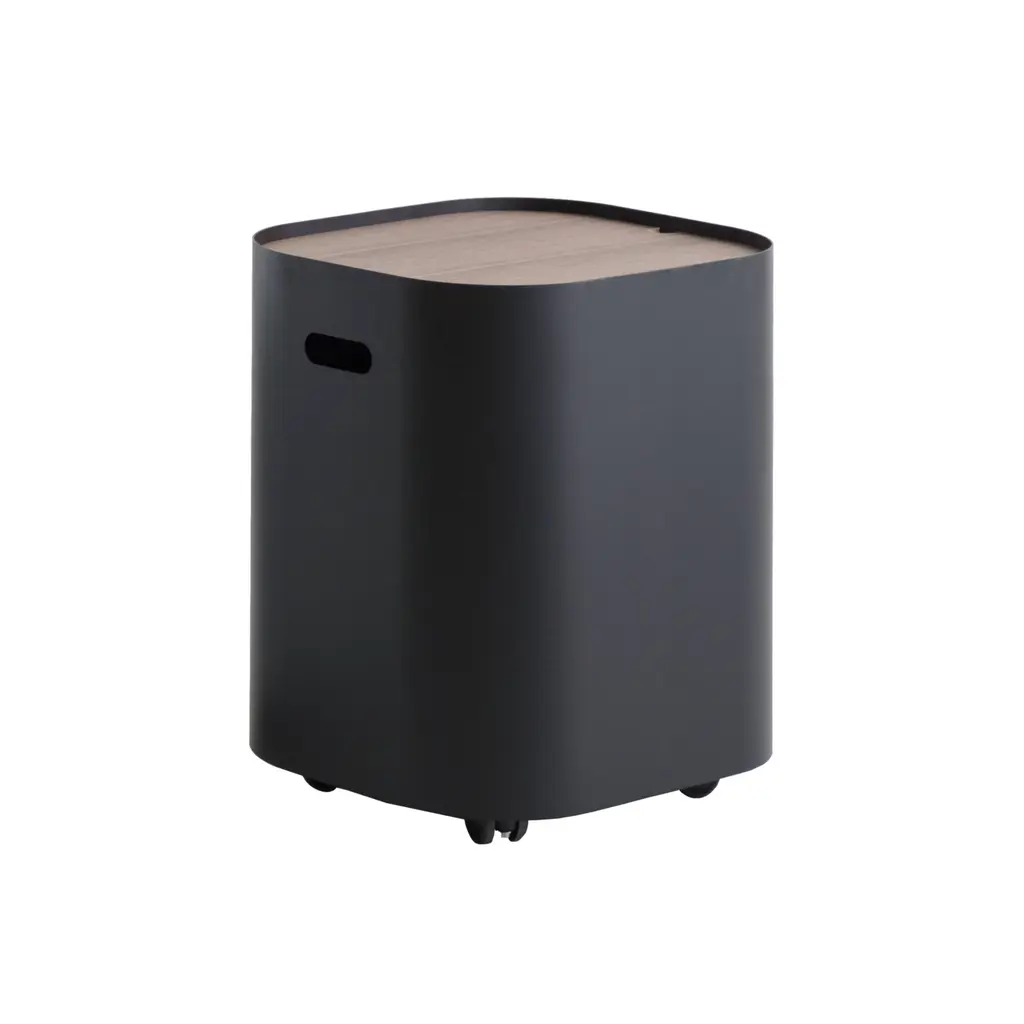 Ring - A container module which can be used on its own as a low table or stacked to line walls or create partitions that provide multiple storage capacity. Also available as a version on casters, Ring consists of a painted steel plate shell and two multi-layered oak shelves.