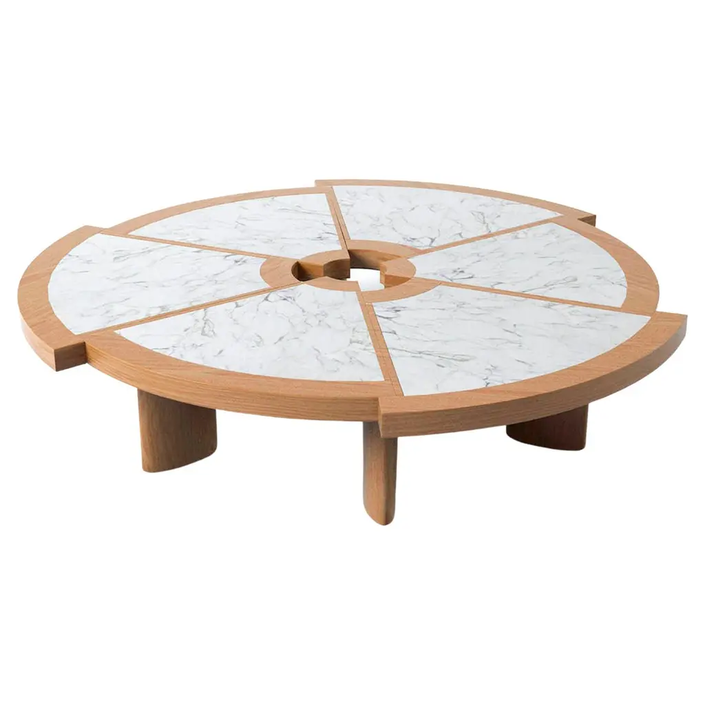 Currently available in just one size, the Rio low table was originally created by Charlotte Perriand as two. Between 1962, the year she designed the piece and 1967, Charlotte Perriand made a larger version intended for the Japanese embassy in Paris. The unusual beauty of the Rio table, matched by its functionality make it a veritable work of art. The six segments, made in solid wood, each with a different radius, offset from each other, create a jagged outer edge, while the hole in the centre evokes a centre of gravity. Cassina re-issued the original version in 1962, reproducing the original lines, thanks also to the extraordinary crafts skills of the artisans of Meda, a town in the Brianza area north of Milan.Top· White Carrara marble or black Marquiña marble. Low gloss finishing.· Solid Oak wood frame transparent matt finishing with hand-woven Rattan mesh cane.Base· Base and structure in solid oak wood. Natural matt finishing.· Outer contour in solid oak wood steam bending. Natural matt finishing.· Feet in adhesive felt pads.