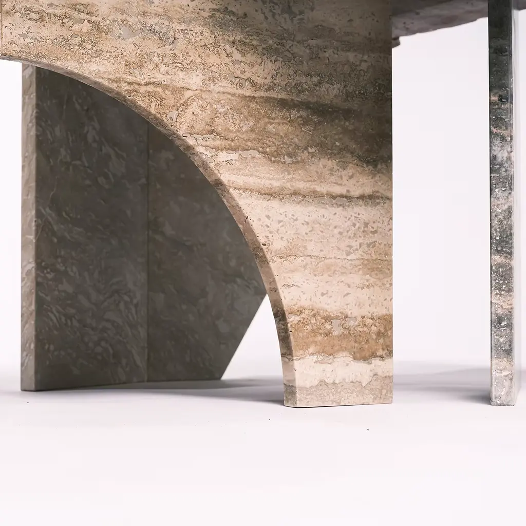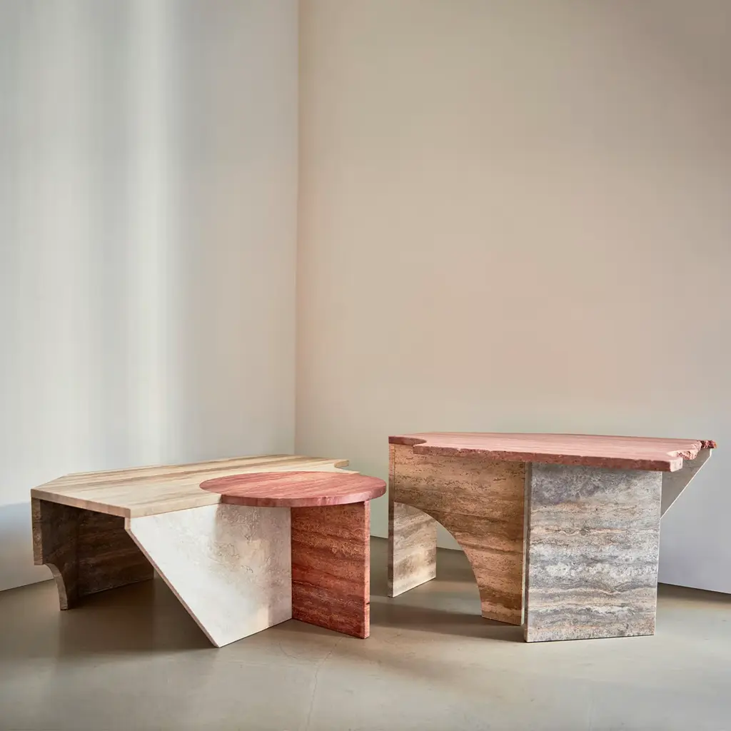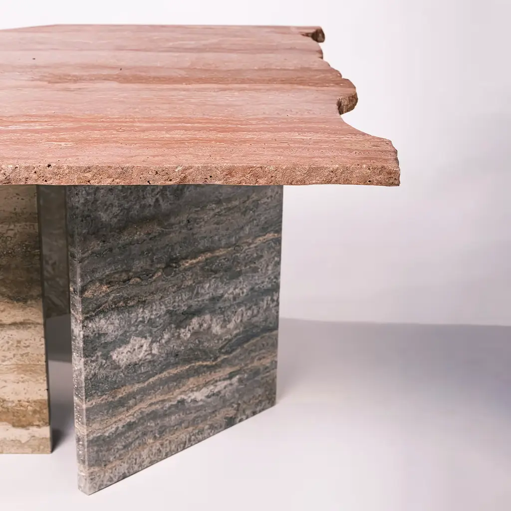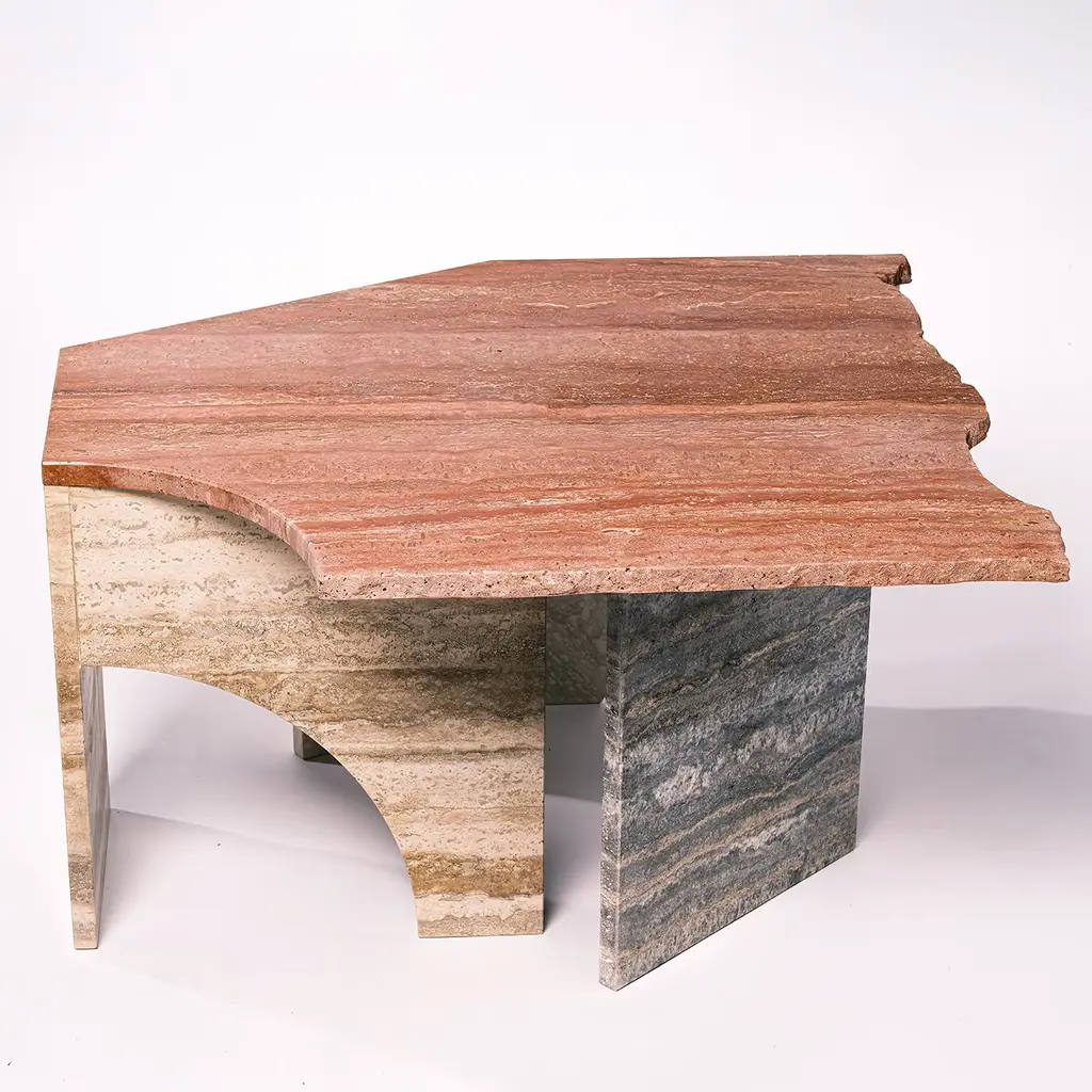 A playful cut-out concept that implies freedom defines this one-of-a-kind coffee table. Sustainable and eccentric, its silhouette combines leftovers of different travertines for a look that demands attention. A chaos that is here a synonym for art defines this singular piece. A different version can be found in the Artemest catalog. This item has been part of the exhibition MARMO on display at Artemest Galleria until May 2023.