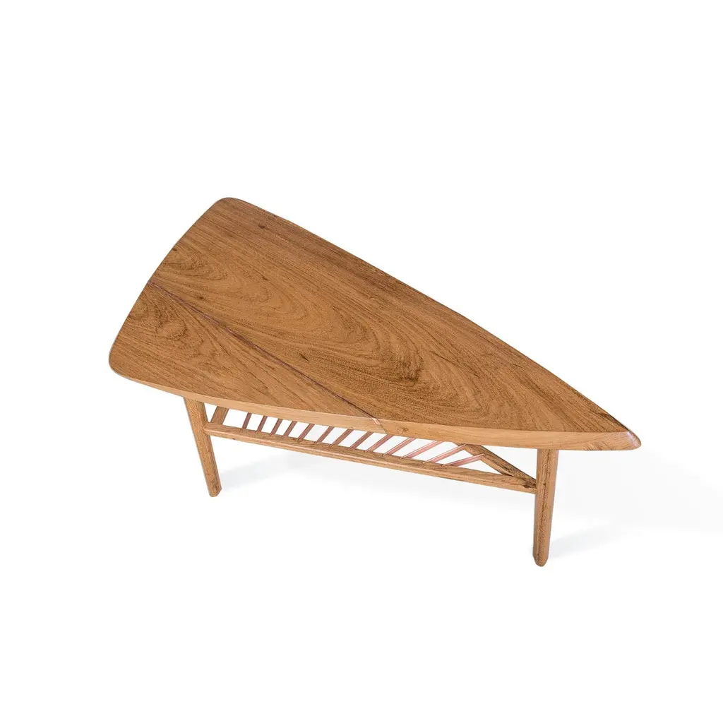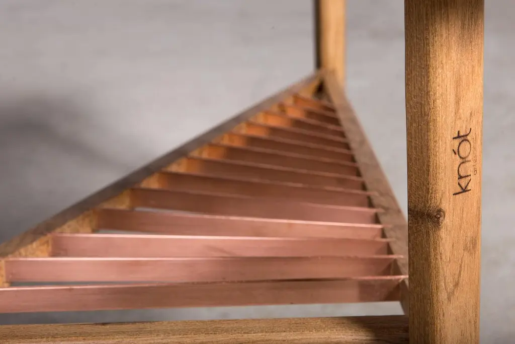 Minimalist yet full of subtle details, Riva is a combination of craftsmanship and creativity. Thoroughly modern though containing organic features seen both in the table top shape and the layout of the copper bars in the lower shelf, it is the coming together of both clean and natural forms. Of particular note is the curve of the top which passes between a positive and negative slope adding a feeling of movement lightness. Handmade from Brazilian Hardwood Freijó with details in copper.Knót Artesanal is a minimalist furniture studio composed of Brazilian architect Renata Gutierrez and Scottish woodworker James Rowland. Specialising in handmade pieces created using traditional techniques and a modern design from their base in Paraty on the tropical 'Green Coast' of Brazil.