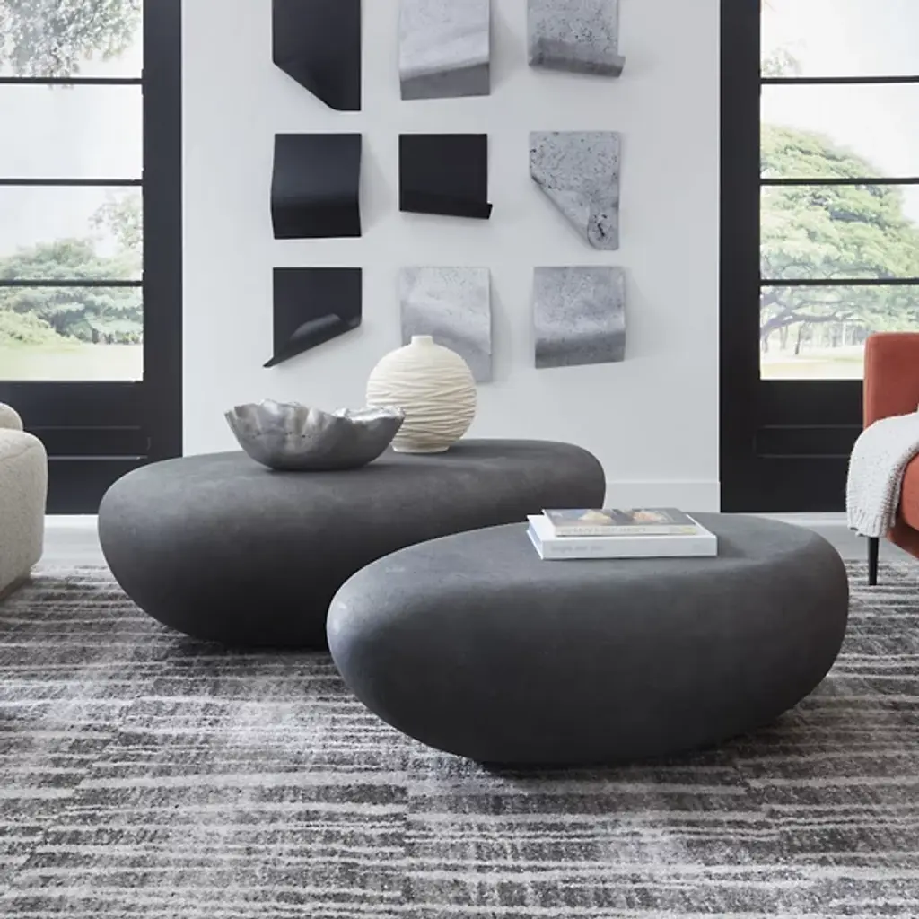 Inspired by the natural beauty of water-worn stones, designer Jason Phillips created the River Stone collection, featuring the River Stone Coffee Table. Crafted from composite, this coffee table has a soft, rock-like shape with no sharp edges, making it safe and inviting for any space. Its flat top offers practical functionality, while its organic form adds understated elegance. This piece reflects Phillips Collection’s modern organic ethos, blending nature-inspired design with contemporary style.