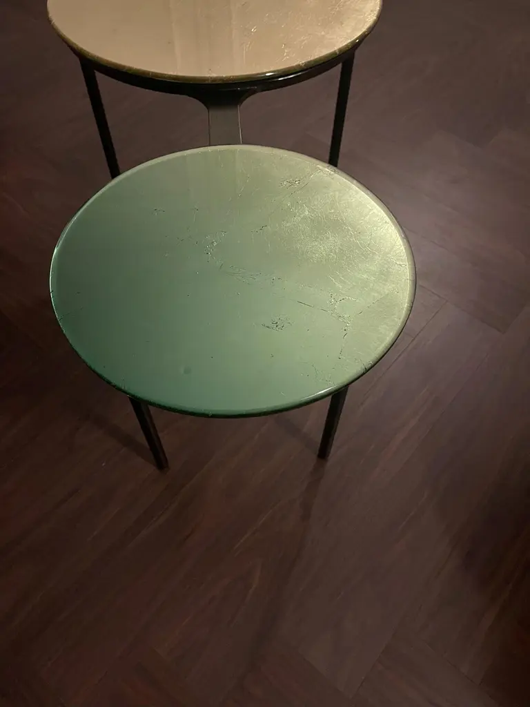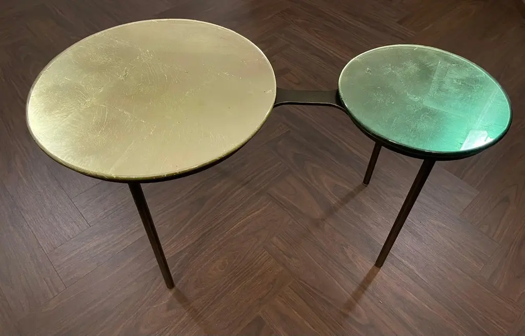 The Getsumie coffee and cocktail table from RIZO’s range of luxe-living is a celestial-inspired everyday masterpiece. The tabletop is a swirling blend of deep midnight blues and radiant golds, reminiscent of the moon and sun. Its design form and tonality subtly captures the phases of these celestial bodies, creating a captivating centerpiece for any space. The base, with a sleek tungsten metallic finish, adds a touch of cosmic mystique. This unique piece of furniture brings the beauty of the heavens into your living room, blending the tranquility of moonlight with the warmth of the sun.Please Note: The one-of-its-kind Getsumei coffee and cocktail table may have variations in its form, texture, tonality and finish which are not imperfections but a testimony to the authentic artisanal production. Each piece is 100% unique & handcrafted, therefore, dimensions may vary slightly.RIZO Getsumei Table Top dimensions;Large Top: 19” (Diameter) x 18” (Height).Medium Top: 13” (Diameter) x 18” (Height).