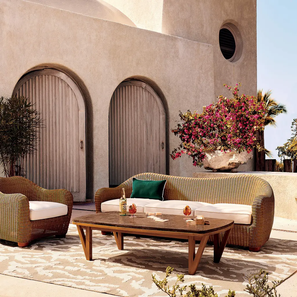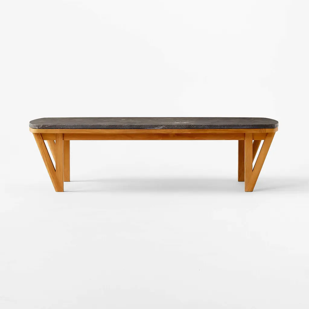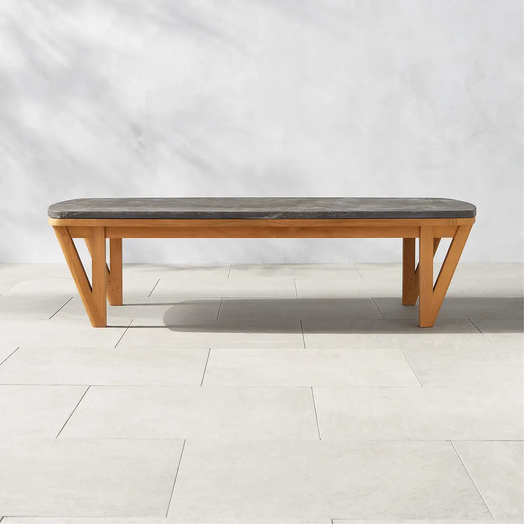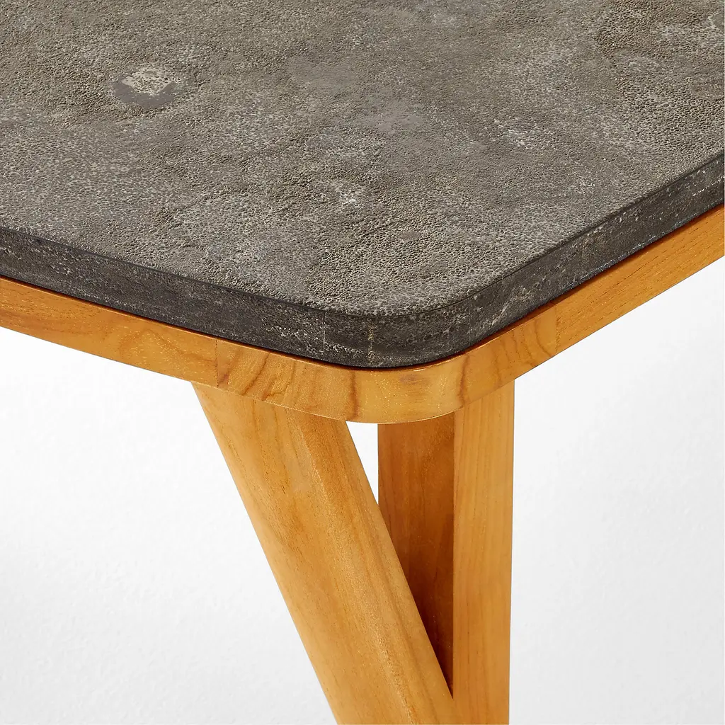 Stunning outdoor coffee table by Ross Cassidy combines the natural beauty of teak with a luxurious bluestone tabletop that can stand up to any outdoor soiree. Teak frame, certified sustainable by the Forest Stewardship Council ®, has a warm tone that may develop a gorgeous silvery-grey patina over time. The naturally filled Bluestone top undergoes an acid etching process that enhances the stone's surface, giving it a rich and sensual texture. CB2 exclusive. If left uncovered and untreated, natural teak will patina to a beautiful silvery grey.