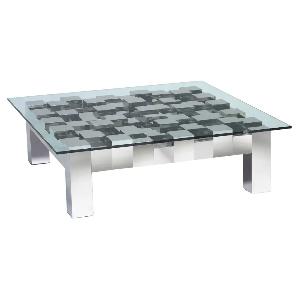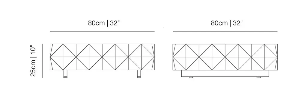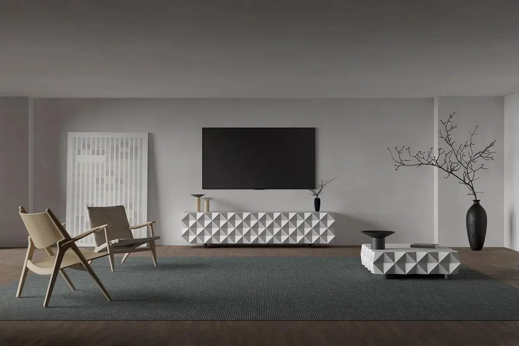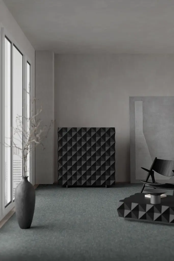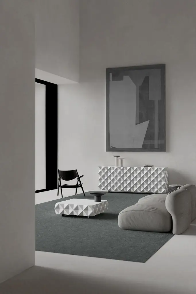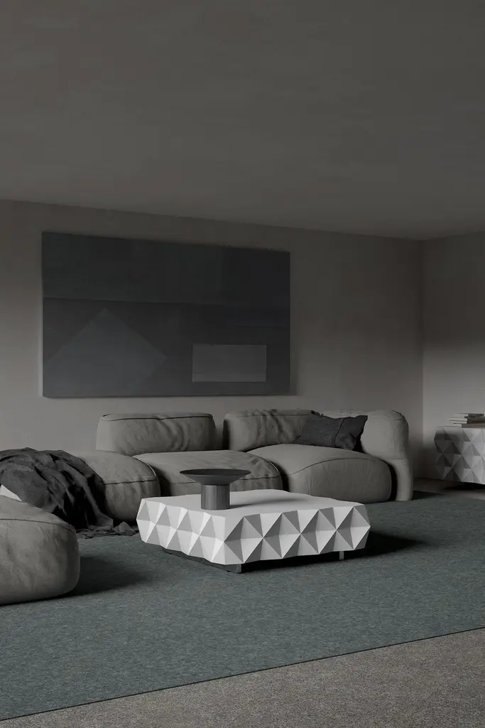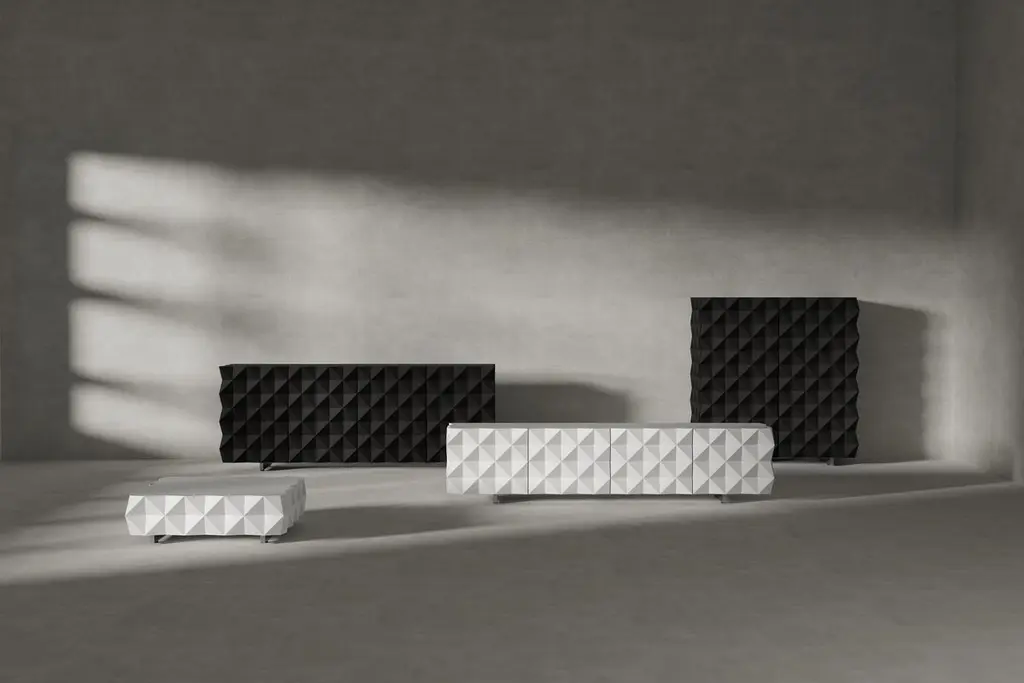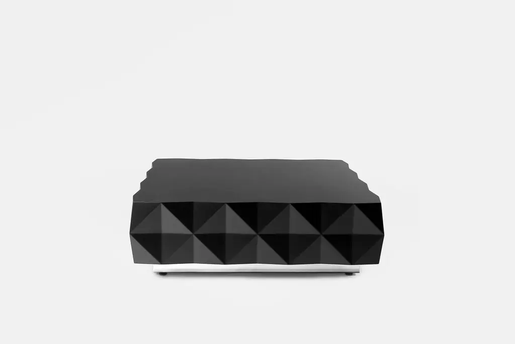 A luxurious piece of furniture with an implied provocation in its polygonal surface. Definitely an elementary piece of design for bold personalities.Coffee table from the Rocky Collection designed by Joel Escalona, detailed on its four sides with a pyramidal pattern. Made of particle board and chromed metal legs. Finished in semi-gloss lacquer.——NONO is a Mexican design brand with more than 10 years of experience dedicated to the production of interior furnishings, editions, and custom-made projects. At NONO, we create pieces of extraordinary beauty, accommodating the particular needs and tastes of each client with exclusive high-quality designs.—Joel Escalona is a Mexican designer, difficult to define with a single word. His constant search for clarity, integrity and harmony led to his development as a designer with an obvious inclination towards visual arts, such as painting and sculpture. Joel’s work is characterized by thorough and elegant processes, sometimes creative, other times productive and on occasion, a bit introspective. In his work, it is possible to find glimpses of his charismatic and ironic personality, resorting to elements such as lyric, humor and poetry as attributes that are in constant connection throughout his body of work.————Some details to consider when placing an order with us:• Catalog images are digitally generated. Actual products may slightly vary in texture, grain, and final finish due to natural material differences. Despite these variations, our expertise ensures each piece maintains high quality and matches the intended design.• All of our products are made to order, and the lead time for standard products is estimated to be 9 to 12 weeks, plus shipping time. However, special pieces or sculptures may require a longer lead time.• We offer customization in dimensions and finish for all of our furniture pieces, which may result in additional charges.• We only facilitate freight services by a third party. The client is solely responsible for any associated import/export taxes, as well as any necessary customs paperwork.• We are not responsible for any damages that may occur during shipping or for any customs-related delays.