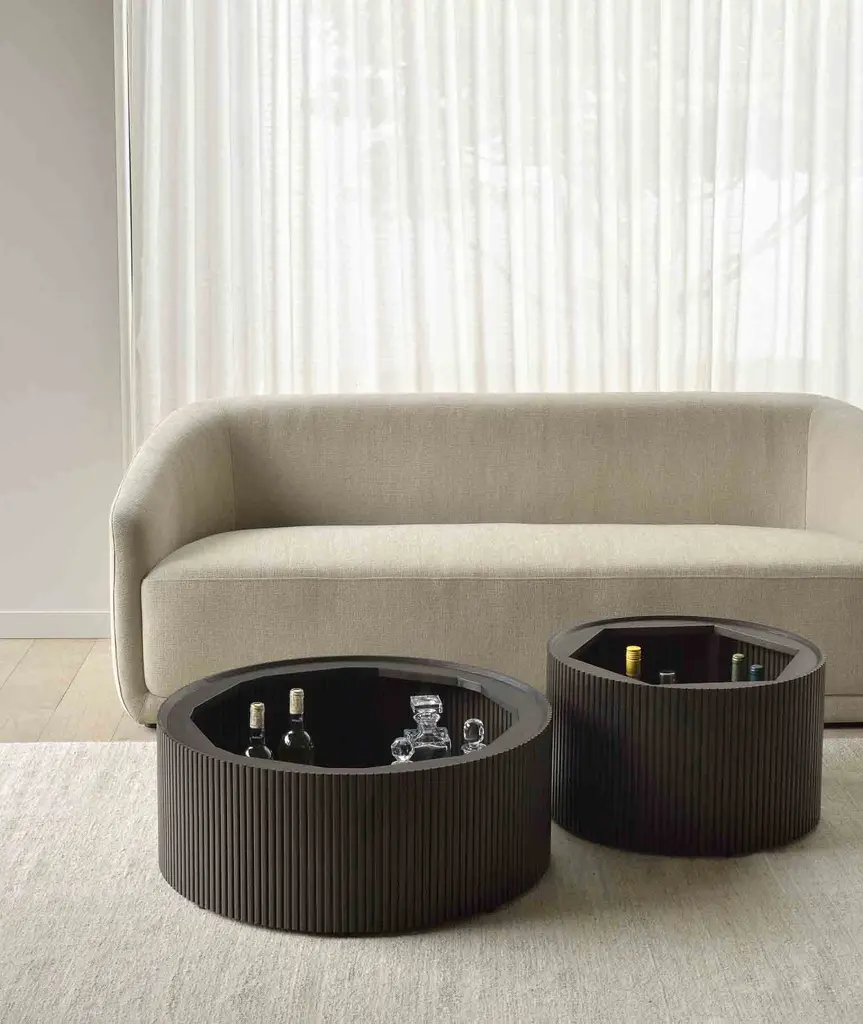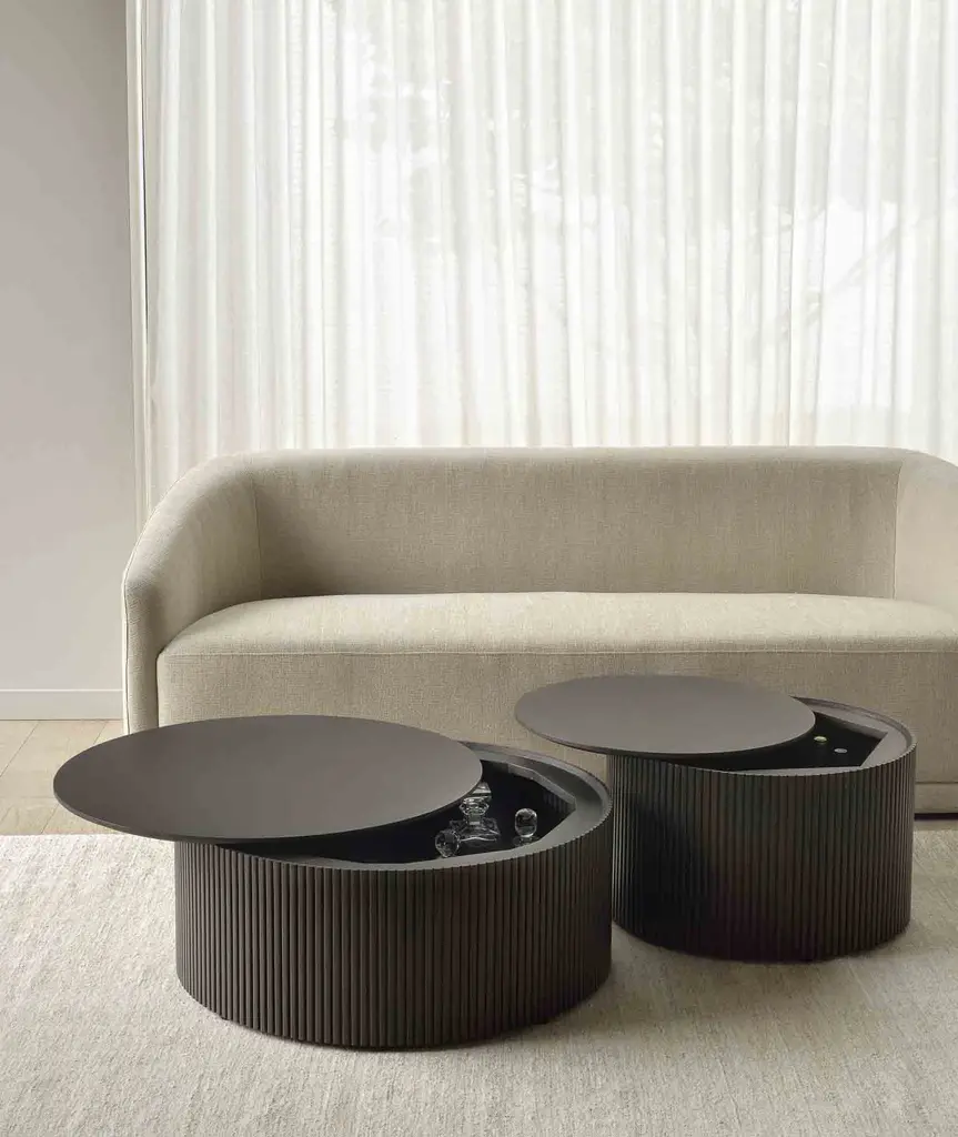 Designed by Jacques Deneef, the Roller Max is a clever multifunctional item that combines a side table with storage. Encapsulated in its stacked wood-stick effect, the tabletop can be easily removed to hide the newspapers, toys, cushions and throws from daily life. The perfect solution for smaller living.
