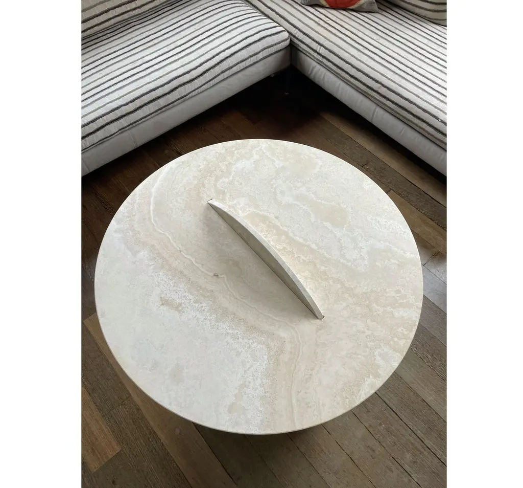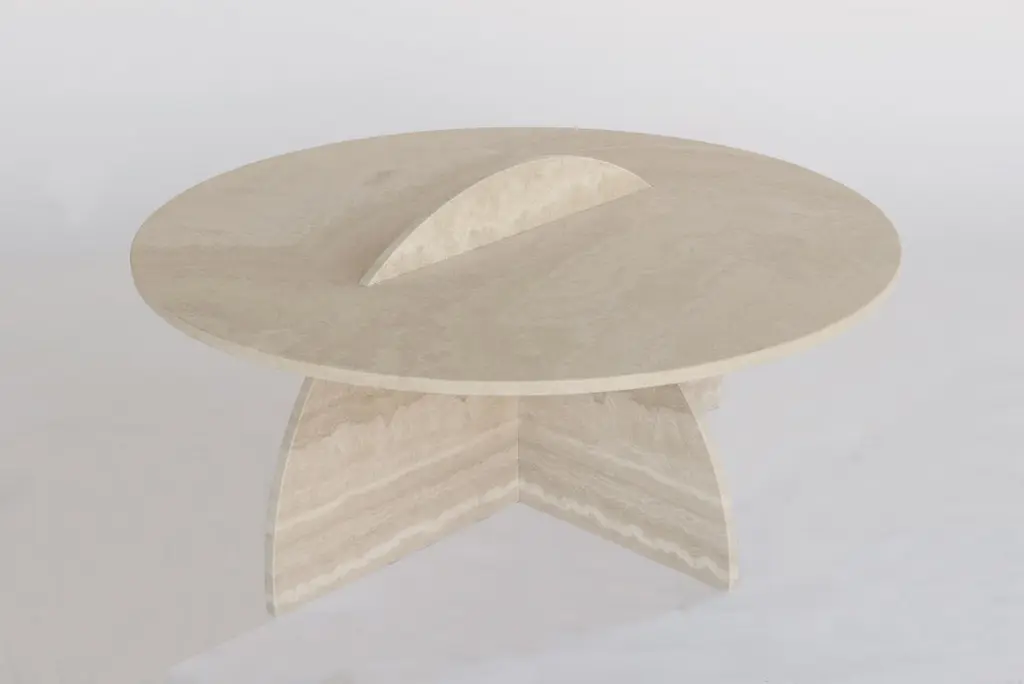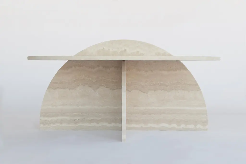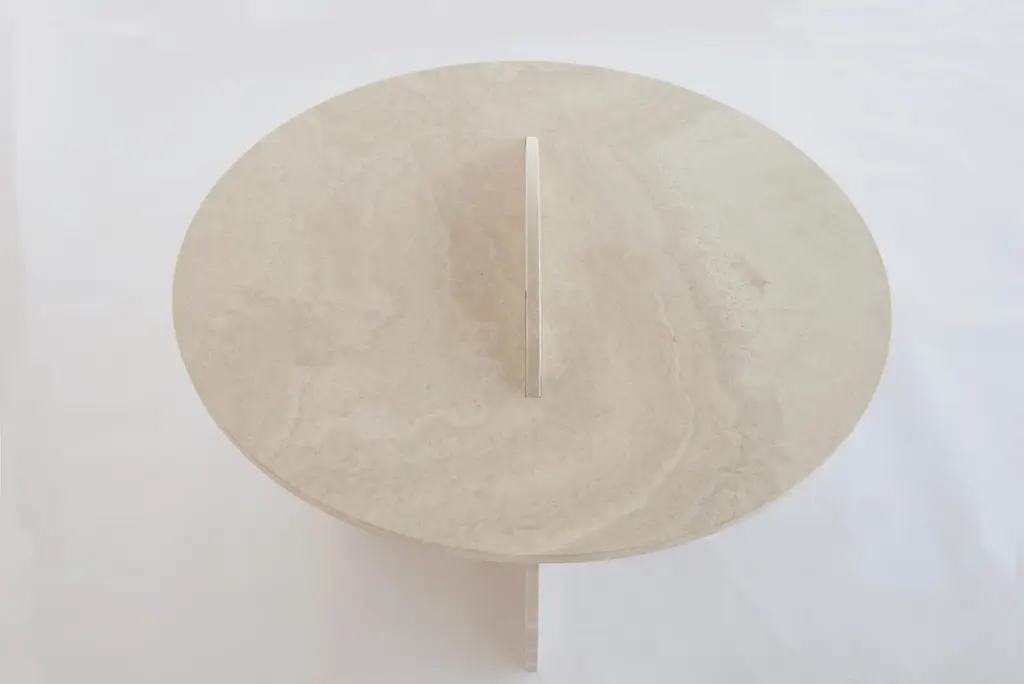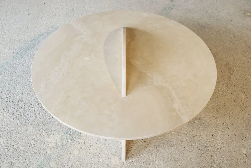 Roma coffee table by Emanuela PetrucciDimensions: D 120 x H 43 cmMaterials: Travertine interlocking piecesFinishes: Brushed, filled with cementRoma is a coffe table designed by Architect Emanuela Petrucci to celebrate the city of Rome by the use of a local material eternally Classic such as the city. The slabs are cut from a unique travertine block. Cutting the block horizontally gives the slab a nuvolato texture, used for the top piece. Cutting the block vertically you can see the layers of the calcareous stratification of the stone. The Architect’s IDEA is to give travertine a light appearance. The three pieces are assembled only by gravity with an interlocking connection and with no need of glues or chemicals. When the slabs are disassembled, they come in a 50cm width box. ROMA was produced by craftsmen of the “Travertino Fratelli Pacifici”, an historic quarry in Tivoli. It’s unique characteristics are the contemporary form, the assembly method and the sacrality of an eternal material that gives ROMA the appearance of a totemic element. The use of the curve generates two completely different elevation views.