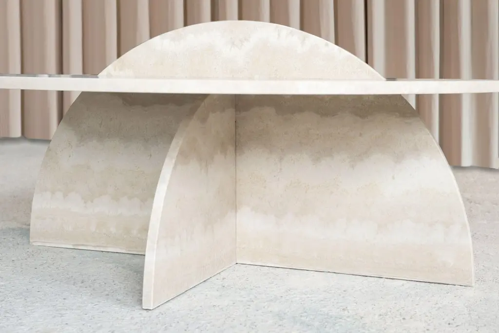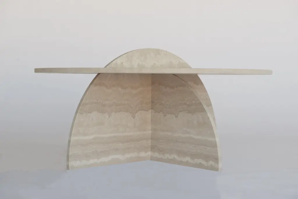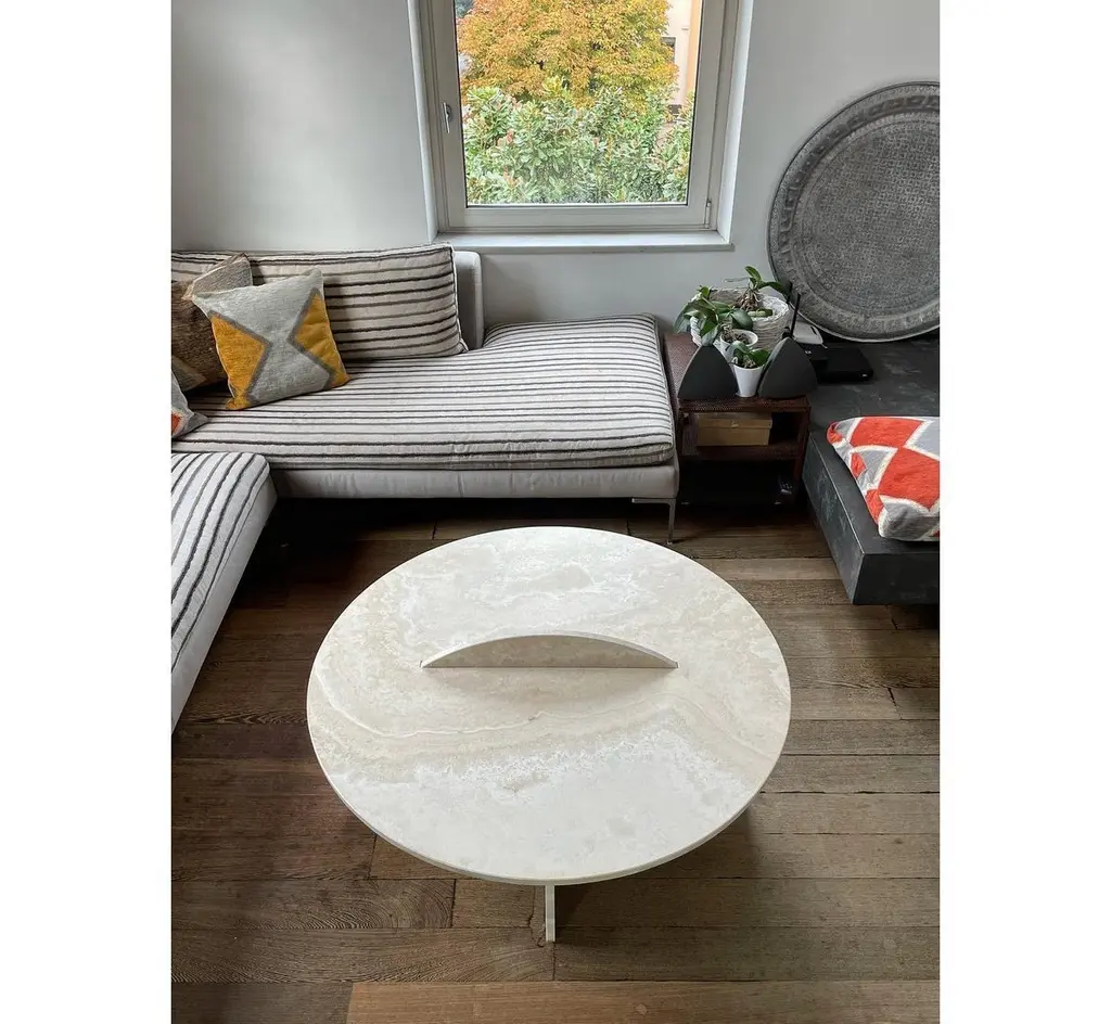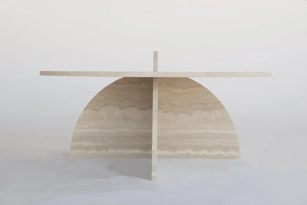 Roma coffee table by Emanuela PetrucciDimensions: D 120 x H 43 cmMaterials: Travertine interlocking piecesFinishes: Brushed, filled with cementRoma is a coffe table designed by Architect Emanuela Petrucci to celebrate the city of Rome by the use of a local material eternally Classic such as the city. The slabs are cut from a unique travertine block. Cutting the block horizontally gives the slab a nuvolato texture, used for the top piece. Cutting the block vertically you can see the layers of the calcareous stratification of the stone. The Architect’s IDEA is to give travertine a light appearance. The three pieces are assembled only by gravity with an interlocking connection and with no need of glues or chemicals. When the slabs are disassembled, they come in a 50cm width box. ROMA was produced by craftsmen of the “Travertino Fratelli Pacifici”, an historic quarry in Tivoli. It’s unique characteristics are the contemporary form, the assembly method and the sacrality of an eternal material that gives ROMA the appearance of a totemic element. The use of the curve generates two completely different elevation views.