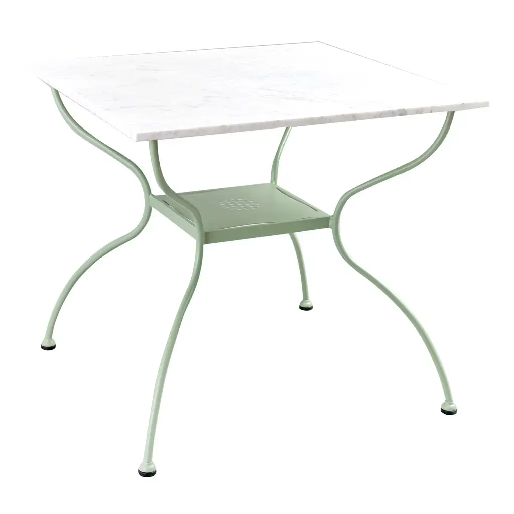 An exquisite balance between the malleability of stainless steel with the rigidity of marble, this coffee table boasts a highly geometrical design composed of curved and straight lines. Handmade of timeless materials, it rests on a delicate green-lacquered stainless steel base, firmly supporting a sturdy rectangular top in white Carrara marble. This piece will be a bold statement in a modern living room.