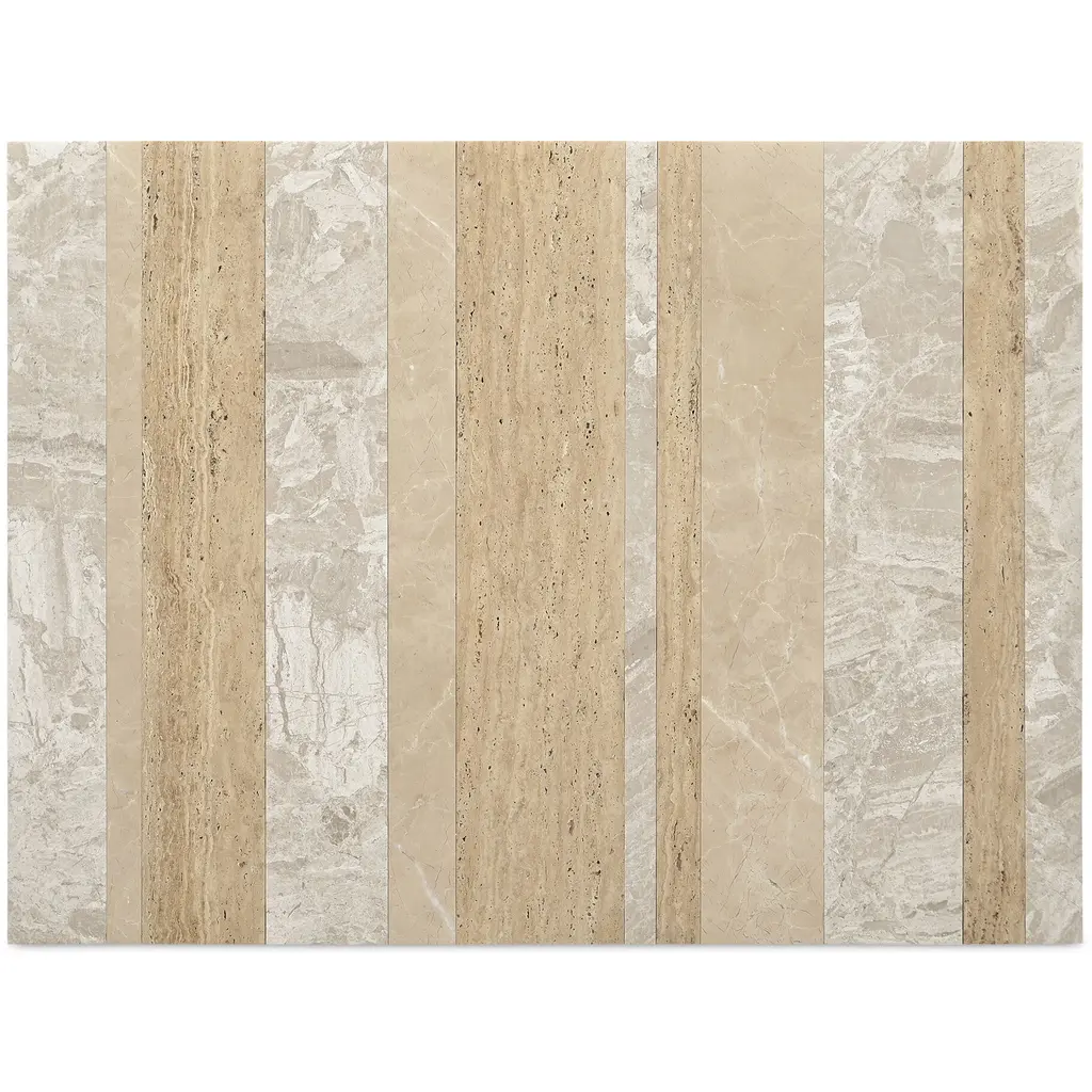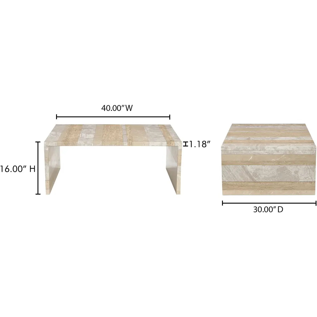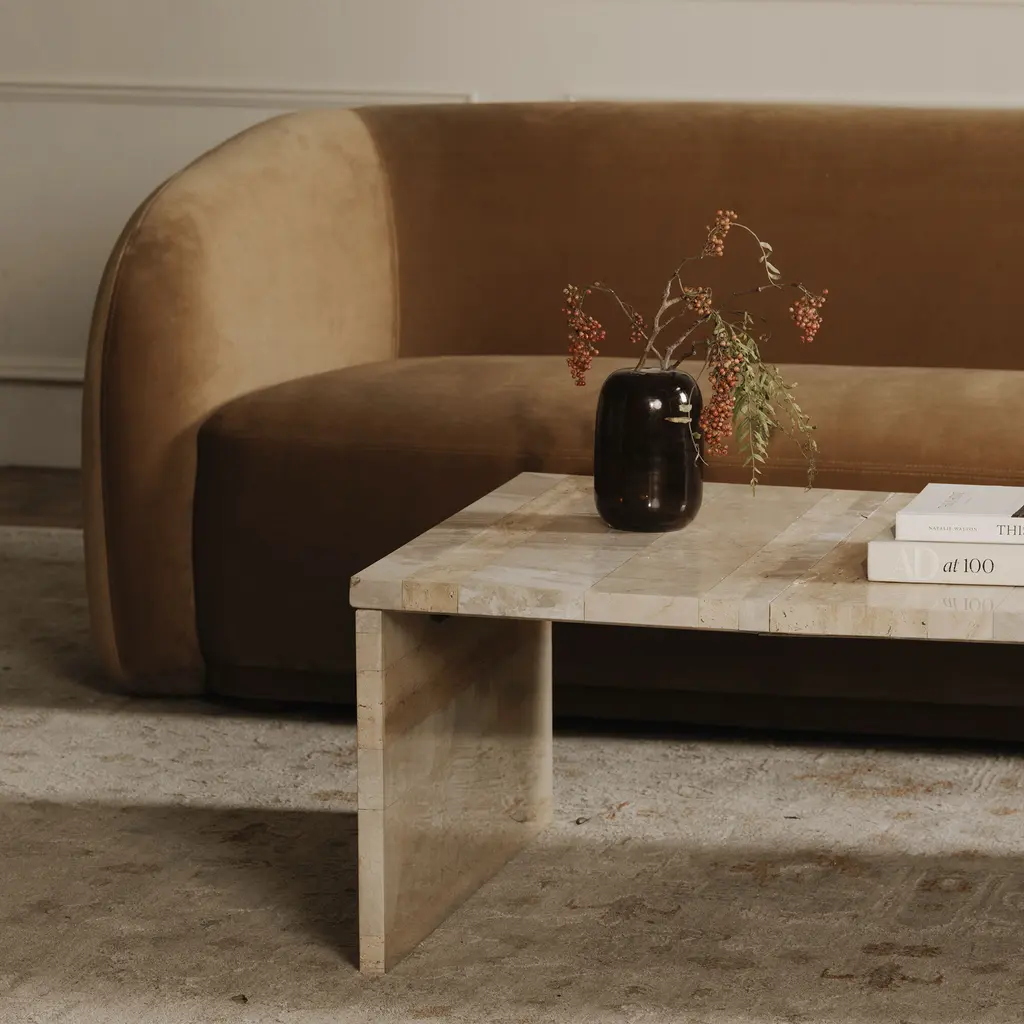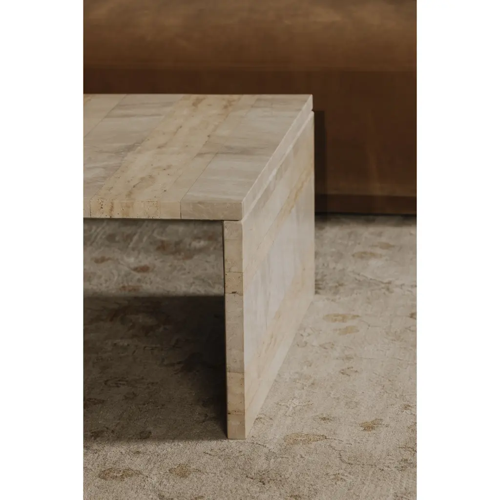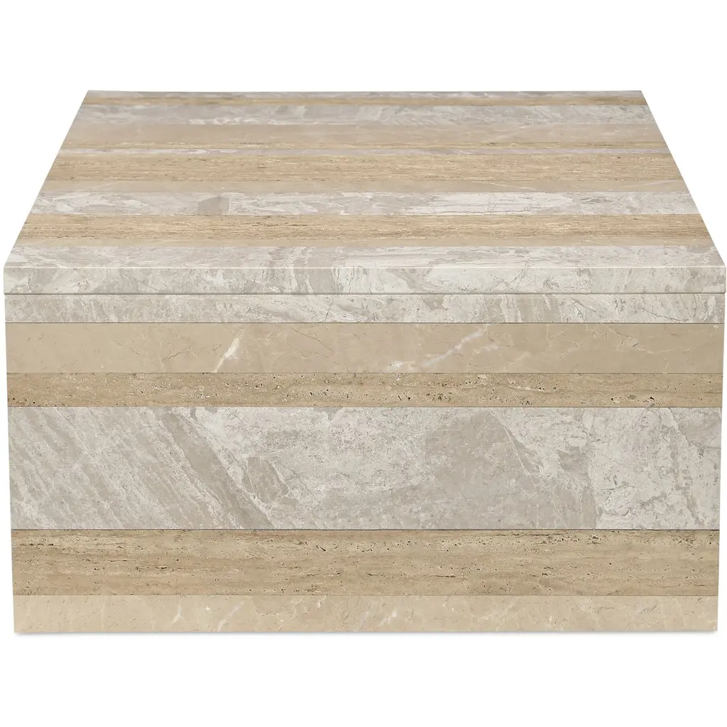 The bold simplicity of the waterfall design speaks volumes with the Rosa coffee table's versatility. The table is singularly impactful and crafted from beautiful sections of different types of neutral-toned marble with a generous scale and thickness to create a substantial look. This piece commands attention as a statement of natural elegance.