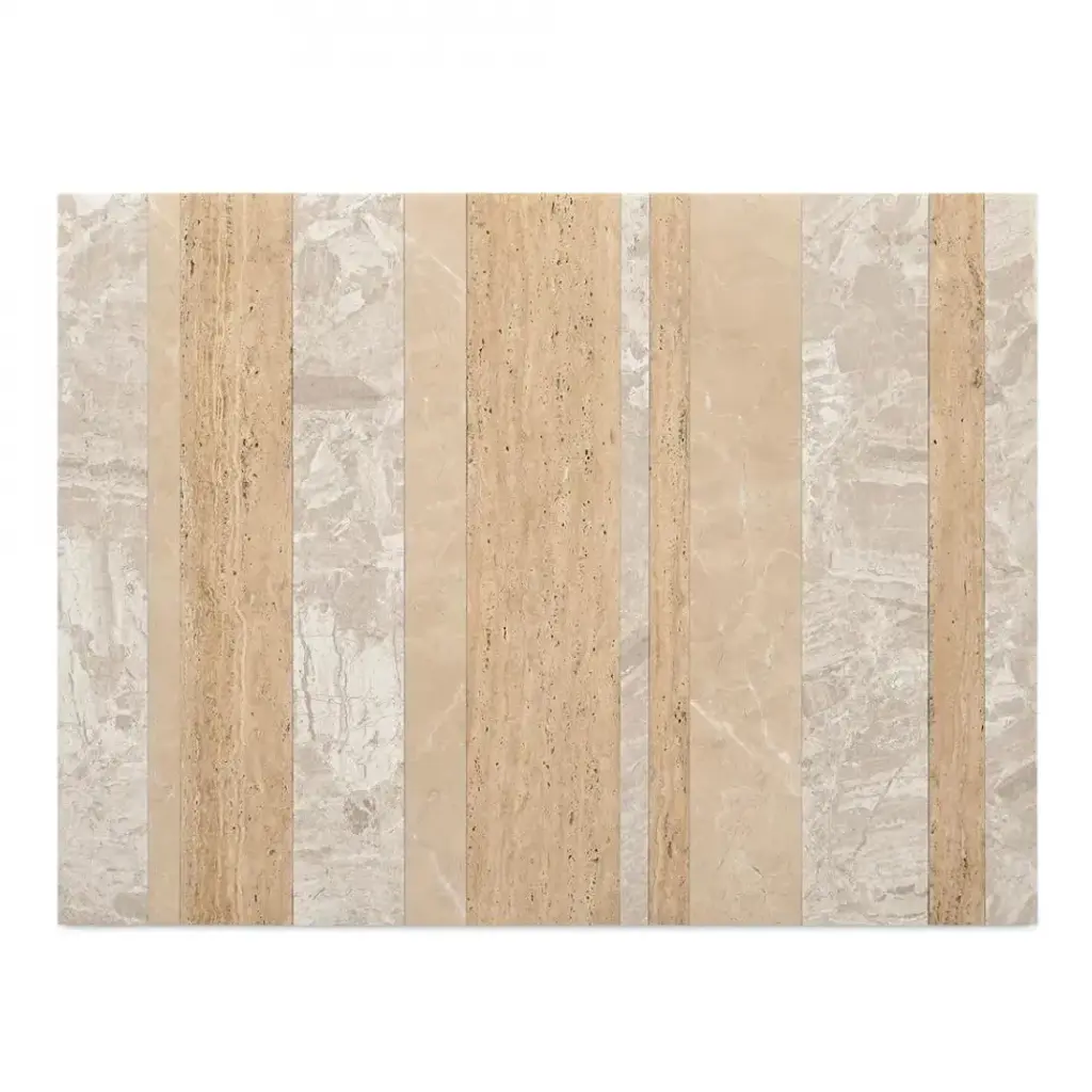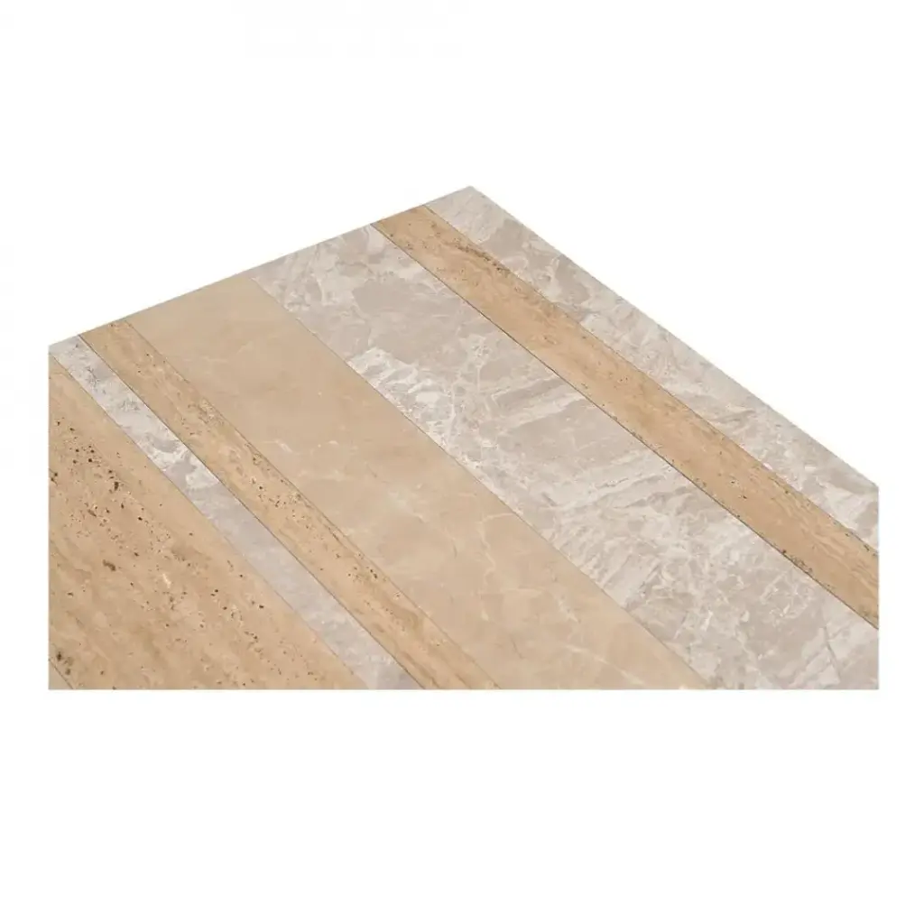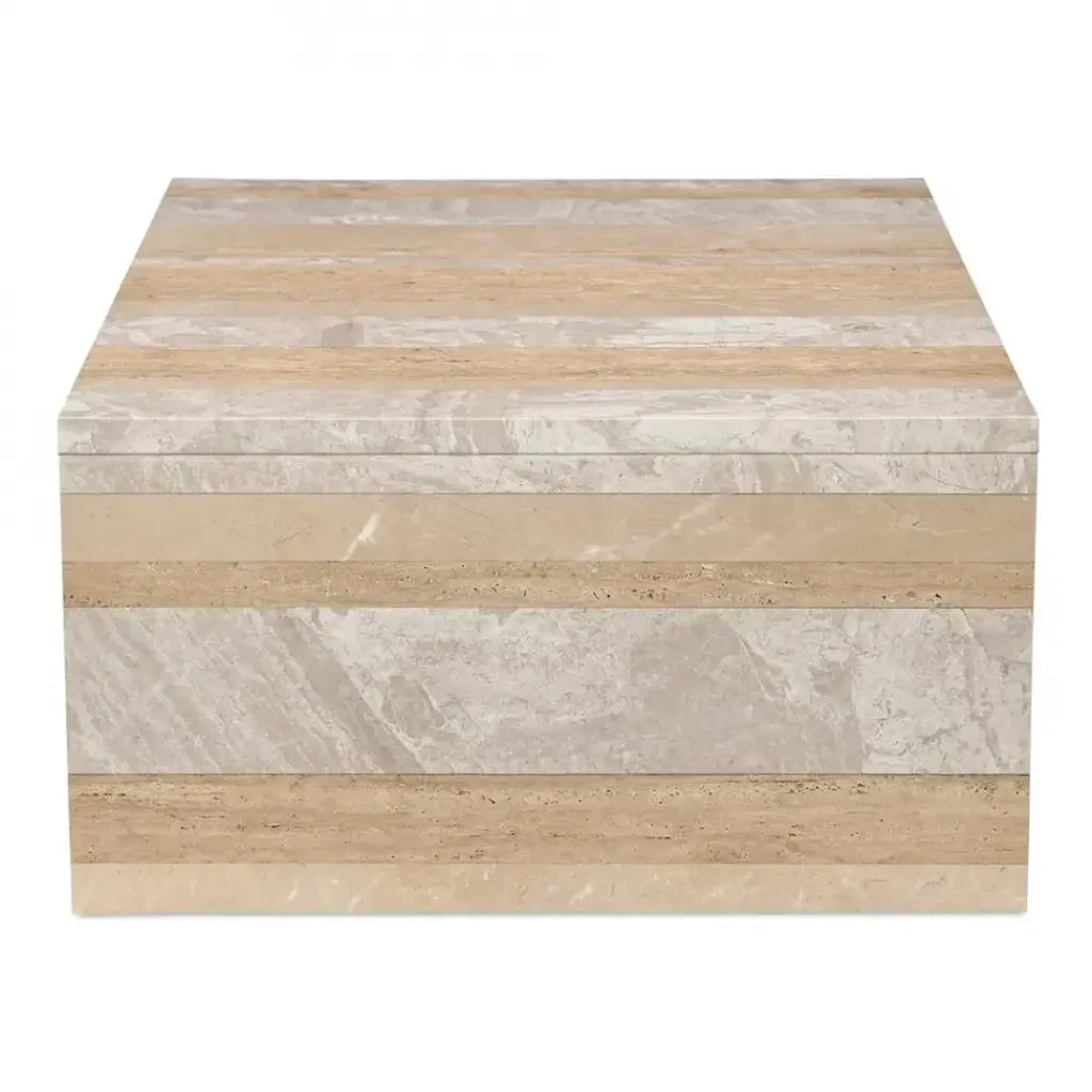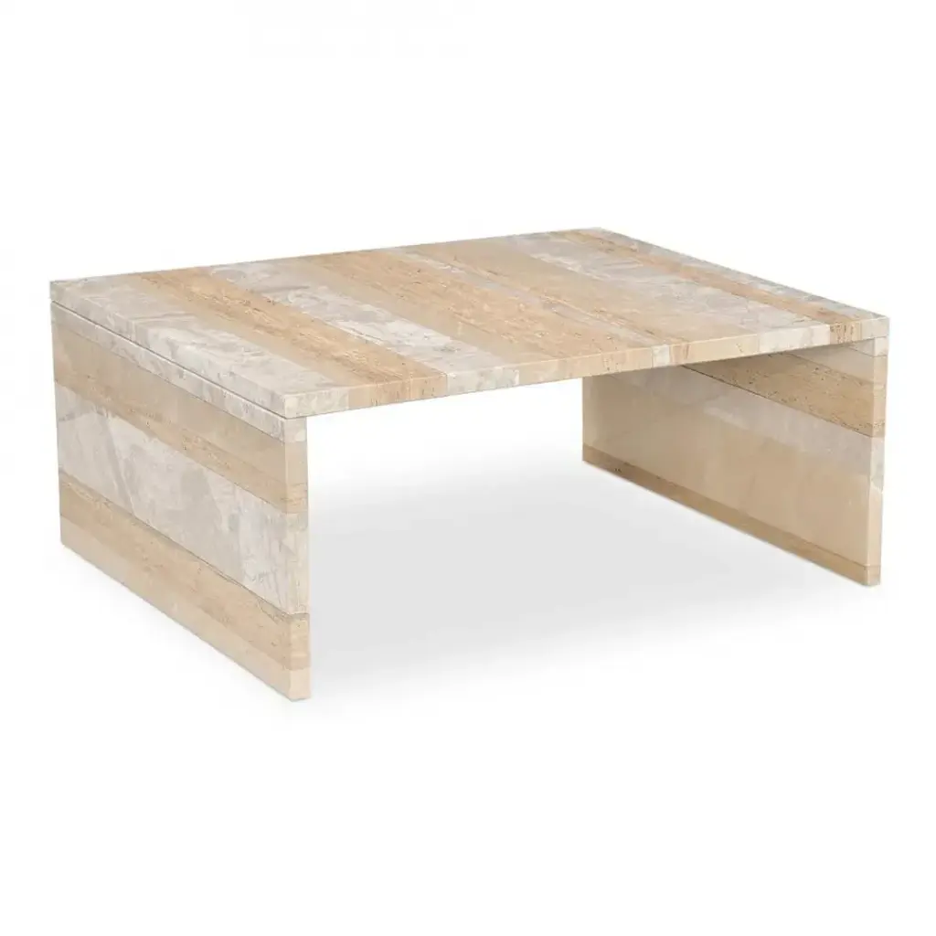 The bold simplicity of the waterfall design speaks volumes with the Rosa coffee table's versatility. The table is singularly impactful and crafted from beautiful sections of different types of neutral-toned marble with a generous scale and thickness to create a substantial look. This piece commands attention as a statement of natural elegance.