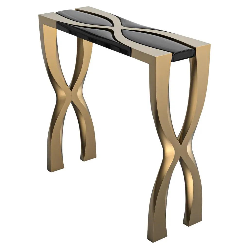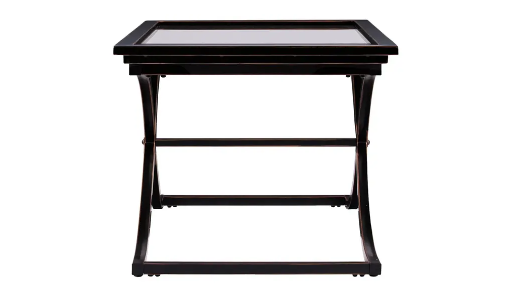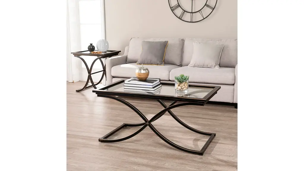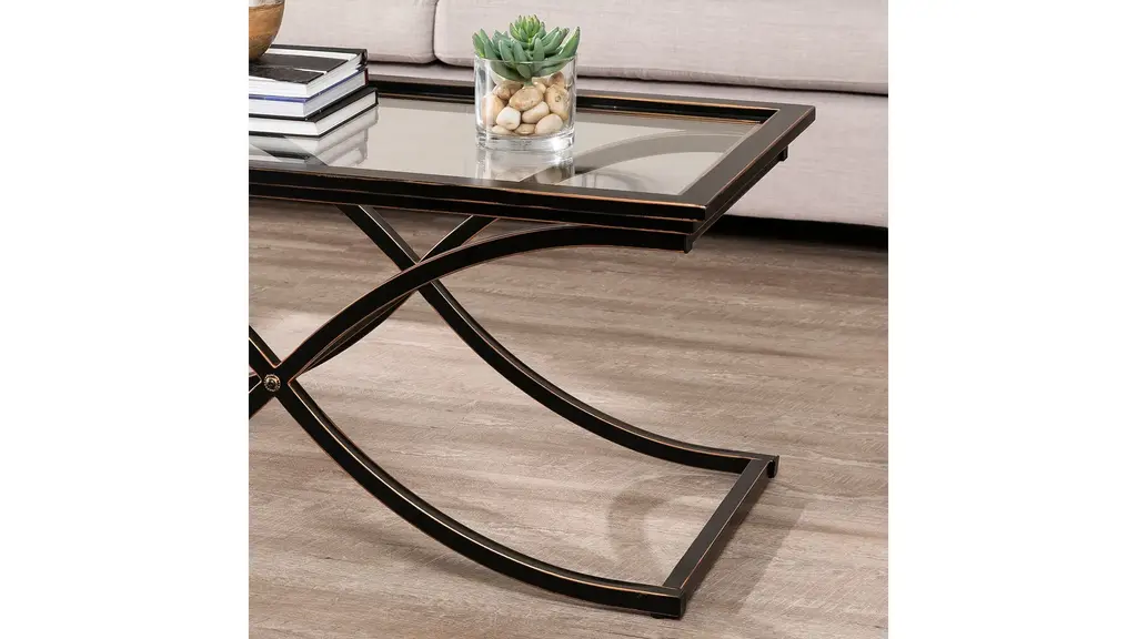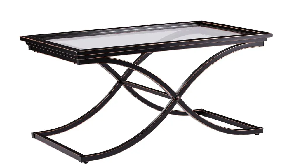 The contemporary elegance of the Rosalia Cocktail Table will bring a pleasantly distinct style to your home. The metal frame is finished in black with the edges rubbed away to show the copper finish below. The base of this sturdy table consists of a curved "X" which supports the solid top frame with inlaid glass. This elegant table can be used to achieve a formal atmosphere or a casual contemporary home setting.