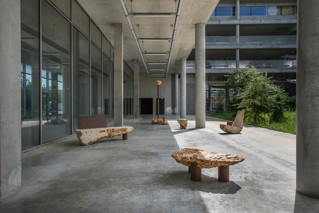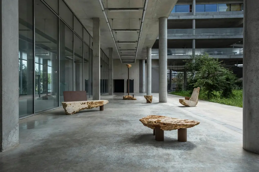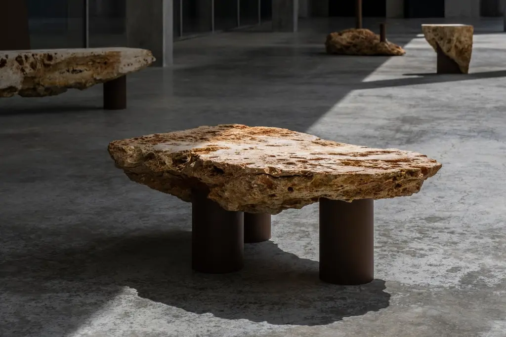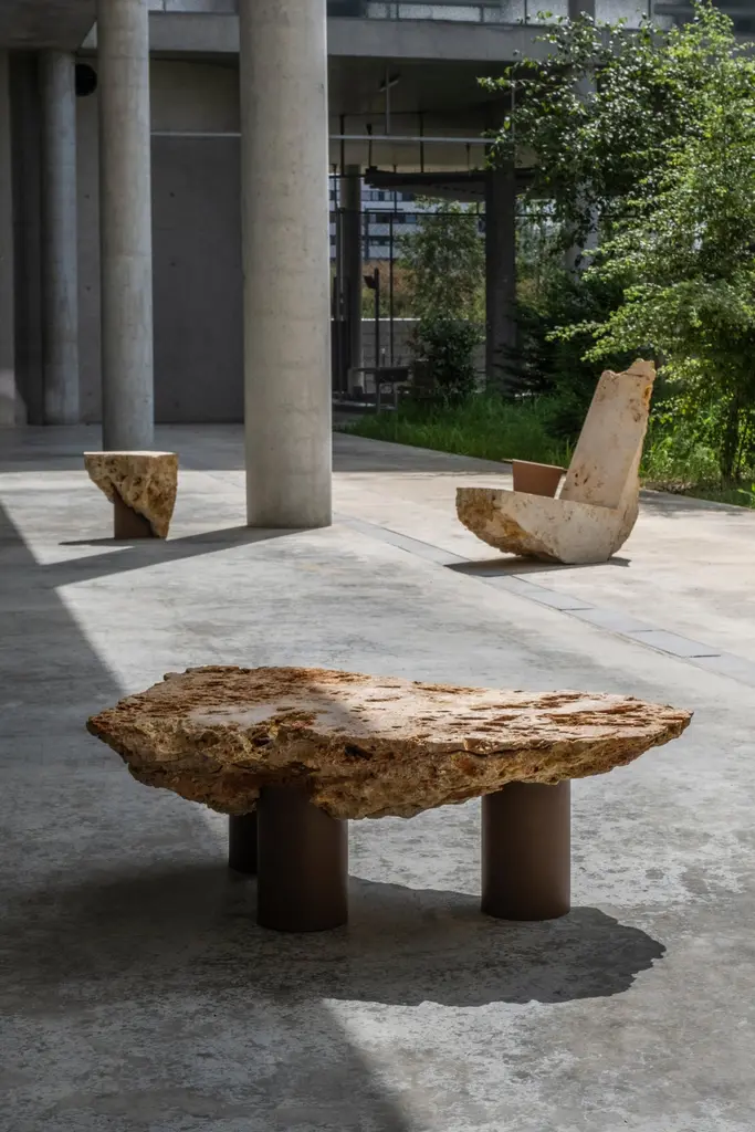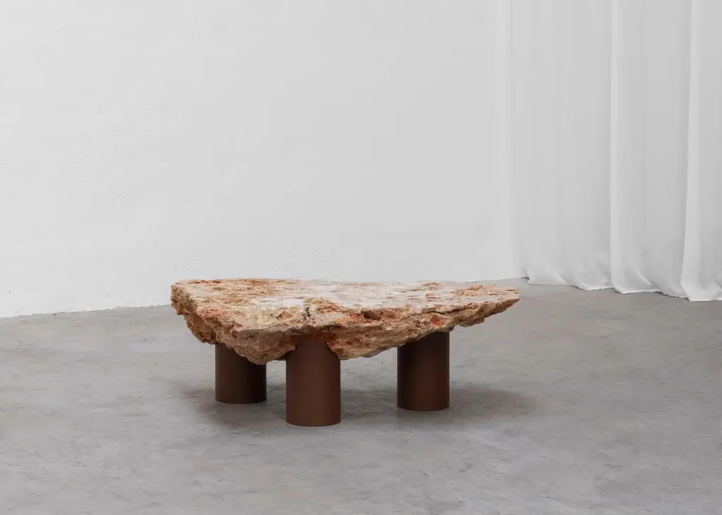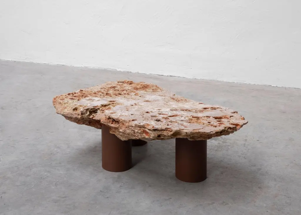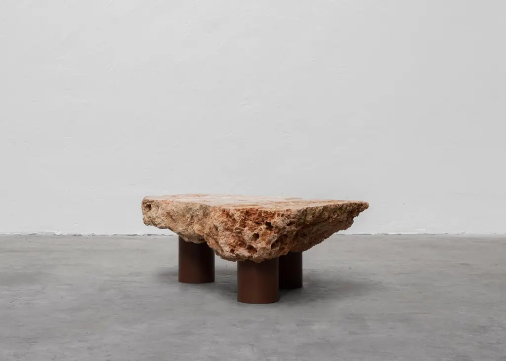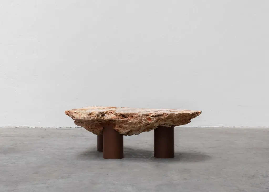 Meulière Stone Coffee Table by Frédéric SaulouUnique PieceDimensions: D 80 x W 120 x H 35 cm.Materials: Powder-coated steel and Meulière stone.Weight: 120 kg. From one creation to another, the matter can present certain roughness and variations. Indeed, each piece is unique because of the natural appearance of the stone and its shaping. We carefully select our stones for the best result. Almost all the pieces are possible to be created made-to-measure for special sizes. The weight may vary. Please contact us.For several months, the designer Frédéric Saulou worked on the Parisian territory to exchange with local actors and create unique pieces using Meulière stone - a local stone emblematic of Paris, which was extracted from the construction site of line 18 of the future metro. of the Grand Paris Express. In the past, this stone was used to grind wheat in the region and for the construction of houses in the old Parisian countryside. “Pierre d’ici” questions the relationship between matter in space and its origin, between the earth and its extraction, in the context of the construction site of the Grand Paris Express. This set of furniture refers to the territory in full mutation between the historical context of the site and urbanization.Archaeological excavations have uncovered traces of man dating from the 5th to the 1st century BC, from the second Iron Age. Today, on this same territory, excavations have given way to other sites, such as the metro. The different pieces presented refer to these changing universes, both through the types of furniture used and in the use of the materials used.Meulière stone was recovered from the construction sites of line 18 of thefuture Grand Paris Express metro, a local resource whose quarries are now closed and are becoming difficult to exploit. The associated metal, a major element in the implementation of a construction site, symbolizes the link between the past and the present. It highlights the stone material and confirms the function of the object.The project is part of the landscape, both a vector of history and meaning. It also has made it possible to develop a common reflection around sustainability and the enhancement of local resources.In collaboration with Galerie philia, the Grand Paris Express companyand the cultural institution of the 104.Frederic Saulou's sculpted design artworks introduce a series of works coming from research and partnerships between local ateliers and designers and implemented to another scale, that of the object and contemporary creation.Frédéric Saulou is a proeminent French contemporary designer. Considered by many institutions and critics as one of the most talented designers of the new generation in France.Born in 1989, Frédéric Saulou lives and works in Rennes, France. He graduated in space and environmental design at the Institut Supérieur des Arts Appliqués (LISAA) in 2011 and in object design at the Ecole Européenne Supérieure des Beaux-Arts de Rennes (EESAB) in 2013. Frédéric will continue to perfect his experience within the Eric Gizard Associés agency and with the designer Frédéric Ruyant. In 2013, he founded the studio Frédéric Saulou Design Studio, an independent and multidisciplinary design and consulting agency that sees design as a space for research and exchange that allows him to develop a sensitive approach to forms and materials.Experimentation and research take precedence over his work in order to think of new materials and new uses. This accompanies his daily approach so that each project is conceived as a sculpture in its own right, between simplicity and technicality. His approach guides him towards a global approach but is also unique in his creations, thus creating particular interactions between the user and the object, between Industrial craftsmanship. Today Frédéric works on various projects, from objects to space, in series or limited editions and collaborates with prestigious institutions and brands such as the publishing houses Ligne Roset, Drugeot Manufacture, Brossier Saderne, Vista Alegre, Esprit Porcelaine Limoges, etc.