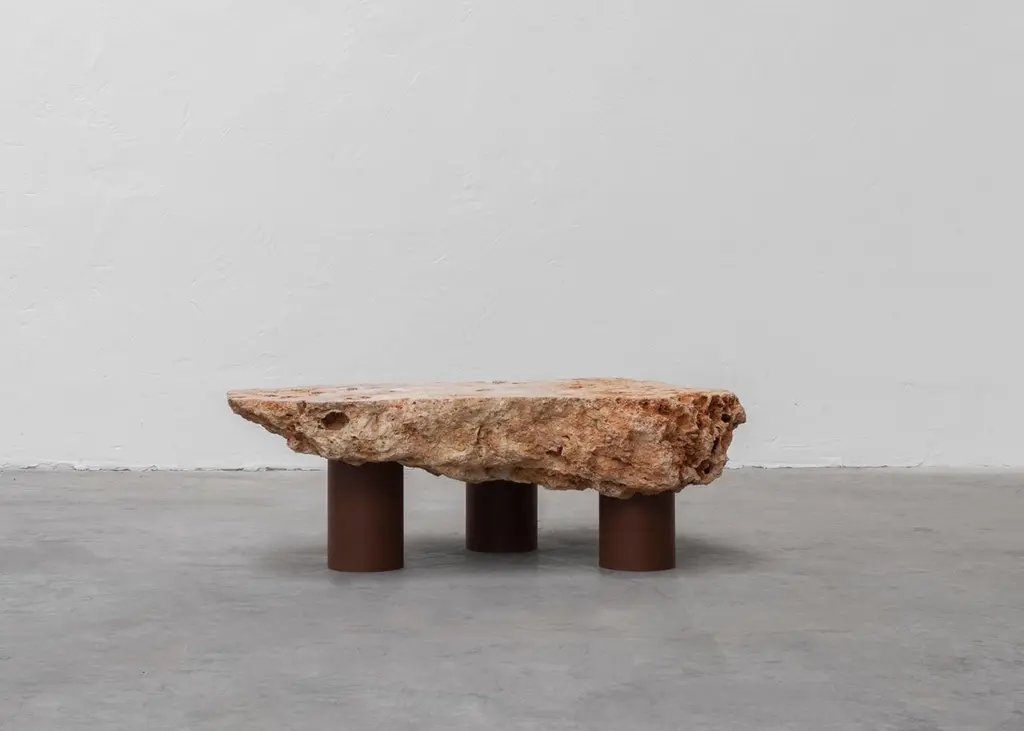 Rough Natural Stone Coffee Table By Frédéric Saulou With Three Brown Steel Legs