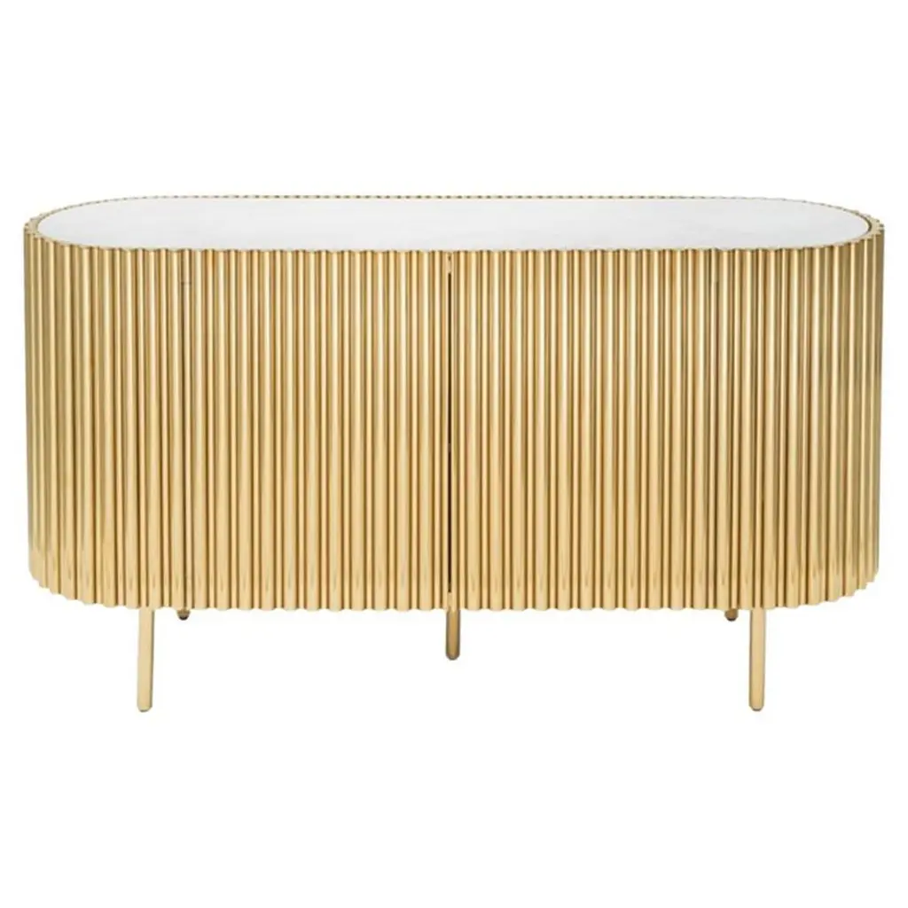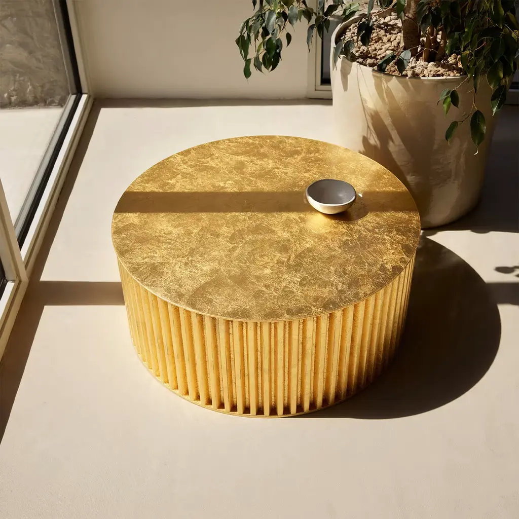 This coffee table embodies elegance and sophistication, making it a striking addition to any living space. Crafted from aluminum with a luxurious gold leaf finish, this table features a sleek, rounded silhouette that offers a refined aesthetic. The table's unique design showcases a ribbed texture along the sides, creating a dynamic visual contrast against the smooth tabletop. With its versatile design, this coffee table effortlessly complements various decor styles, enhancing the overall ambiance of the room. Whether used as a standalone piece or paired with complementary furniture, it promises to elevate the art of living with its timeless charm.
