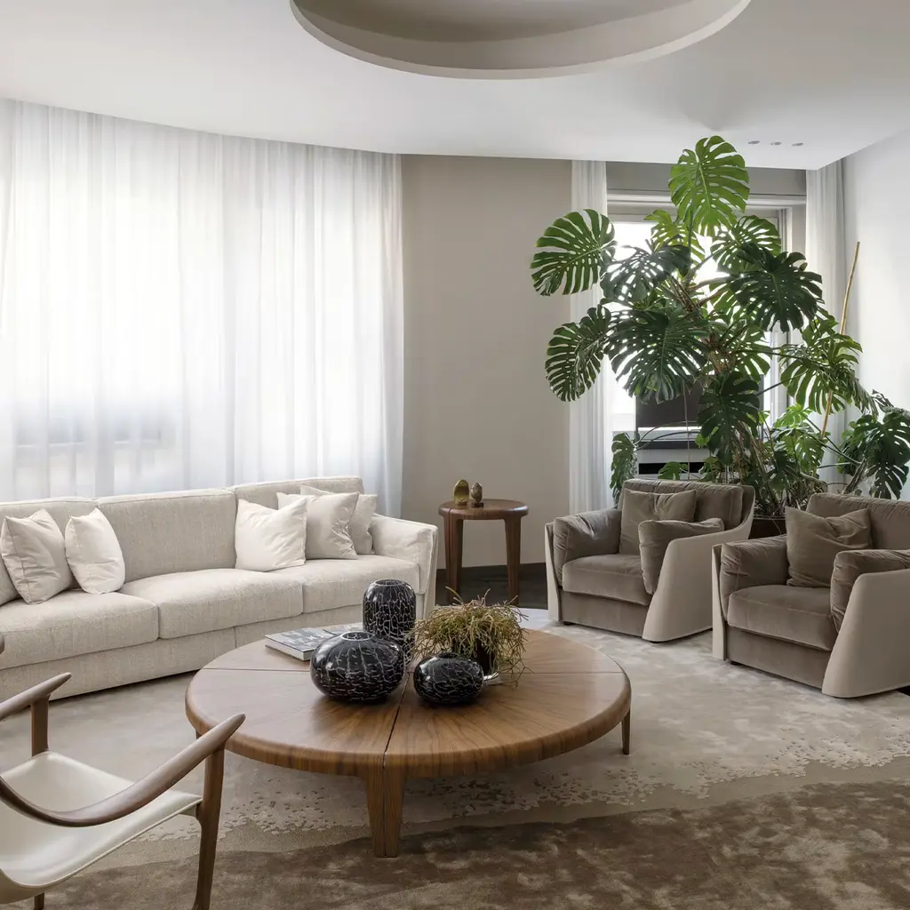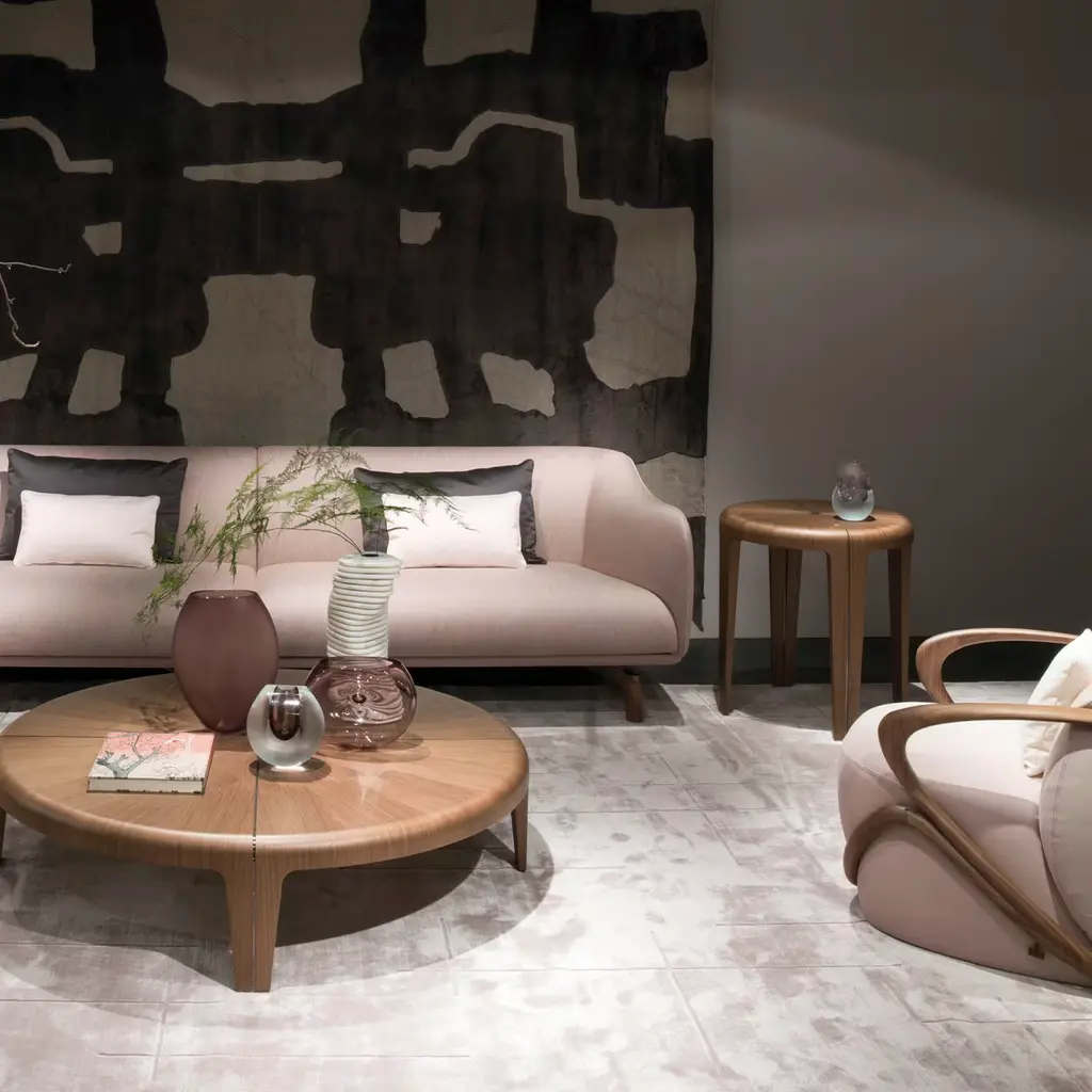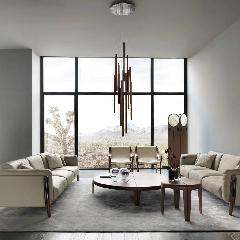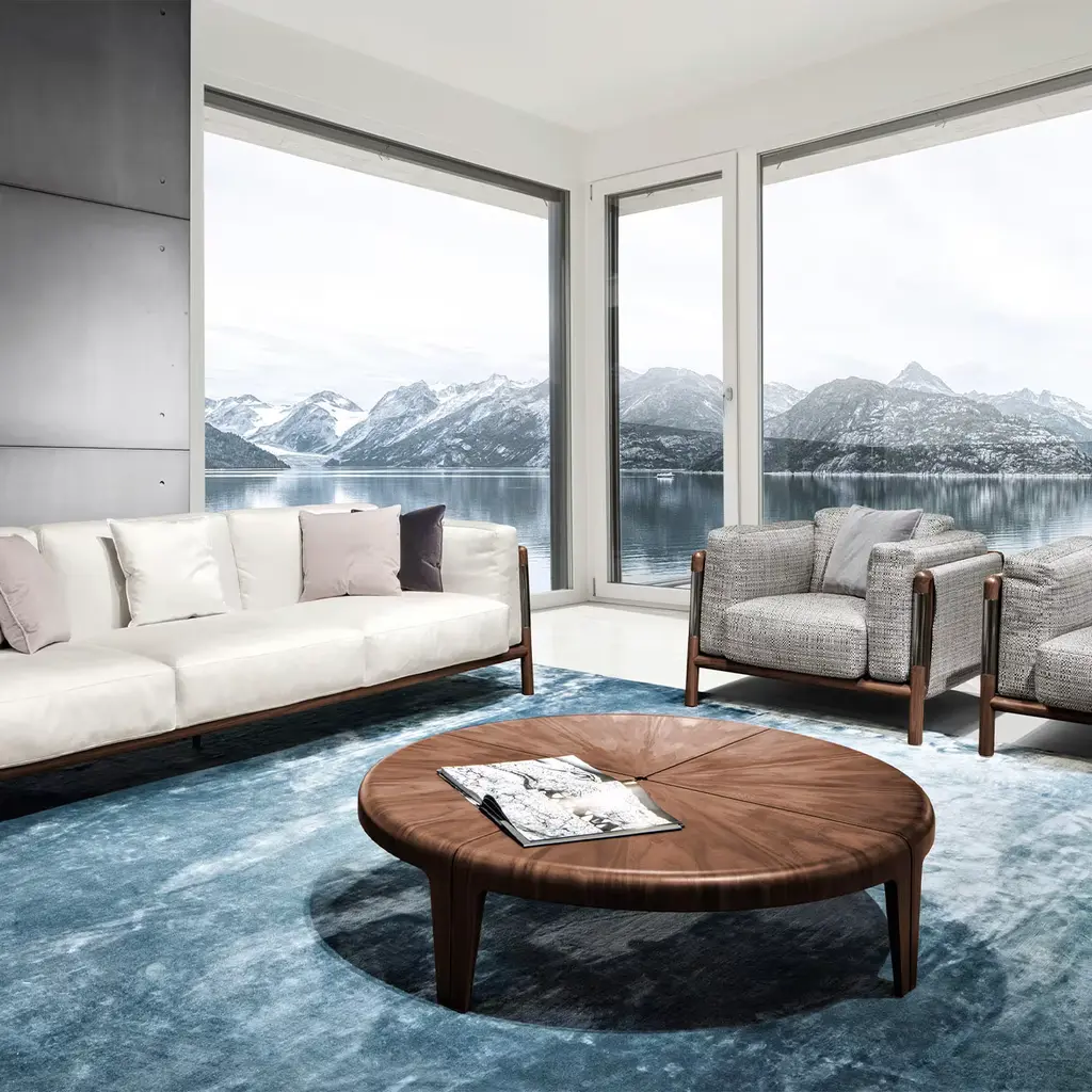 Characterized by magnificent natural grains, this coffee table is a timeless celebration of wood. Part of a series of round tables, it is made of fiber wood panels veneered with Canaletto walnut, enriched with polished nickel-finished metal inserts on the fascinating top. Please consult the Concierge for further information.