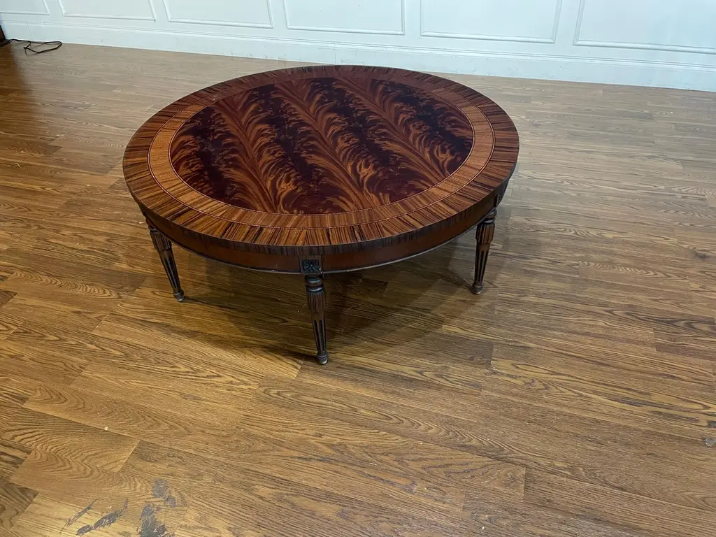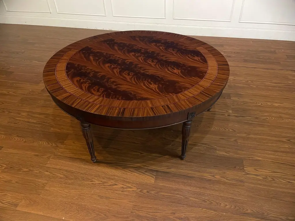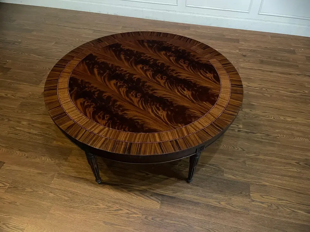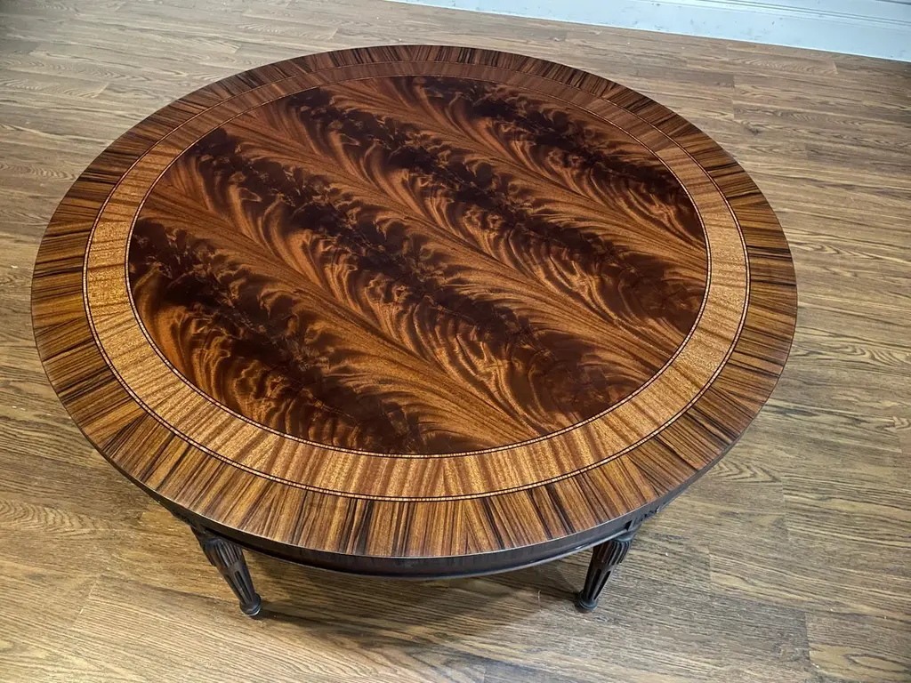 This is a made-to-order round traditional mahogany coffee table made in the Leighton Hall shop. It features swirly crotch mahogany and borders of straight grain mahogany and santos rosewood (Pau Ferro). It has six Sheraton inspired round fluted legs. It has a hand rubbed and polished semigloss finish. Available in various finishes.Dimensions: Diameter: 48 in.; Height: 18 in.