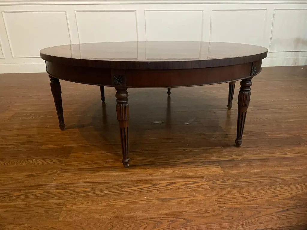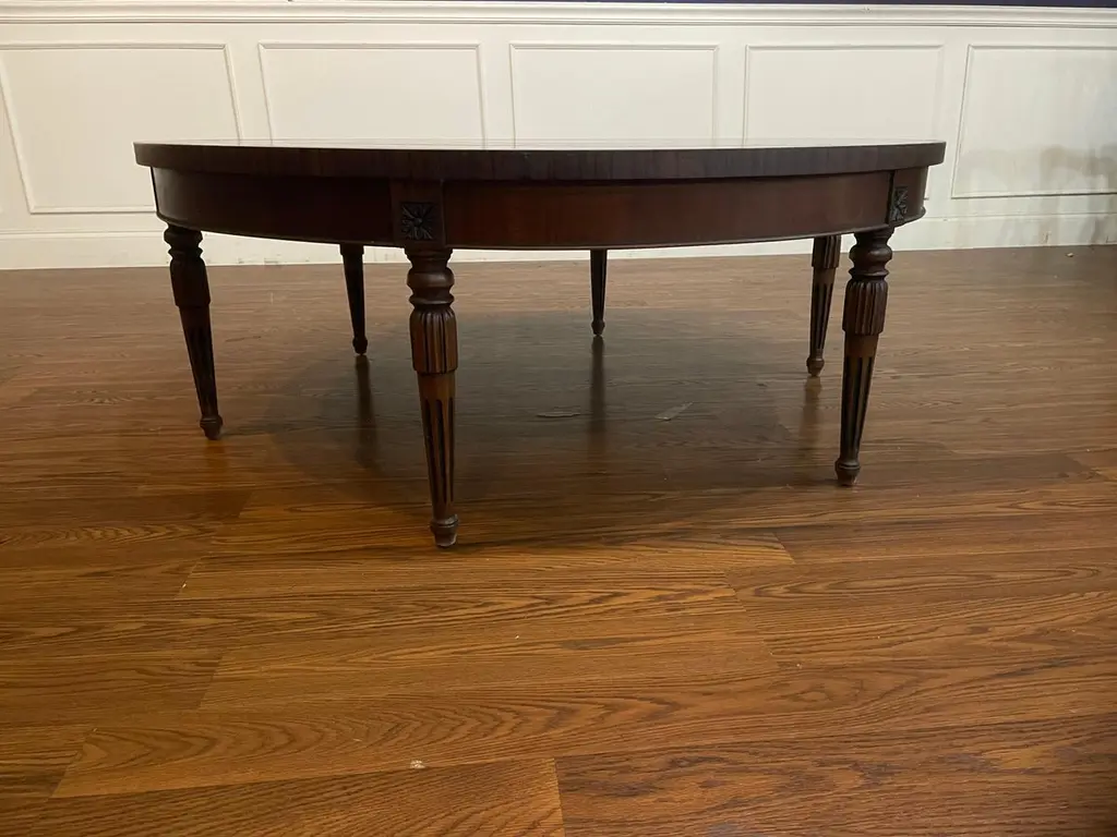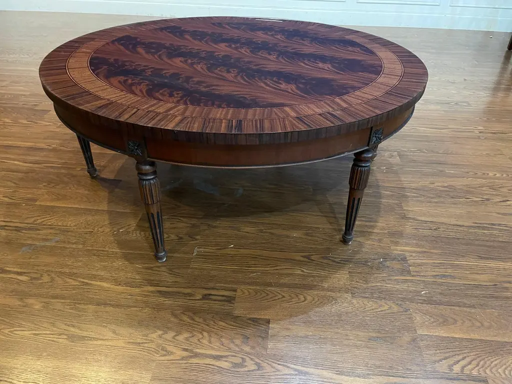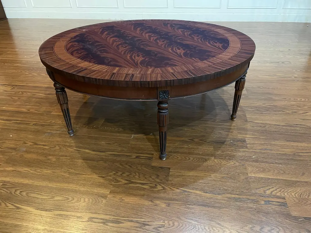 This is a made-to-order round traditional mahogany coffee table made in the Leighton Hall shop. It features swirly crotch mahogany and borders of straight grain mahogany and santos rosewood (Pau Ferro). It has six Sheraton inspired round fluted legs. It has a hand rubbed and polished semigloss finish. Available in various finishes.Dimensions: Diameter: 48 in.; Height: 18 in.
