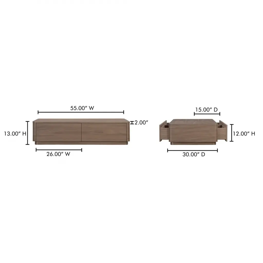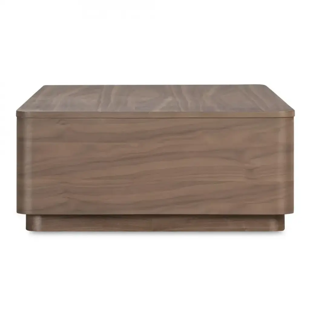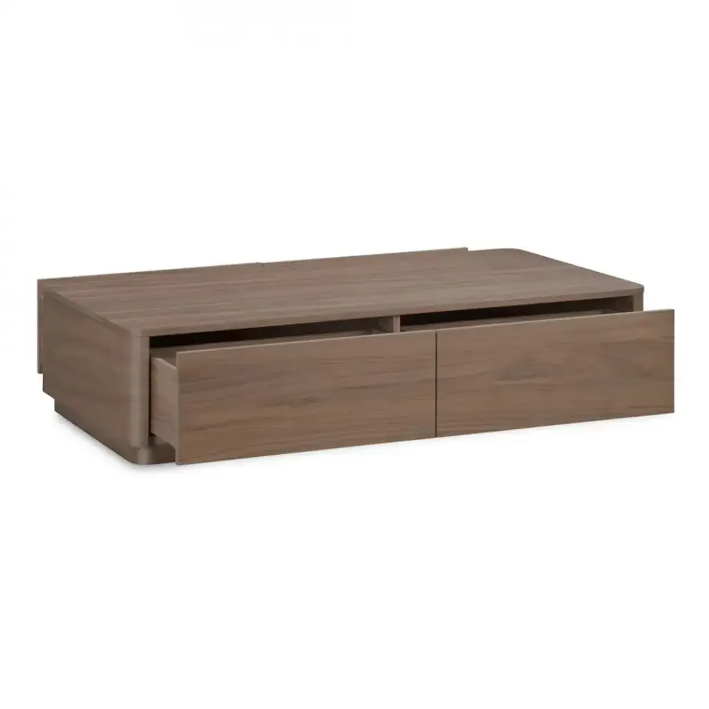 Natural allure meets minimalist design. The Round Off coffee table celebrates the captivating tones of natural wood grain, seamlessly integrated into a soothing design, embracing natural beauty and character. This coffee table boasts gently rounded corners and two large, push to open, smoothly gliding drawers that reveal generous storage space while embracing walnut's natural beauty and character.