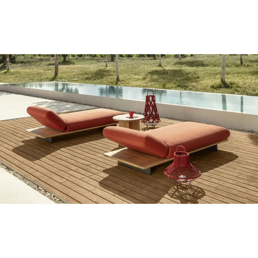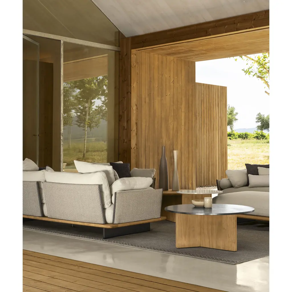 The Venice coffee table is defined by a monolithic design, which integrates naturally into the outdoor environment, thanks to the intrinsic charm of the materials. The solid wooden structure accoya supports the lava stone top, available in various colors, chosen to recall the warm shades at sunset and cold at dusk of the Venetian seas. The effect is made more evident by the polished ceramic finish of the stone and gives a romantic atmosphere to the outdoor living.