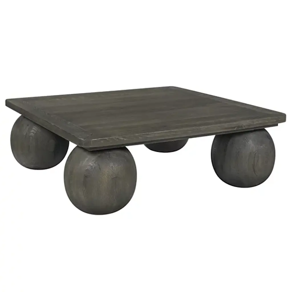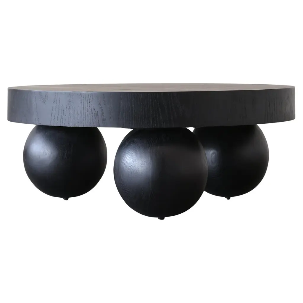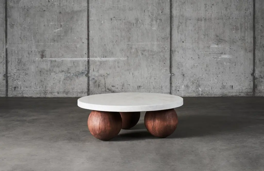 We love this table, the low look, the wooden orbs and the heavy stone. The wooden orbs are made out of solid beech wood that has been stained and oiled, the stone is a granit called Vraca with a nice warm beige tone. Please note that granite is a natural stone so every stone color is unique and can shift from light to darker beige. Measurements: Ø120 cm, H: 30 cm. (table top is 5 cm thick).