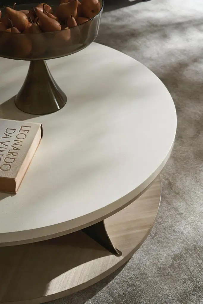 Understated yet elegant, this artful cocktail table is a celebration of materiality and simple form. Features an ample top in an Ivory Craze crackle finish, supported by a trio of Brushed Gold metal blades, perfectly distributed to create open space for storage and display. A swiveling plinth base adds intrigue and function.