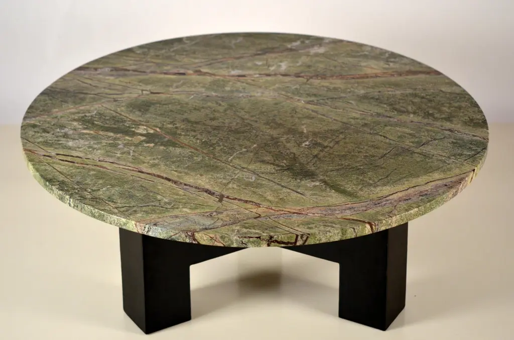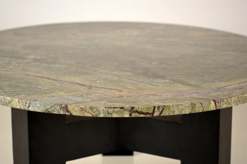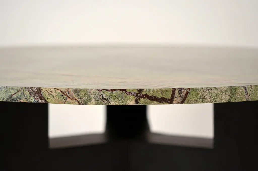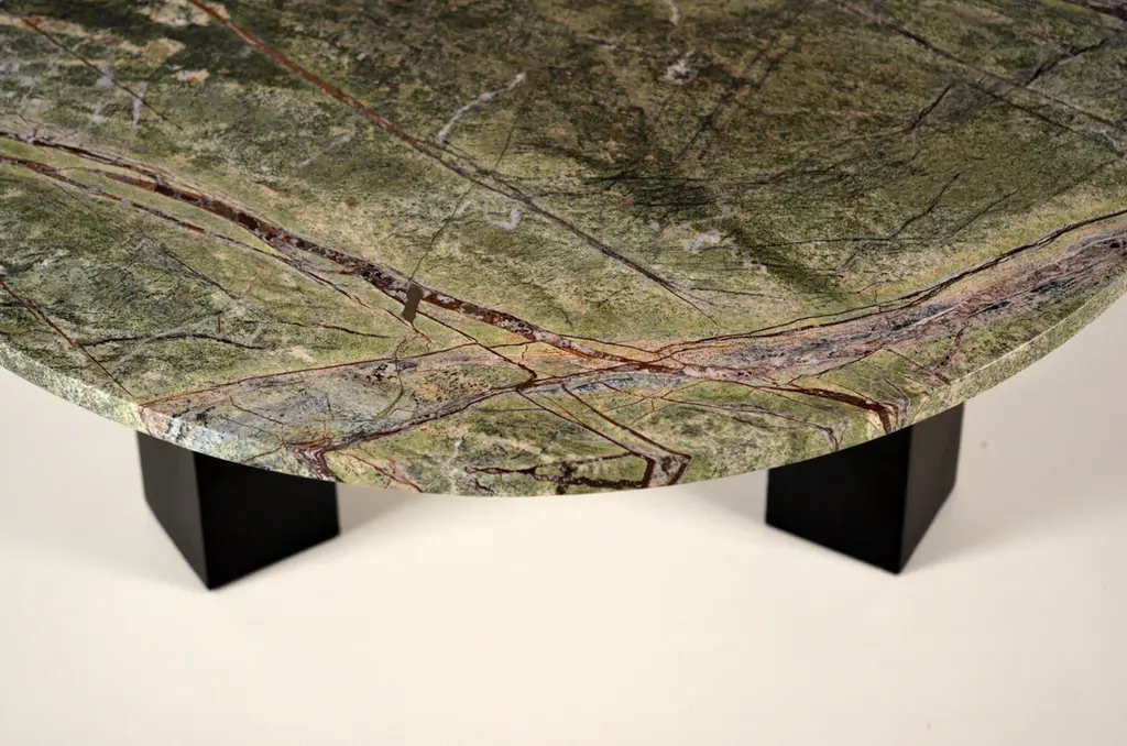 Round 'Upsilon' marble and blackened steel coffee table by Design Frères.Polished round rain forest green veined marble over a heavy matte black tripod steel base.Great focal point for any room.