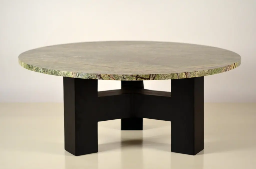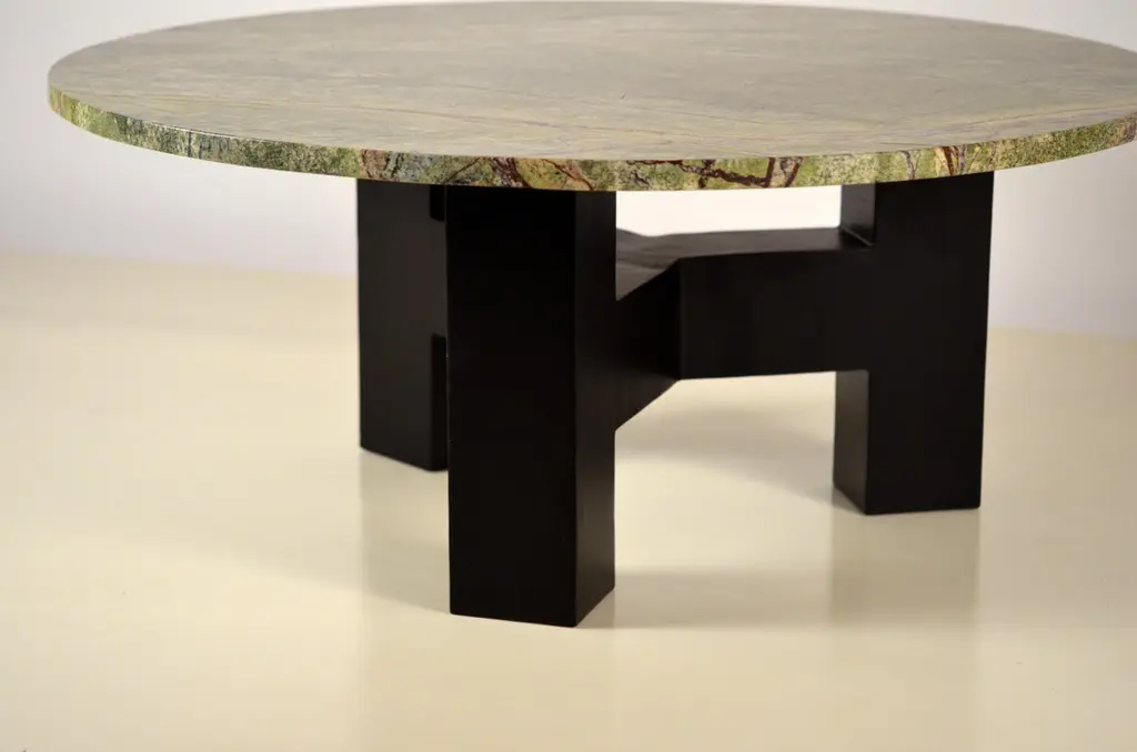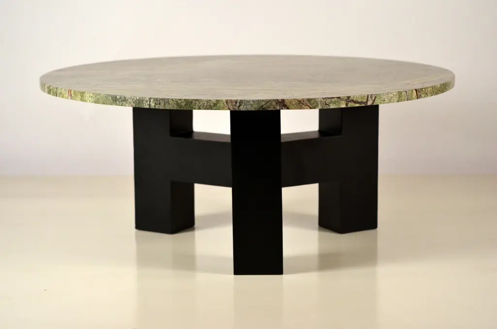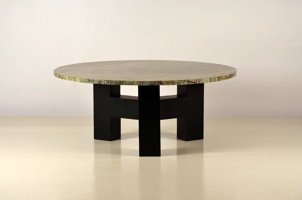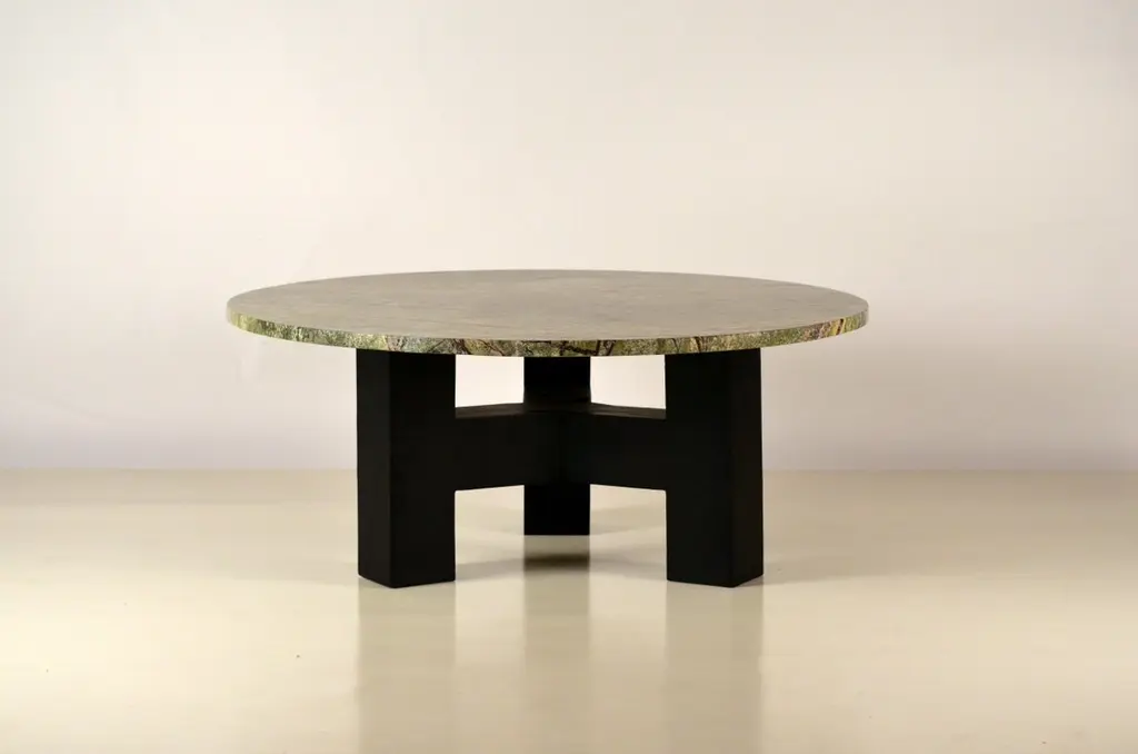 Round 'Upsilon' marble and blackened steel coffee table by Design Frères.Polished round rain forest green veined marble over a heavy matte black tripod steel base.Great focal point for any room.