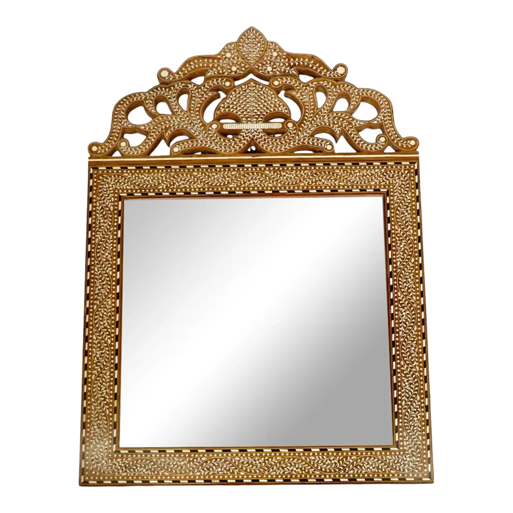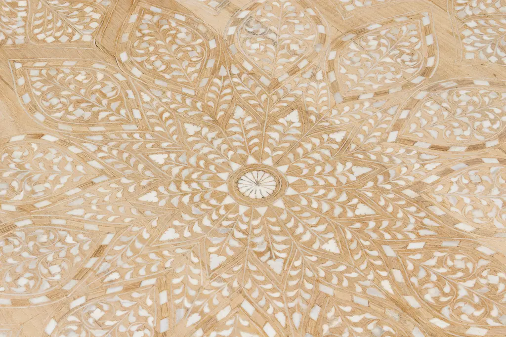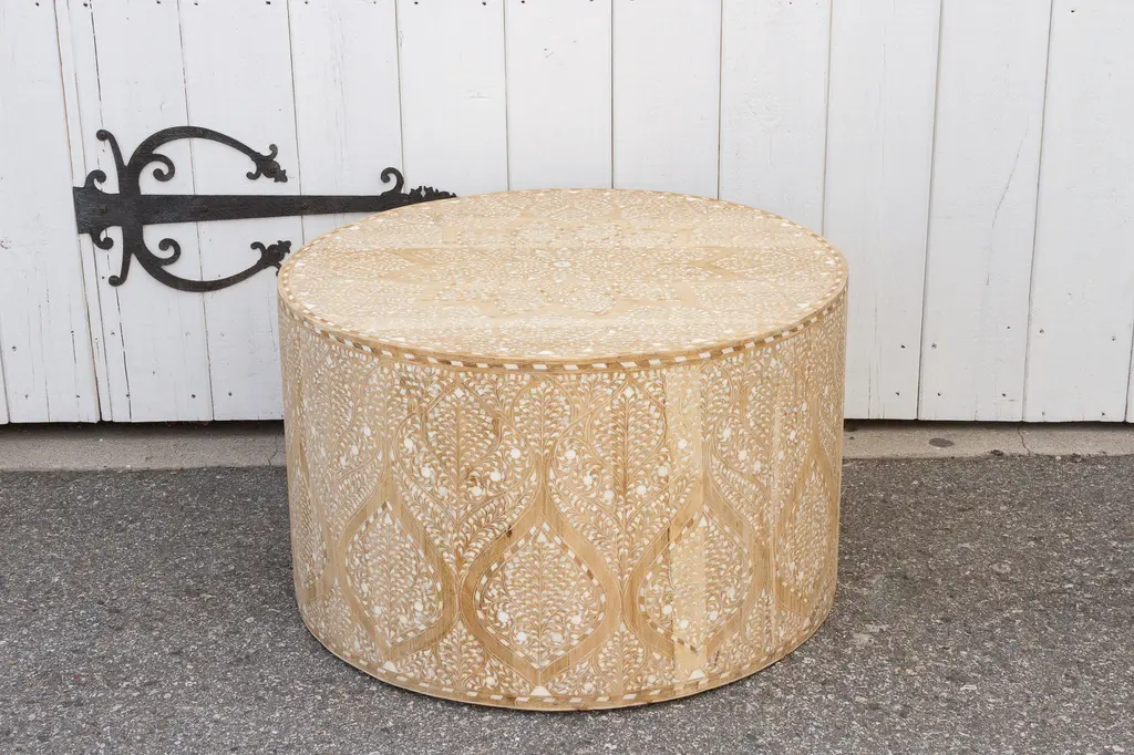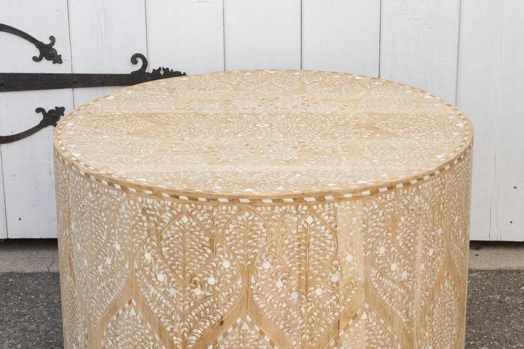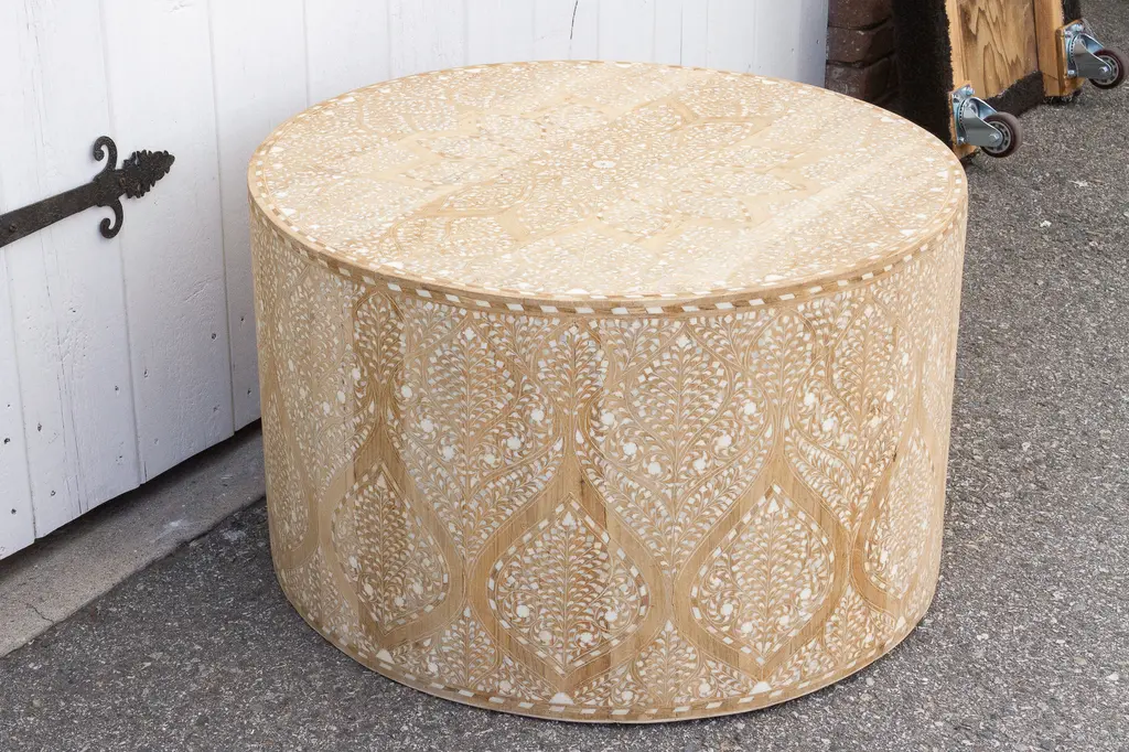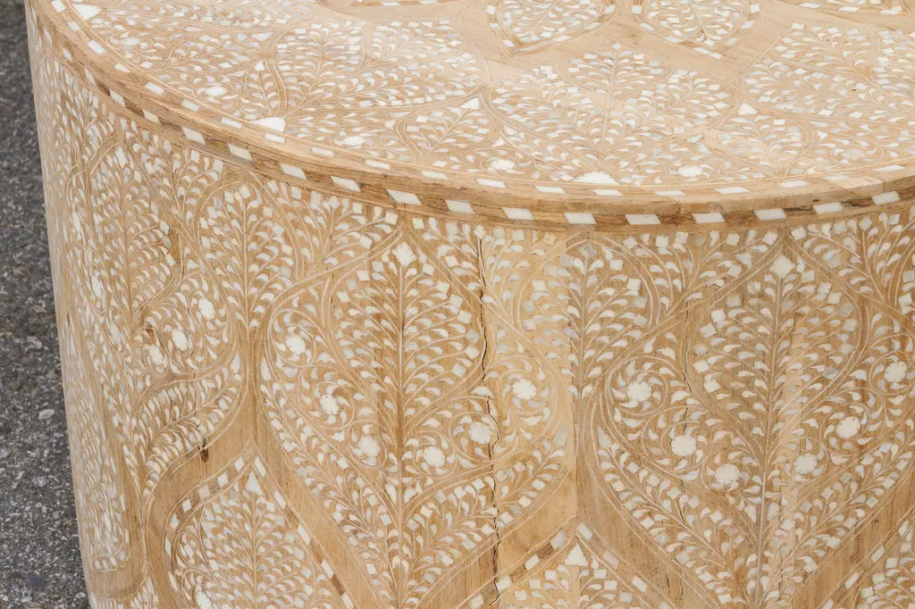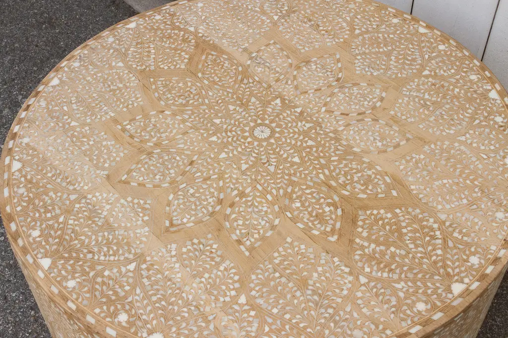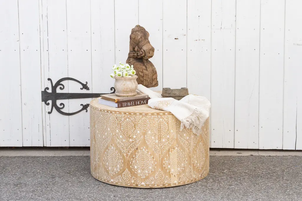 With a lovely organic feel, this round drum shaped coffee table features a raw bleached finish and is made from solid teak wood and is decorated all around with graceful inlay work. The top features a beautiful Moorish star and the side a fleur de lys motif which repeats on all sides.