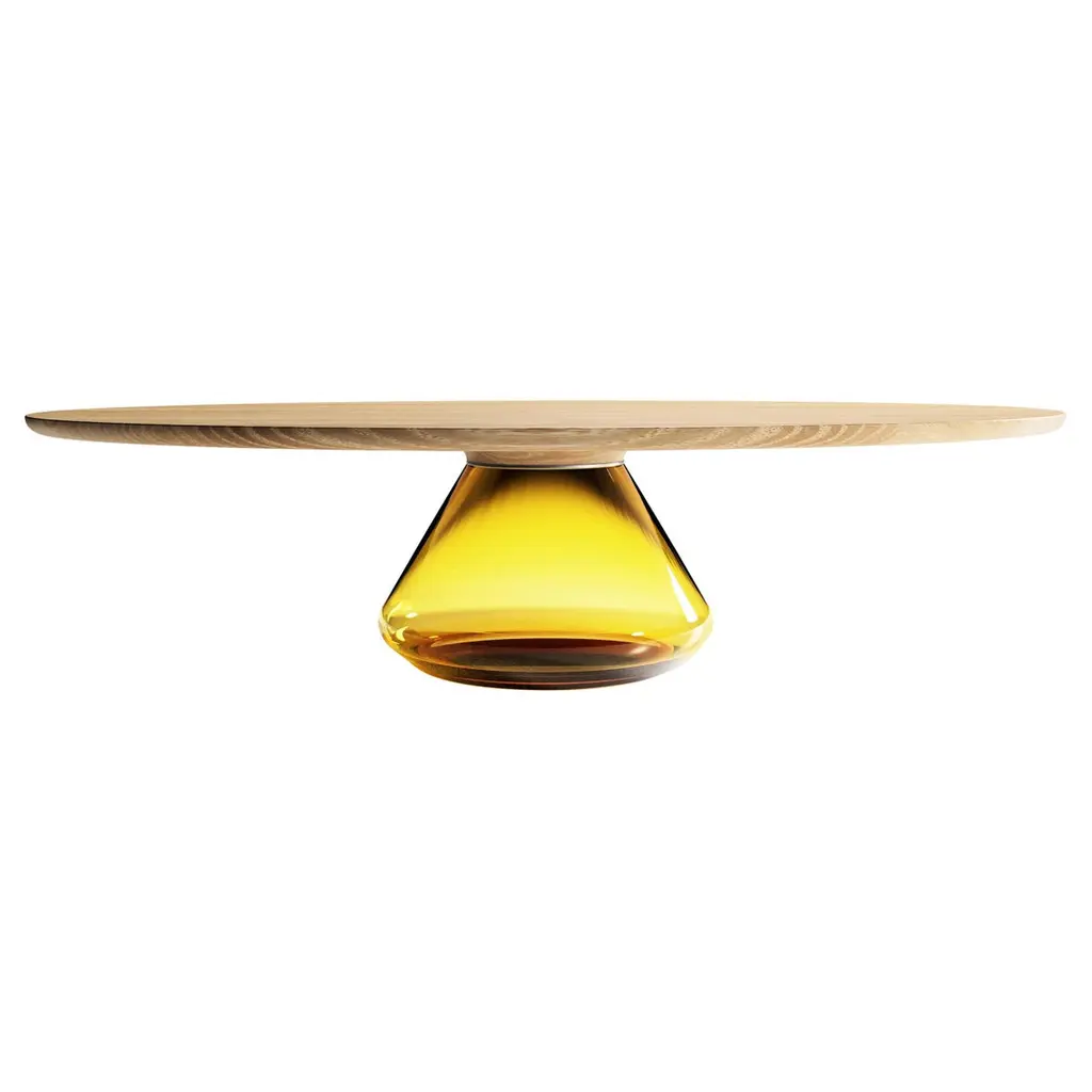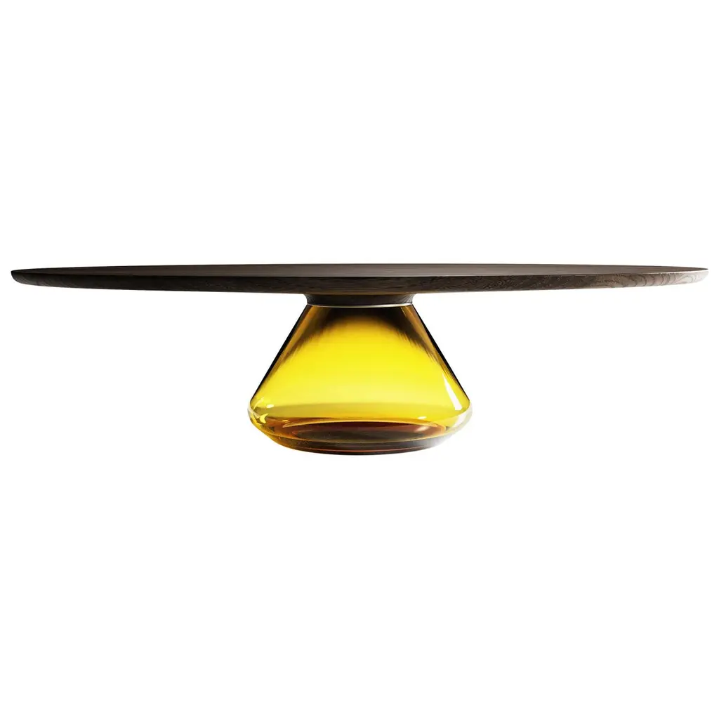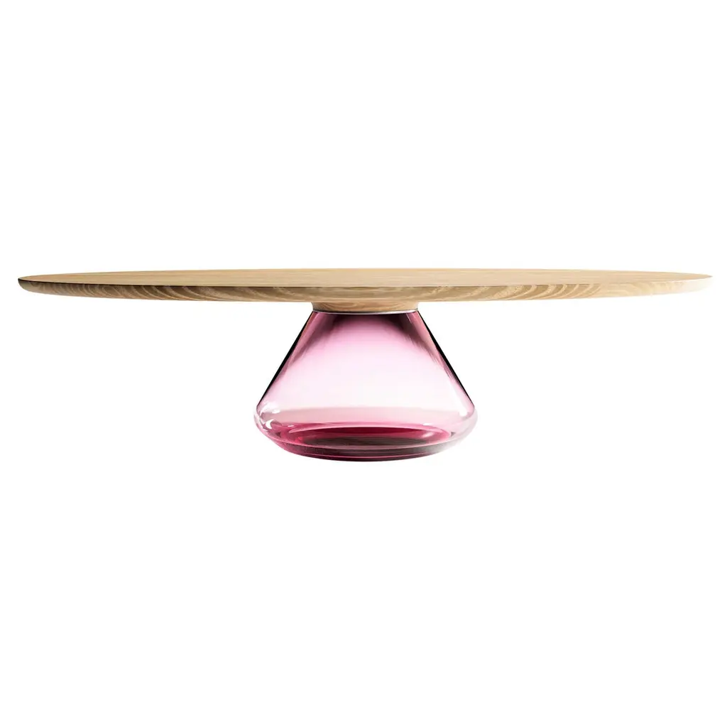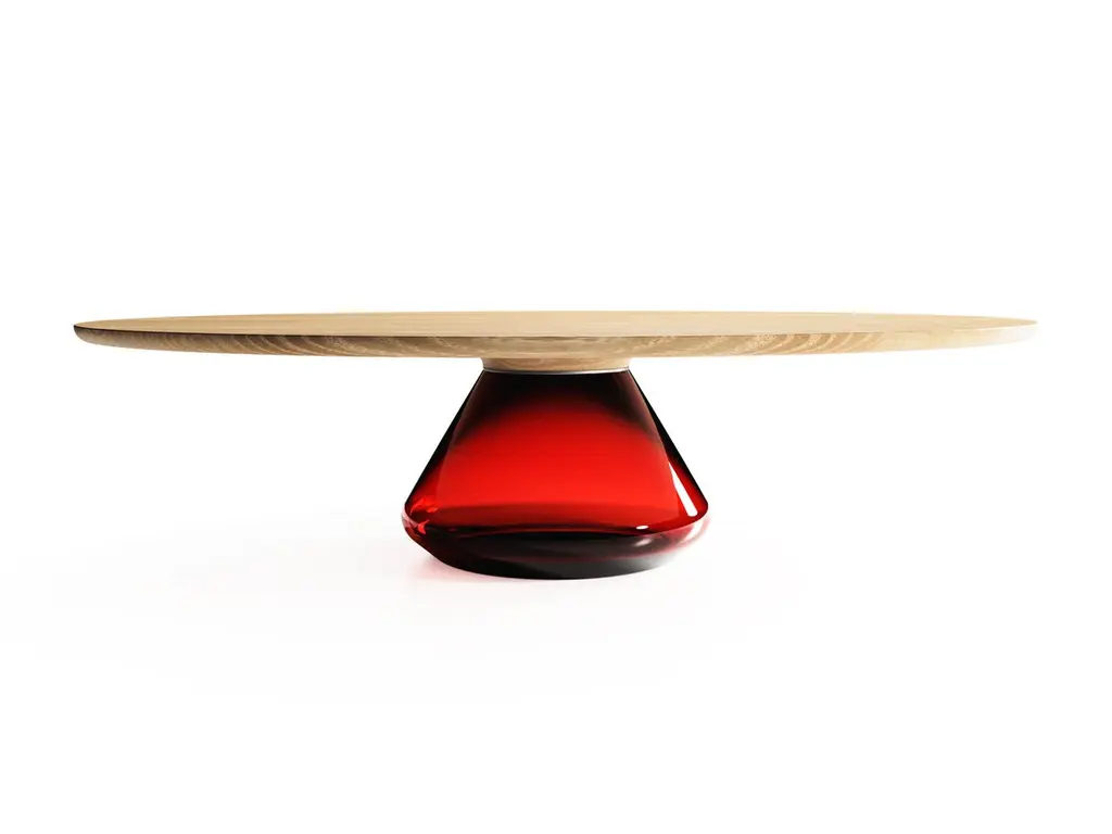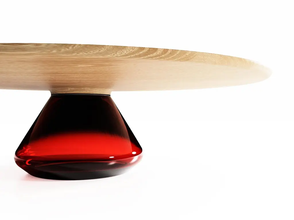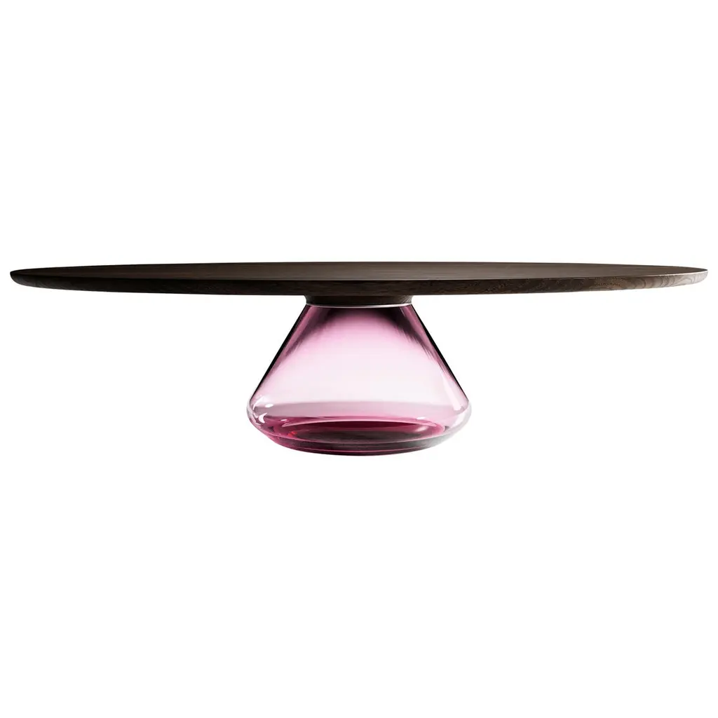 The ruby Eclipse I, limited edition coffee table by Grzegorz MajkaLimited edition of 8Dimensions: 54 x 48 x 14 inMaterials: glass, oakThe total eclipse of every interior? With this amazing table everything is possible as with its Minimalist style it will definitely eclipse all things around, spreading its hidden beauty. Focusing on arresting things not seen from the very first perspective inspired to create the piece of work called The Eclipse. When finally noticed attracting all the recipients by its unique form.New application and new ideas? Why not to use the glass but the other way round as it is typically done with Classic tables, glass top and the glass base?As a result of this idea we can admire the solid and beautiful tempered smoked glass top sustained by glamorous handmade glass base. When joined together the exclusive and elegant coffee table came to light.Grzegorz Majka is a self-taught Polish artist who explores the concepts of modularity, sculptural form, and artisanal processes in the design of furniture and lighting. His work seamlessly blends craft and contemporary design, incorporating high-quality noble materials like natural stone, wood, metals, and hand-blown glass. Guided by a deep respect for the inherent character of materials, Grzegorz highlights natural irregularities, textures, and patterns - veins in stone, the living patina of untreated metals, the organic feel of brushed surfaces. These elements are not hidden but embraced, inviting collectors on a sensory journey through touch and time.His studio practice focuses on handcrafted limited-edition furniture that is not only functional, but also living, authentic, collectible art.