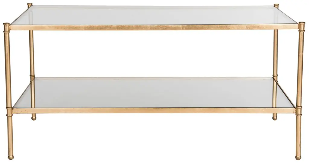Crafted with an iron frame and two glass shelves, this sleek coffee table blends with any style of decor. Ball feet and a gleaming golden finish deliver elegant appeal.