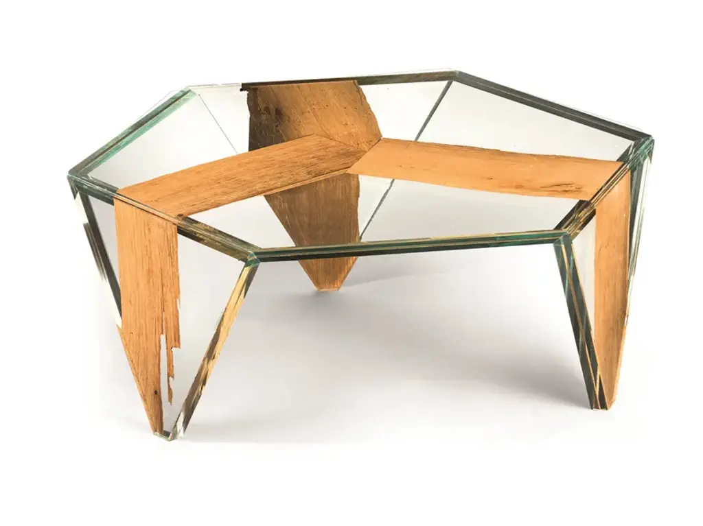 RUCHE VENEZIA is an modern and elegant glass and wooden coffee table, part of Glass&Wood collection by VG, characterized by a hexagonal shape that makes possible to match other Ruche coffee tables, in order to create original and different geometric solutions.Made of two layers of glass containing thin sections of briccola, the durmast and oak pole that for a thousand years have guided boats along the navigable parts of the Venice lagoon. The table top is combined with the three legs thanks to a special glue with very high resistance, giving homogeneity and linearity of the entire structure.