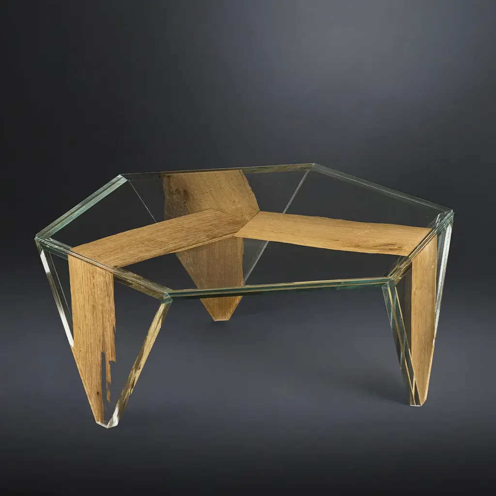 This exquisite piece is part of Ruche series of hexagonal coffee tables and it can stand alone or it can be combined with other tables from the same series. Its striking appearance is made of two layers of glass containing three sections of briccola, the durmast oak and oak wood poles that were placed in the Venice Lagoon for a thousand years to guide boats. Part of the Glass&Wood collection, this piece can be combined with other coffee tables in the collection for a striking effect.