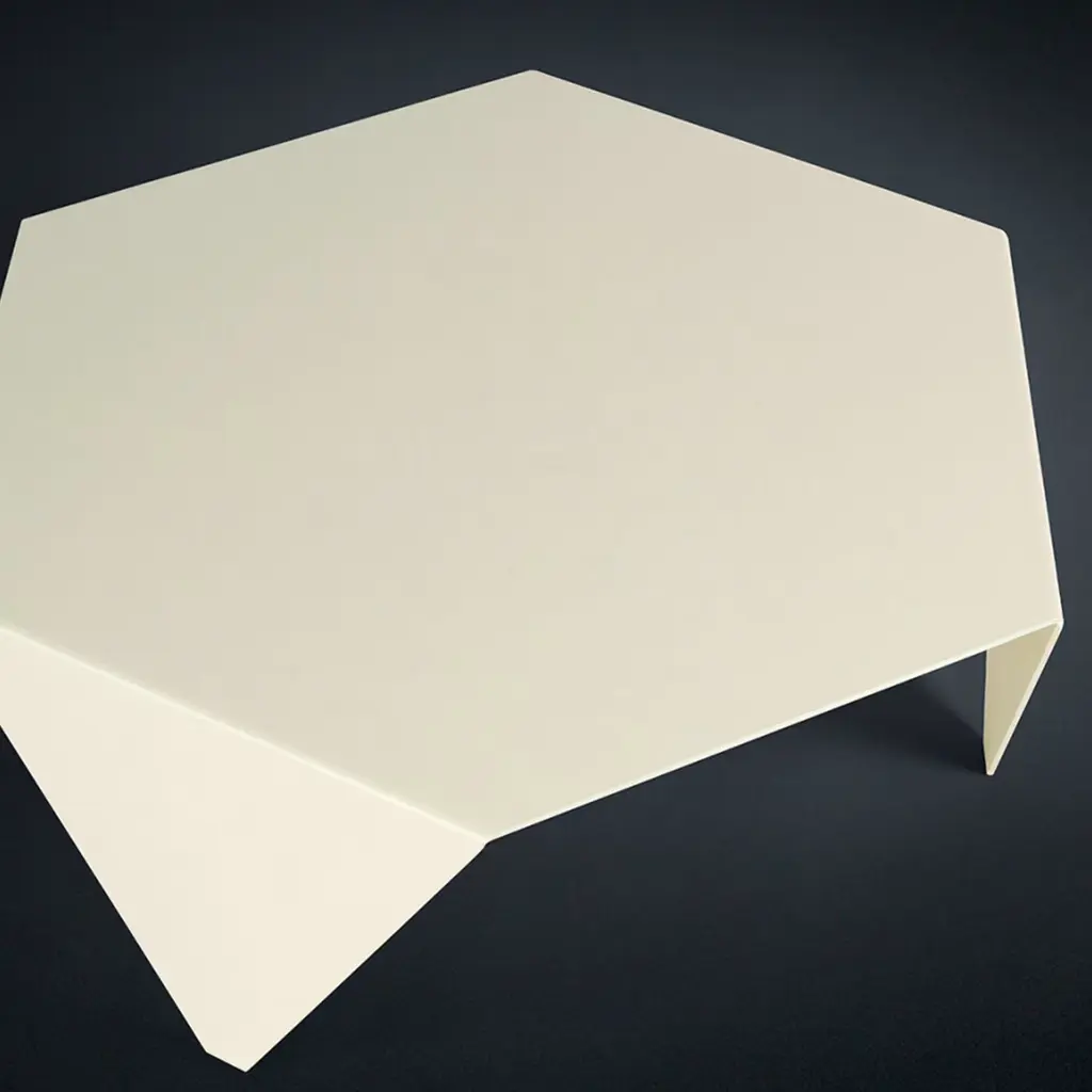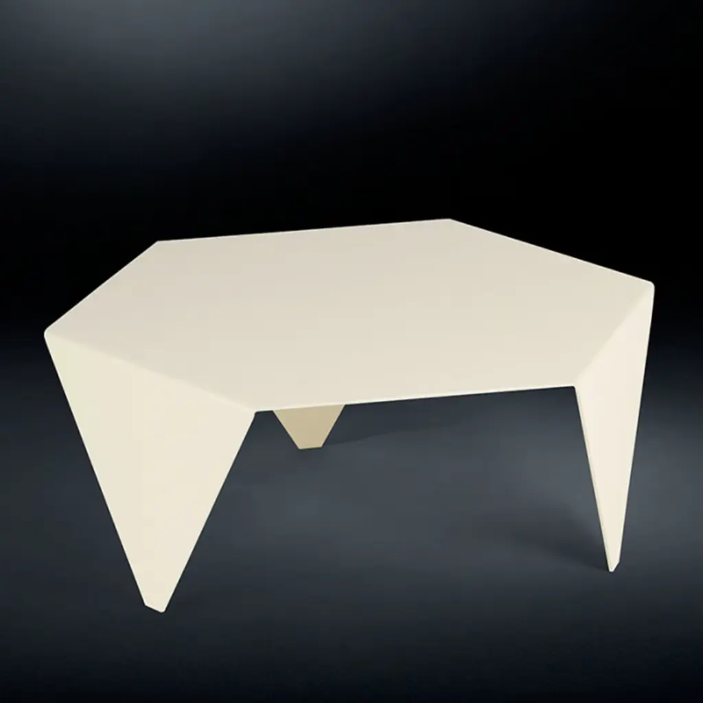A modern and elegant design of bold geometric value, this coffee table features a hexagonal shape resting on three triangular legs as if it was a gently unfolded piece of paper. Ideally combined with others from the same series for a lively and inventive composition, it is handmade of white-lacquered metal.