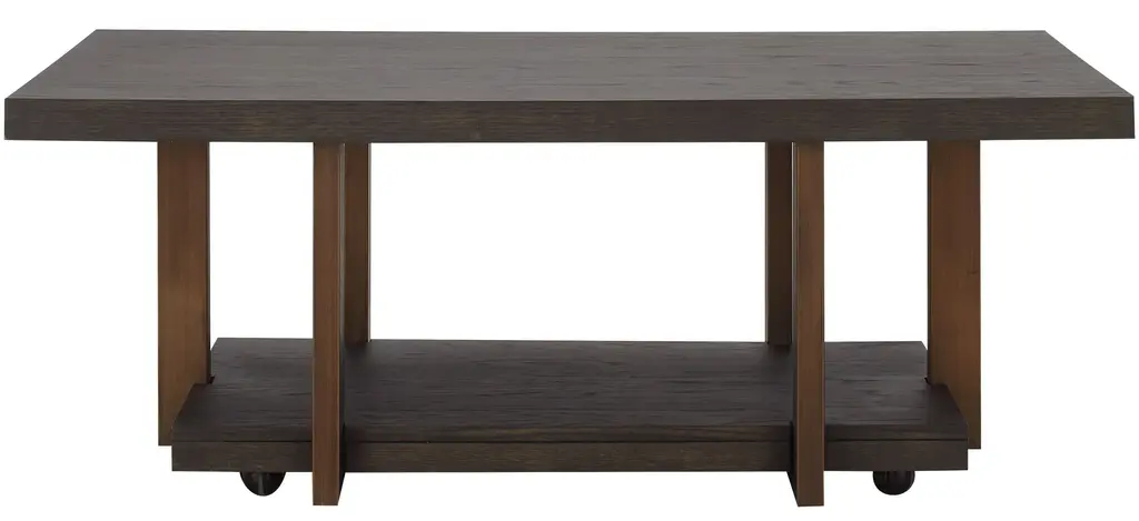 Orren Rectangular Cocktail table has one drawer with rustic bronze oversized drawer handles, bottom shelf for storage. Metal ball bearing side glides. Exterior double rustic bronze steel leg detail. Finish: Grayed birch / rustic bronze. Material: MDF, steel .COO: Vietnam.