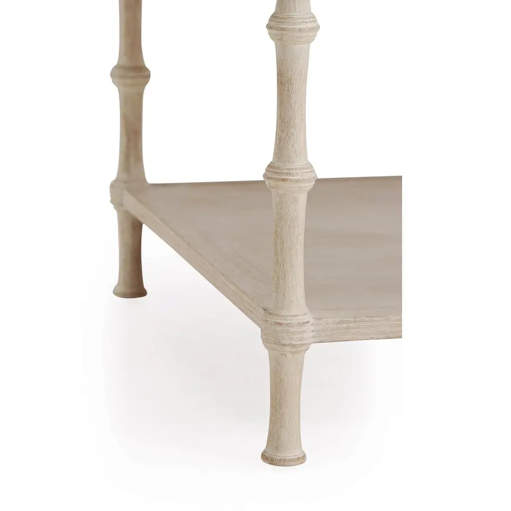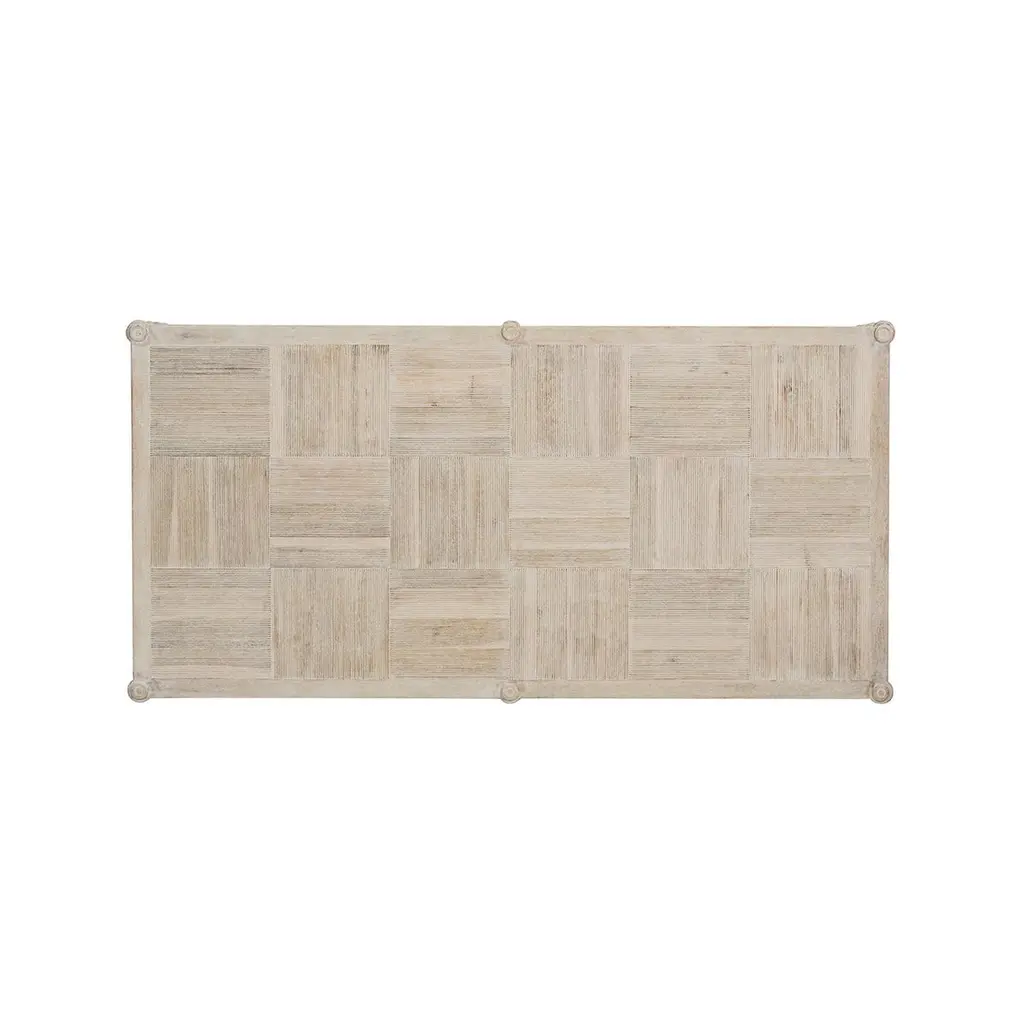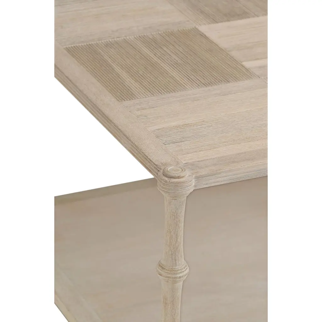 Its two-tier structure showcases a striking patchwork top of acacia wood, meticulously crafted in a parquetry board pattern reminiscent of historic flooring. The washed acacia finish enhances the natural beauty of the wood grain, lending a soft, organic feel to any space.This transitional-style coffee table features a reeded edge that adds texture and depth, while the engaged lower shelf provides ample space for storage or display. Dimensions: 55" W x 27.625" D x 20" H