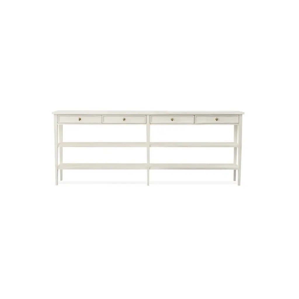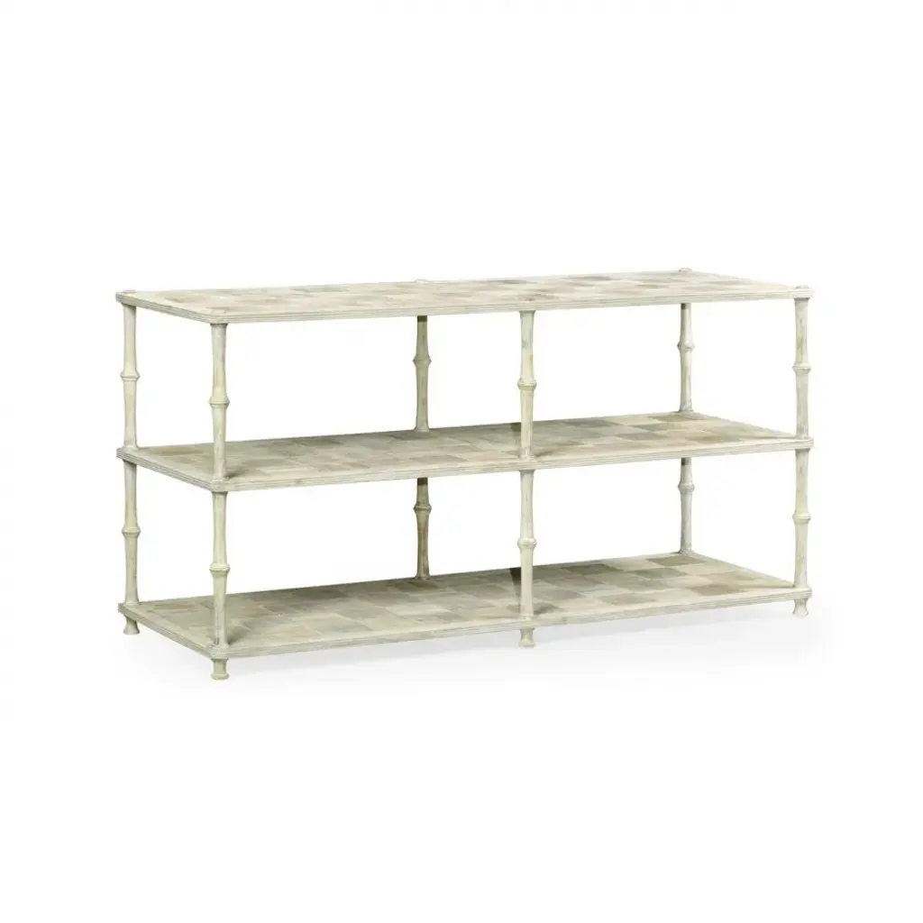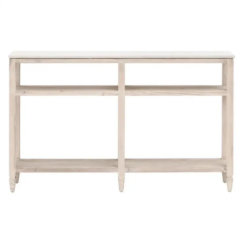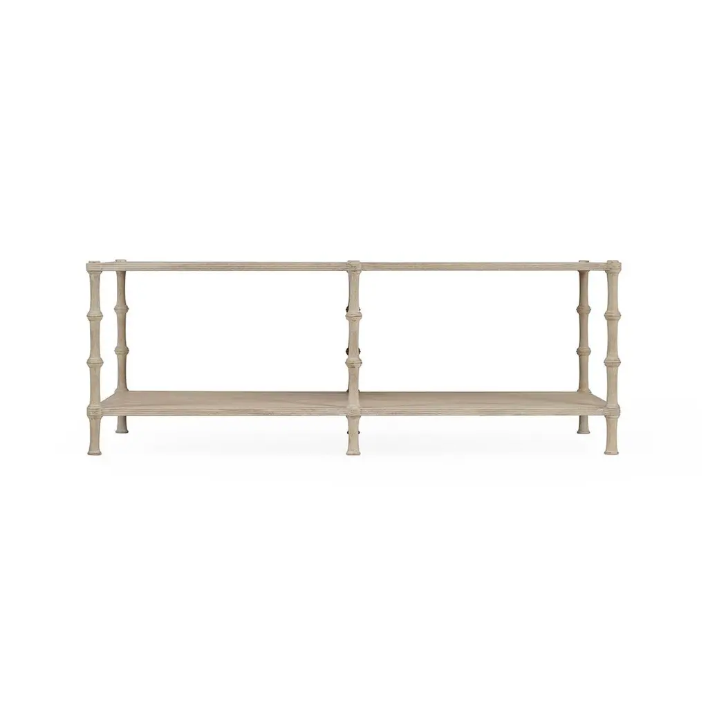 Its two-tier structure showcases a striking patchwork top of acacia wood, meticulously crafted in a parquetry board pattern reminiscent of historic flooring. The washed acacia finish enhances the natural beauty of the wood grain, lending a soft, organic feel to any space.This transitional-style coffee table features a reeded edge that adds texture and depth, while the engaged lower shelf provides ample space for storage or display. Dimensions: 55" W x 27.625" D x 20" H