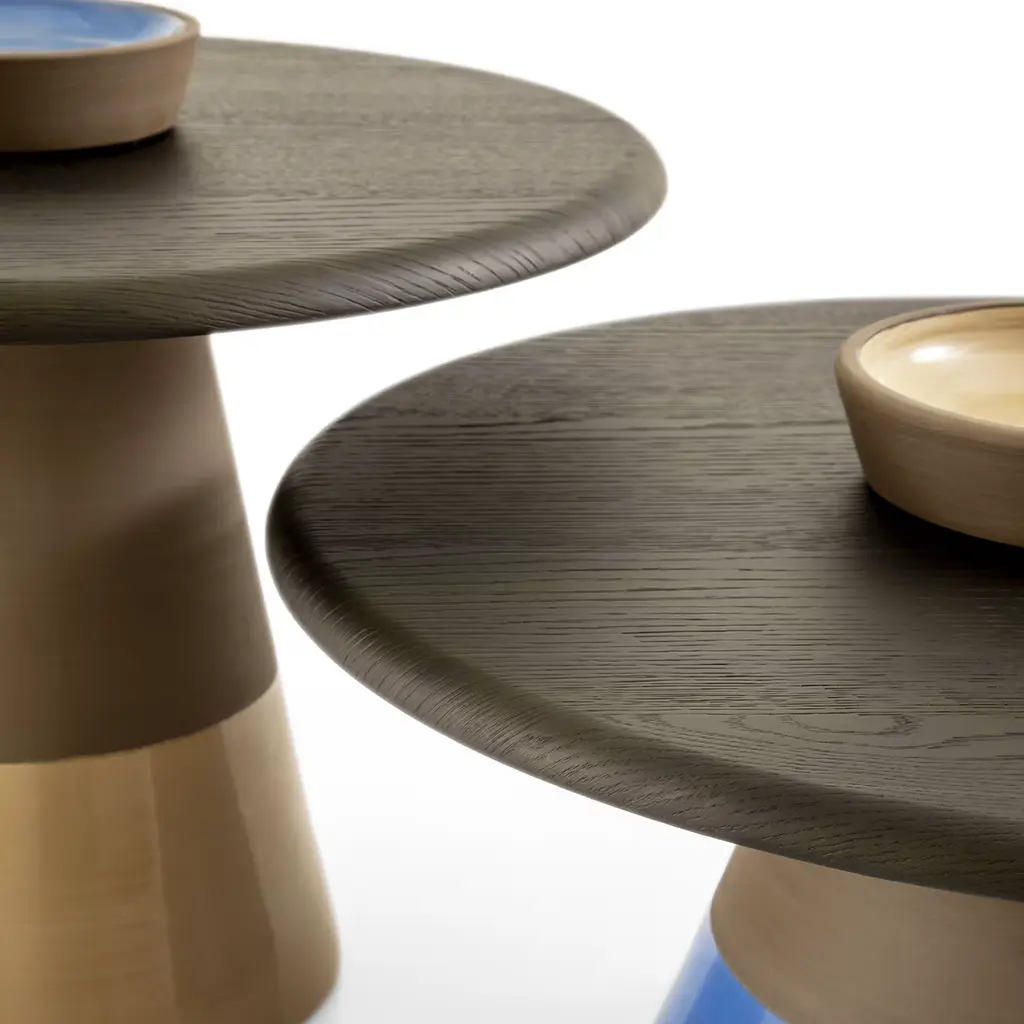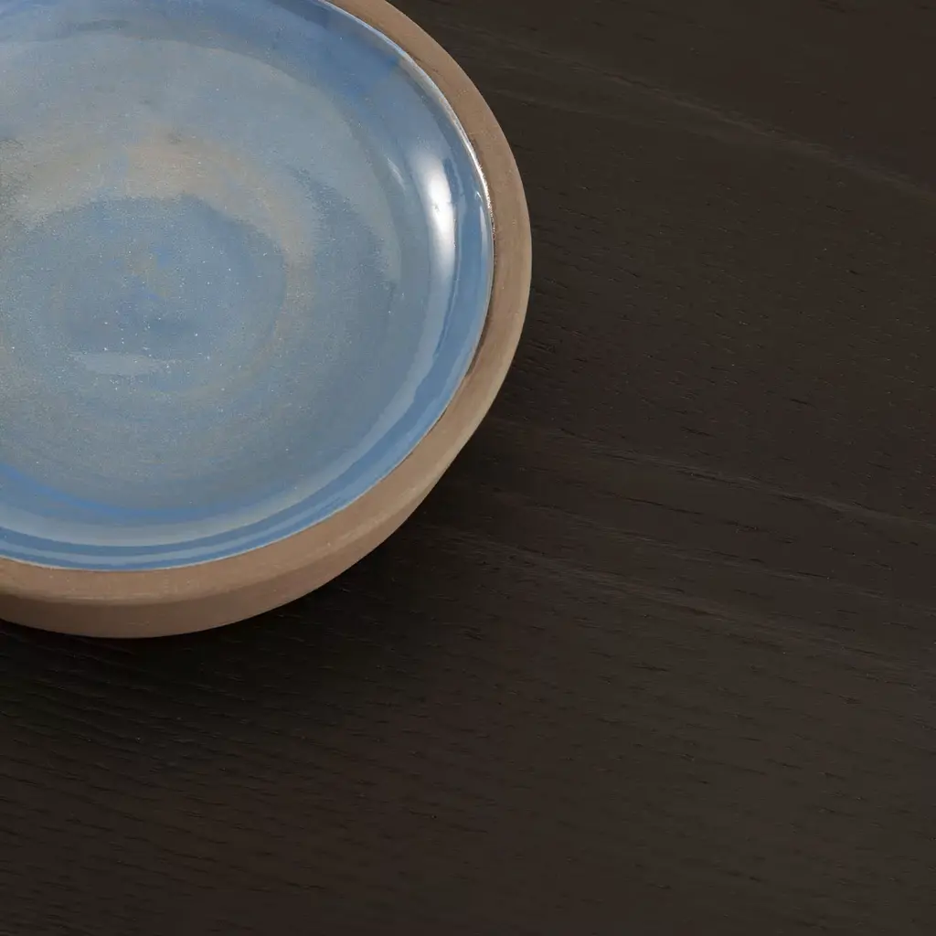 Distinguished by its natural dark earth terracotta base spun on the wheel, this living room coffee table features a glossy Dove Gray enamel insert. Its top is crafted from MDF oak veneer in Laguna oak and finished with membrane pressing. An integrated terracotta storage compartment, internally glazed in glossy Azure, adds both functionality and elegant detail to this sophisticated centerpiece for any modern home.